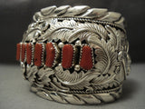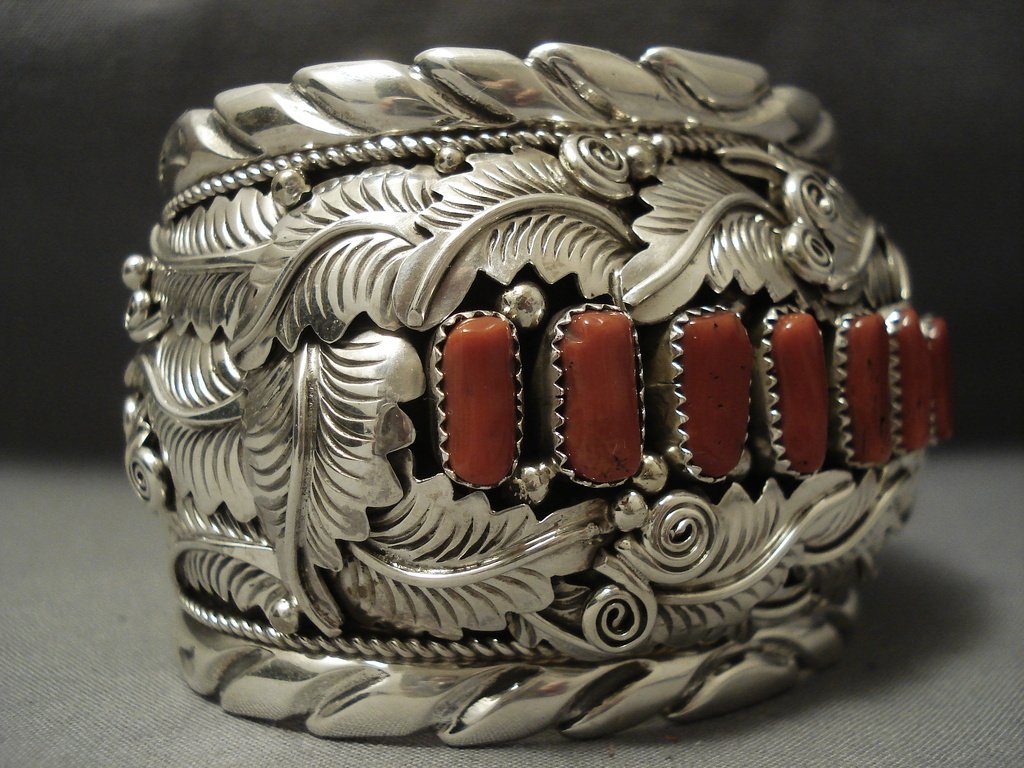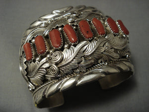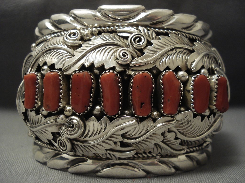 Opulent Modernistic Navajo Chunk Coral Native American Jewelry Silver Garden Sterling Bracelet