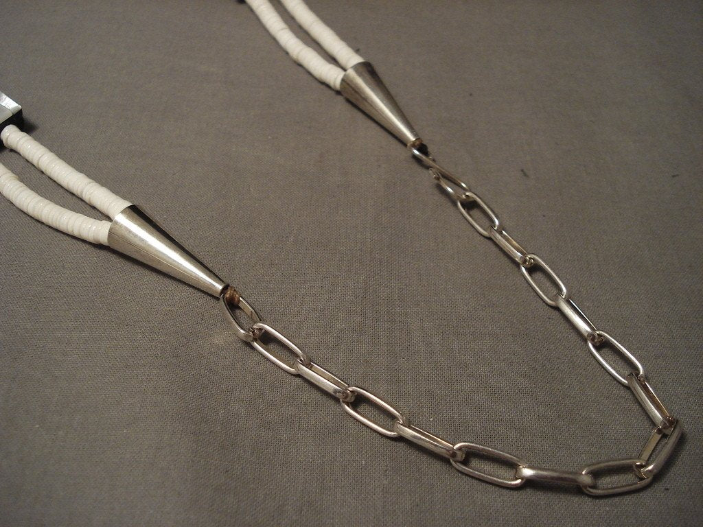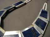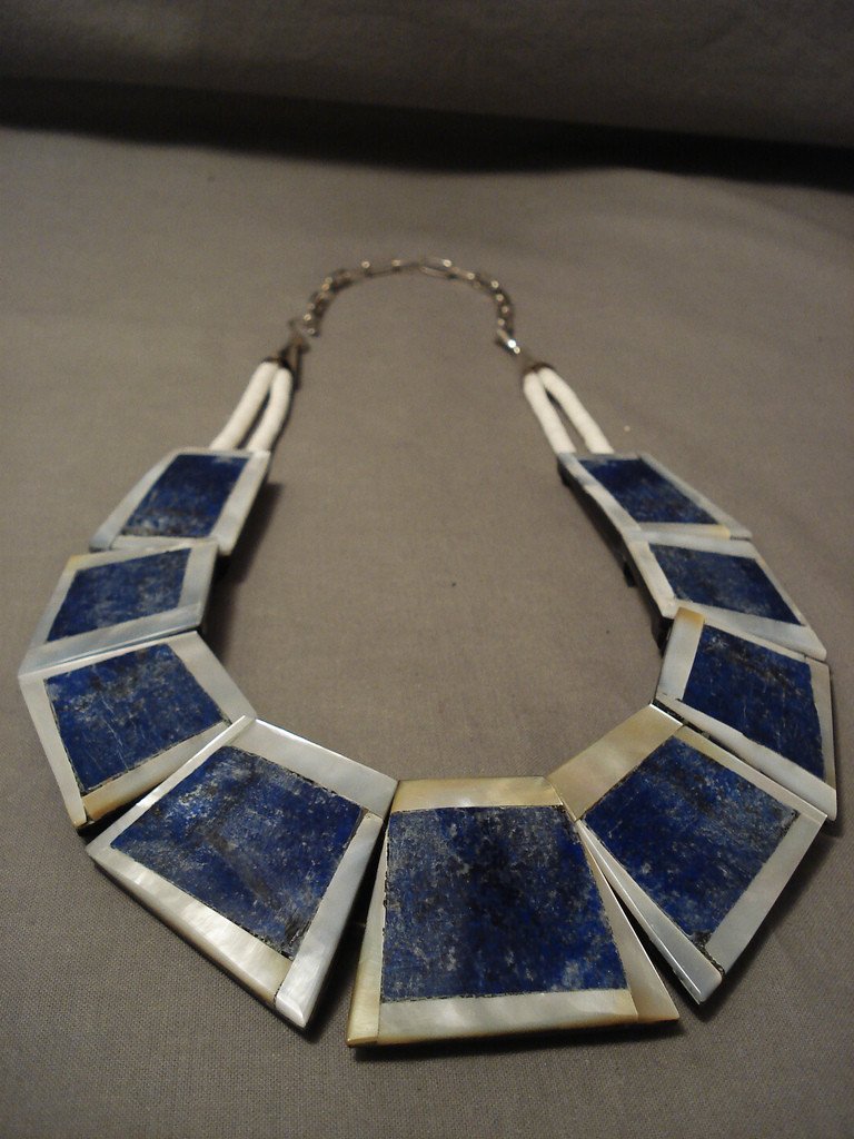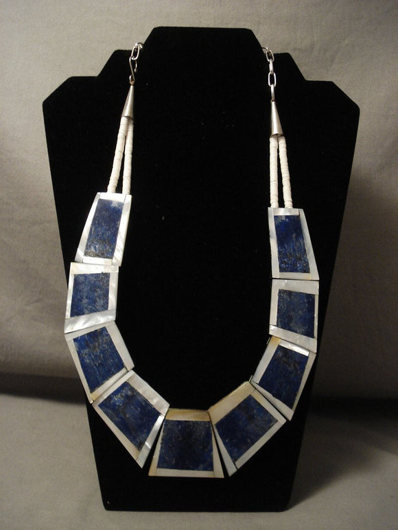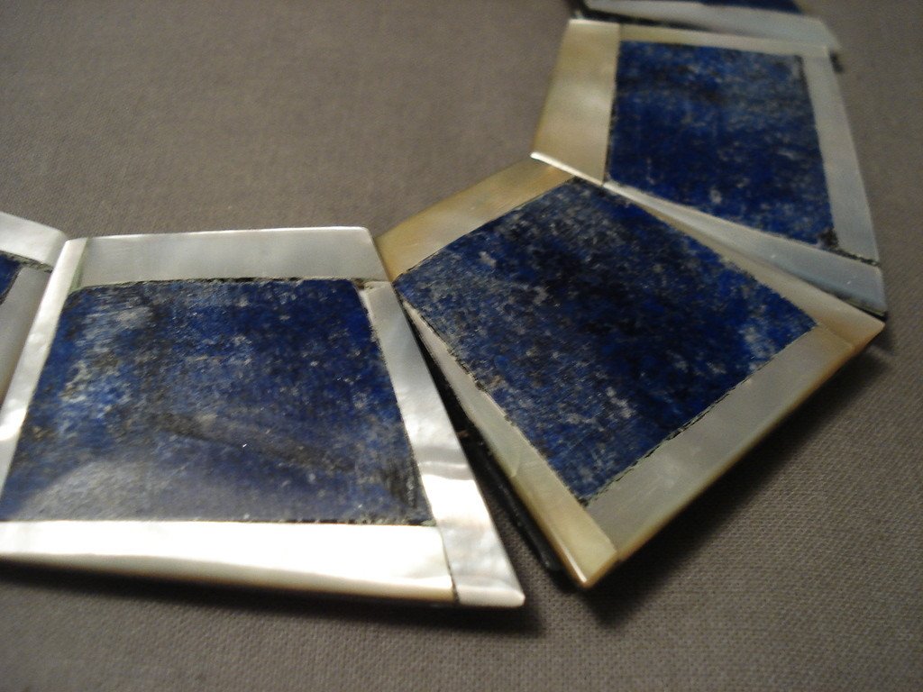This is an impressive vintage Santo Domingo museum quality lapis lazuli necklace. This mind blowing necklace contains some of the largest lapis lazuli stones we have ever seen on a necklace with beautiful surrounding mother of pearls. Resting on the ends of the necklace are amazing white shell heishi with accenting silver cones. This necklace consists of a stunning handmade silver link chain that can be adjusted if desired. The back of the necklace is jet stone, which is a soft real stone, NOT PLASTIC. Sterling silver. Cir. Late 20th century . The length of the necklace measures around 26". Sturdy 129 grams. LAYAWAYS- We are happy to work with you and are more flexible than anyone on the net. Simply send us an email for more information.