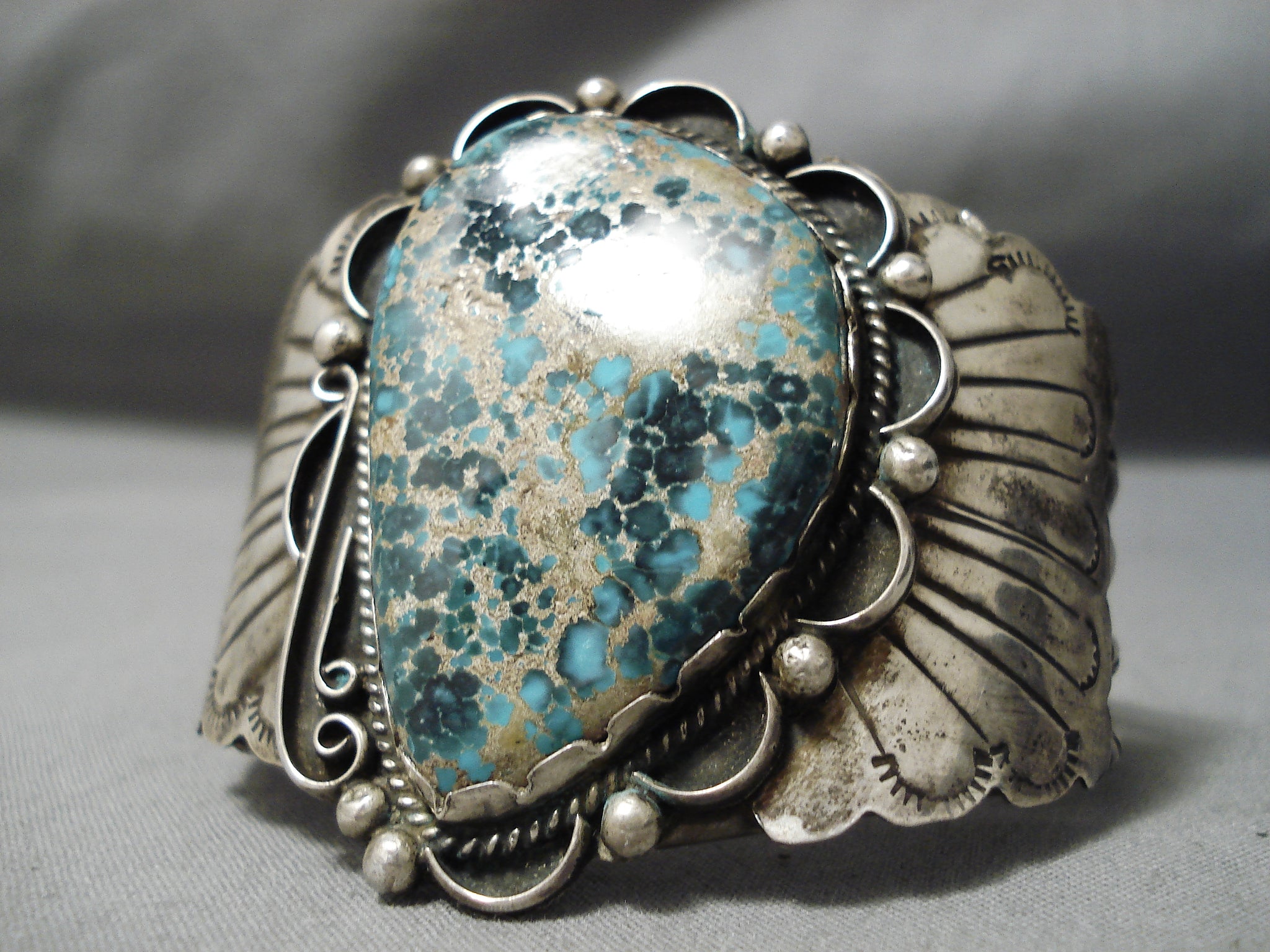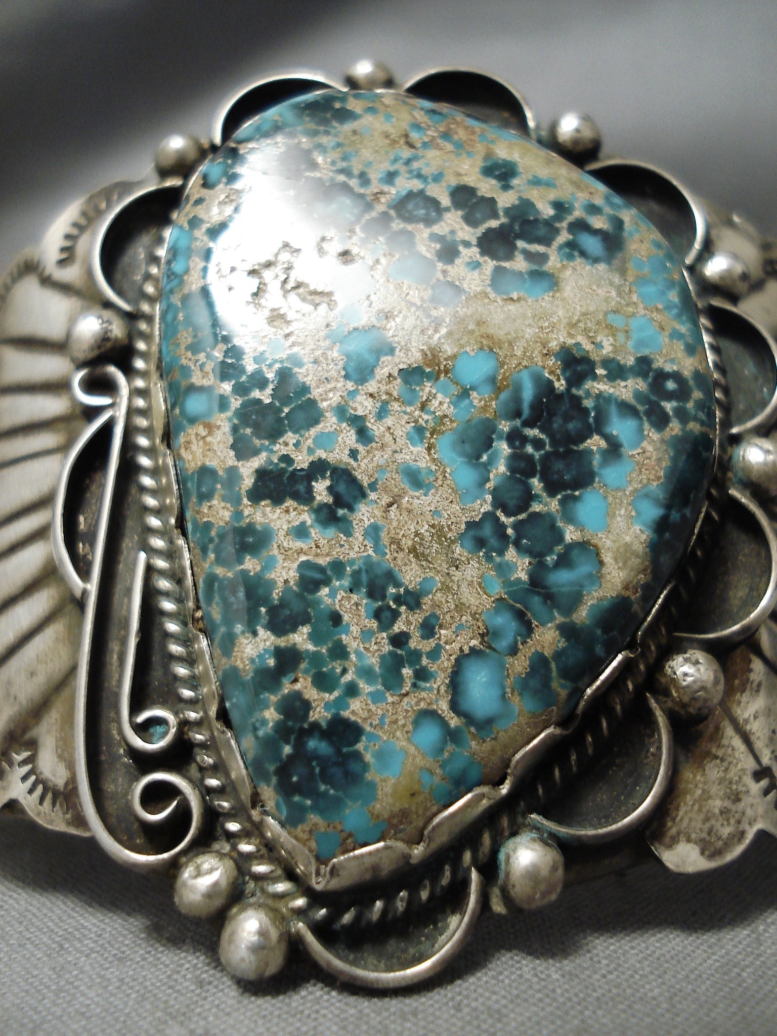 Opulent Vintage Native American Navajo #8 Turquoise Sterling Silver Flank Bracelet Old