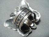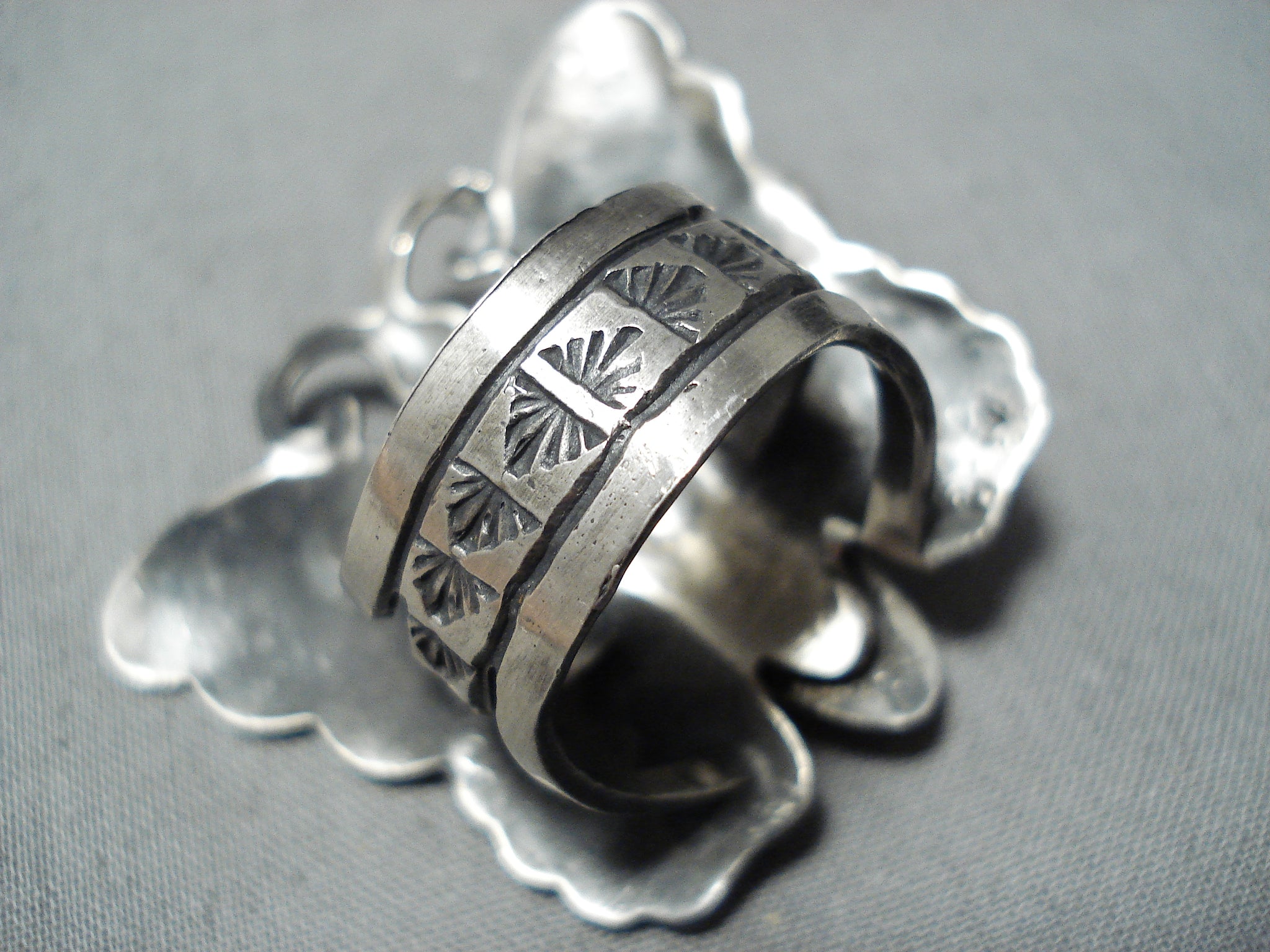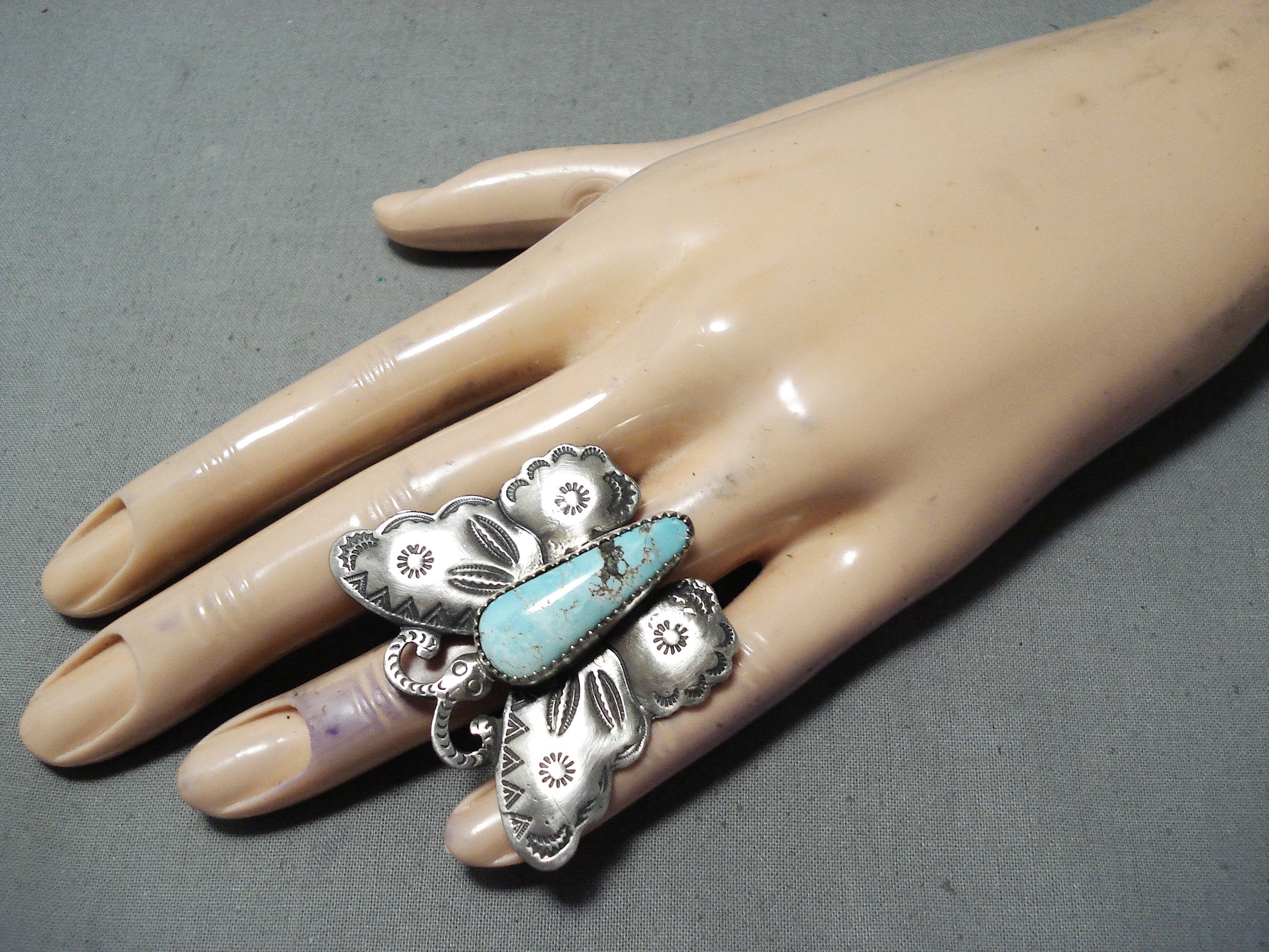 Up for sale is this remarkable Navajo silver ring. This huge peaceful handstamped butterfly ring becomes a dimensional wonder - with the beautiful turquoise stone set at the middle! It has a wide triple rail band. The center stone measures around 1" x 3/8". The ring face measures around 1-1/2" x 1-3/4". Signed by Navajo artist, Curt John. The ring size is around 9. Sterling silver, marked. Sturdy 20 grams.