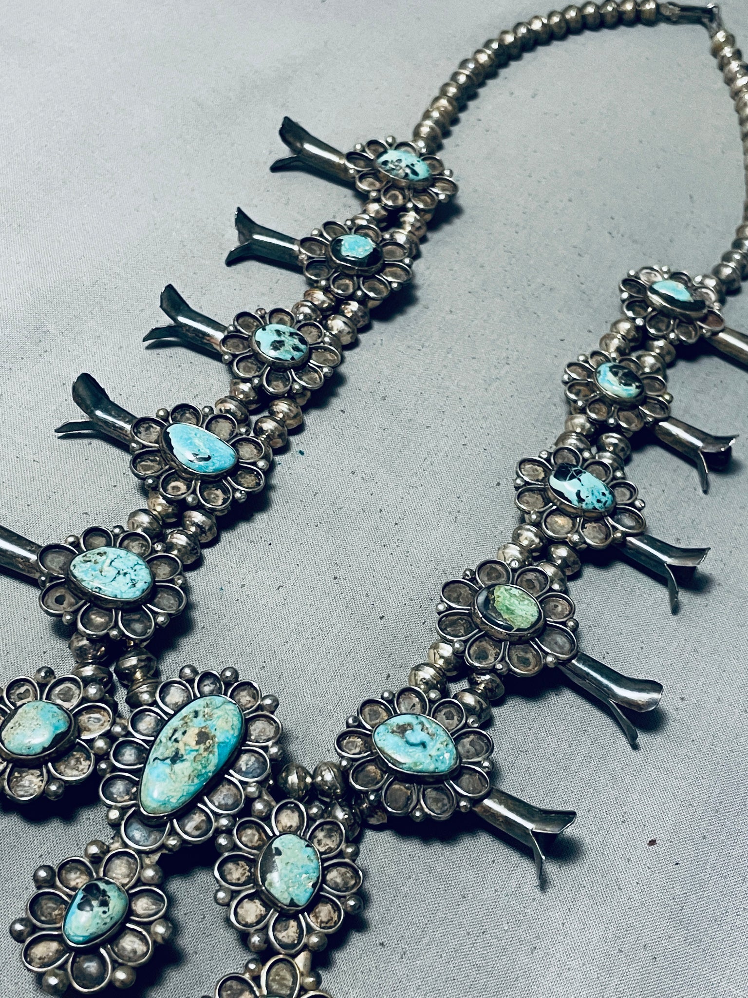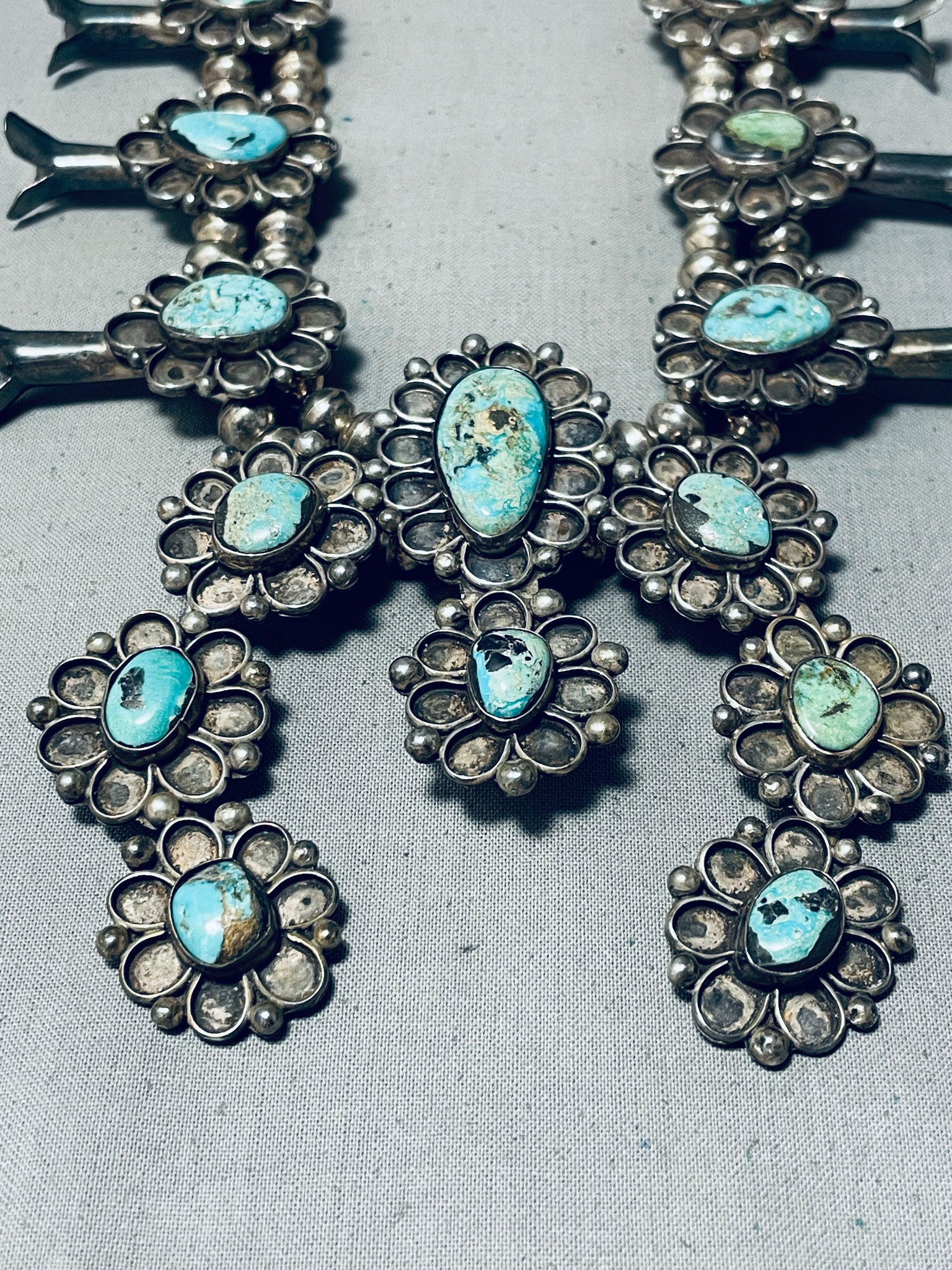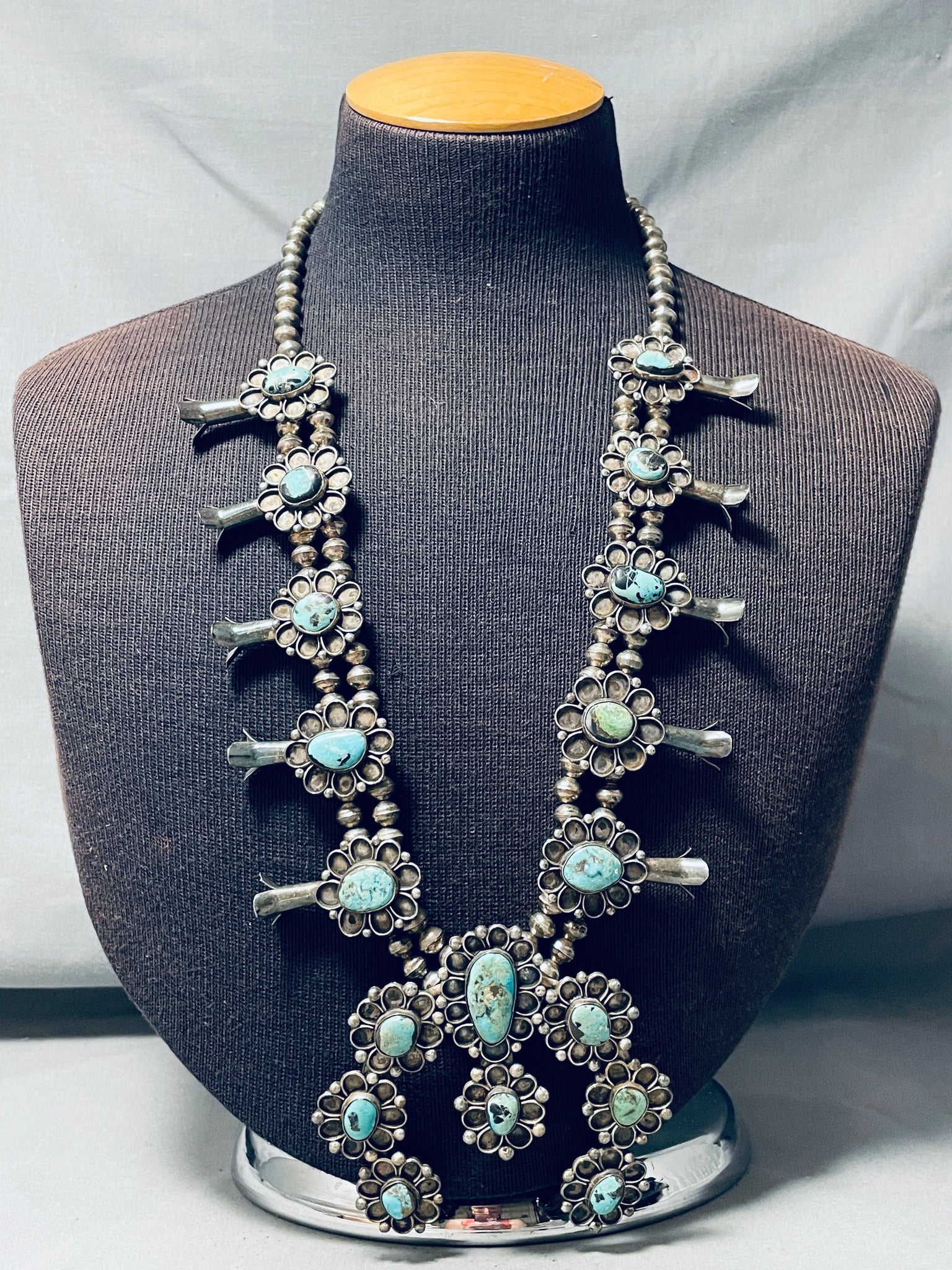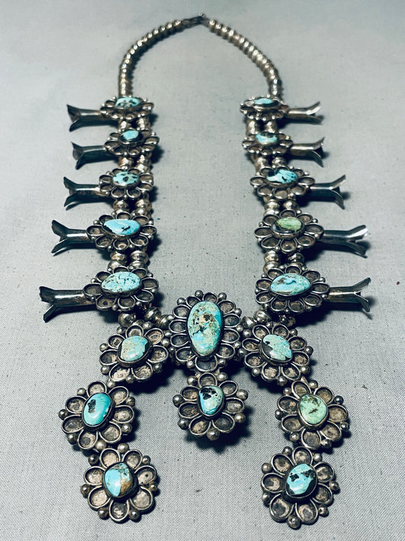 Powerful Womens Vintage Native American Navajo Turquoise Sterling Silver Squash Blossom Necklace