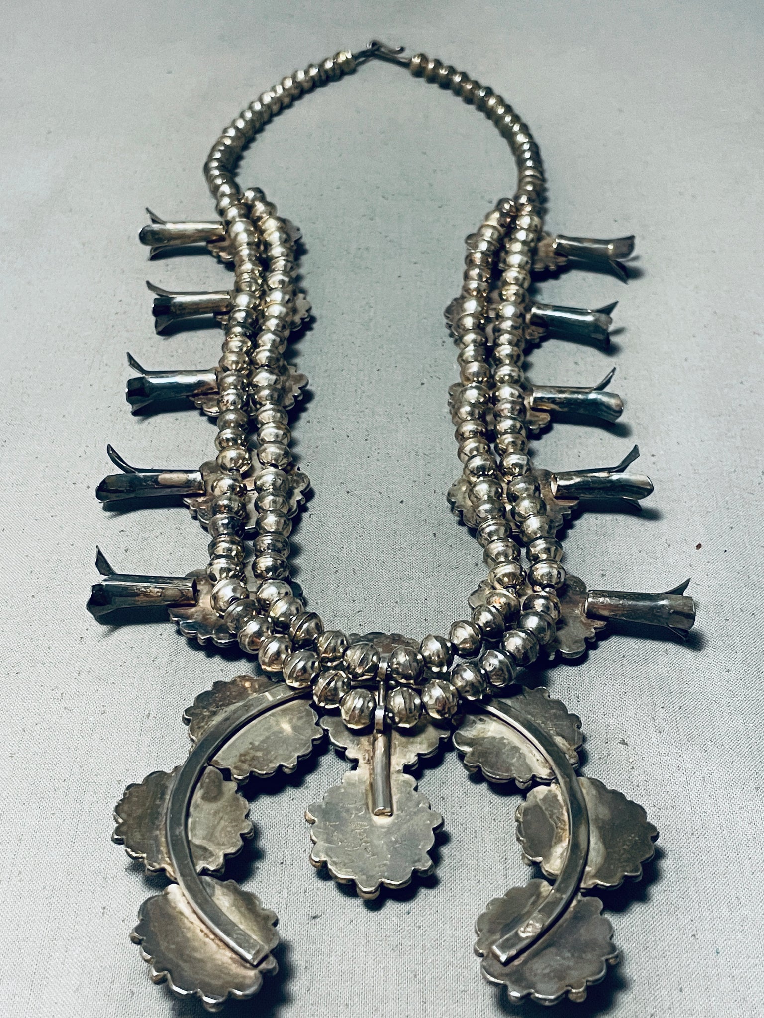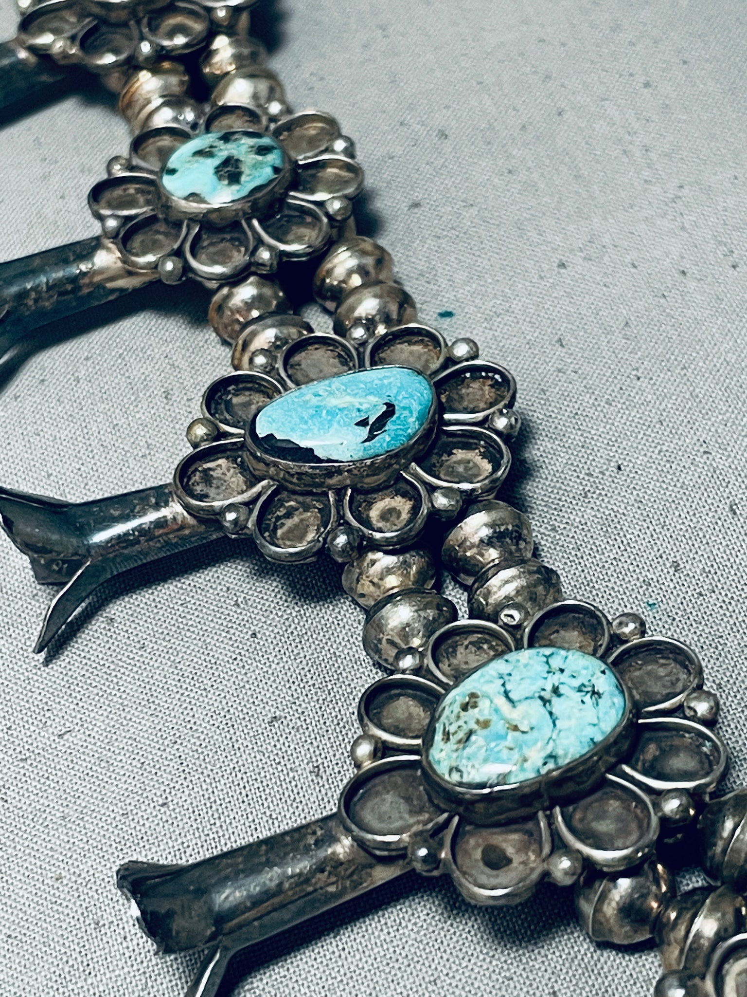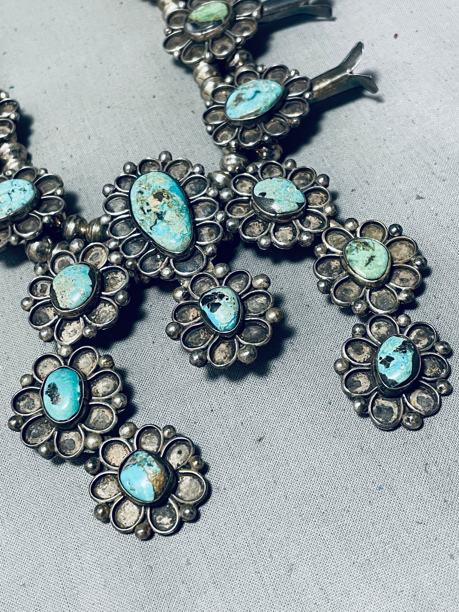 Powerful Womens Vintage Native American Navajo Turquoise Sterling Silver Squash Blossom Necklace