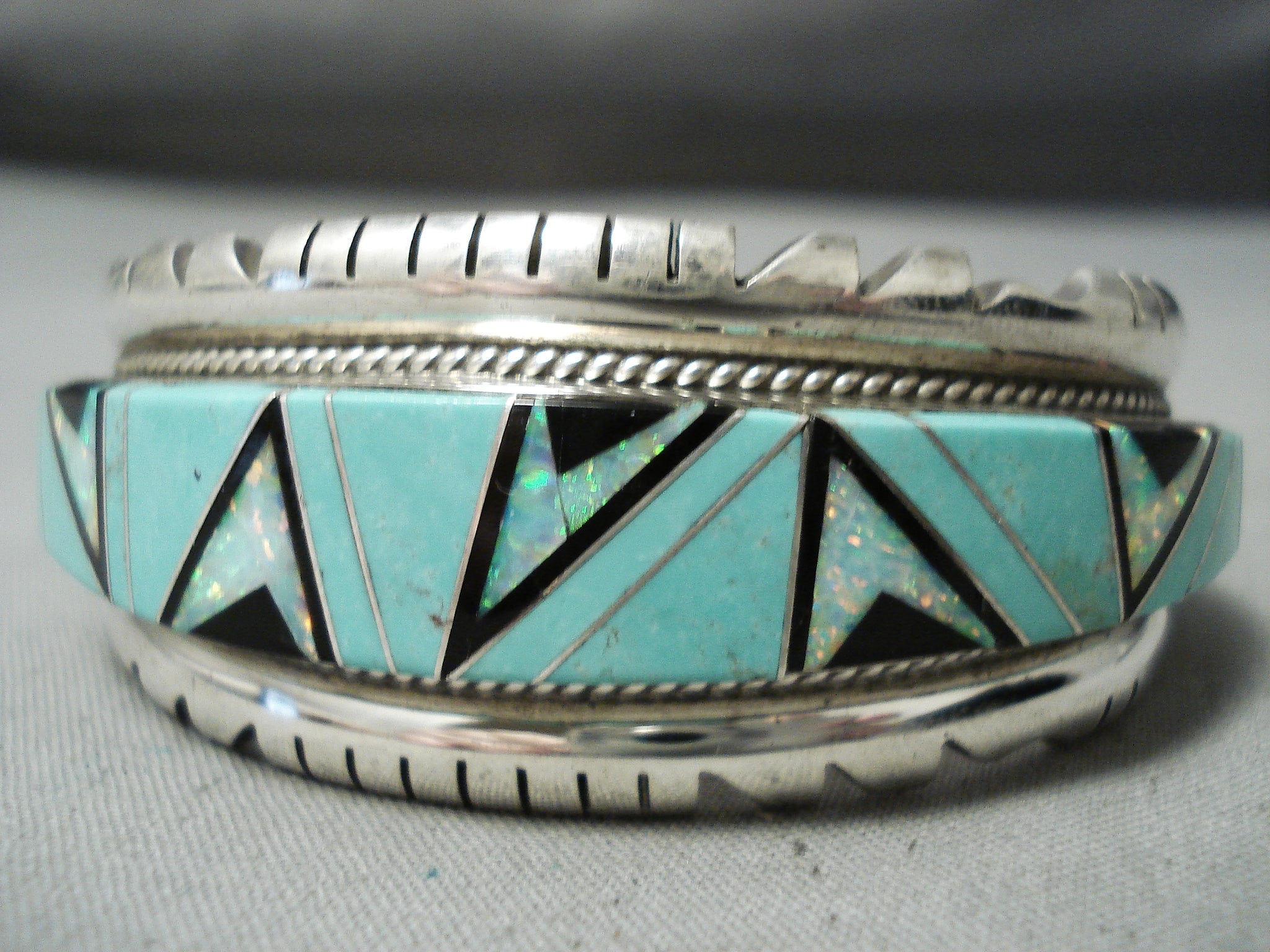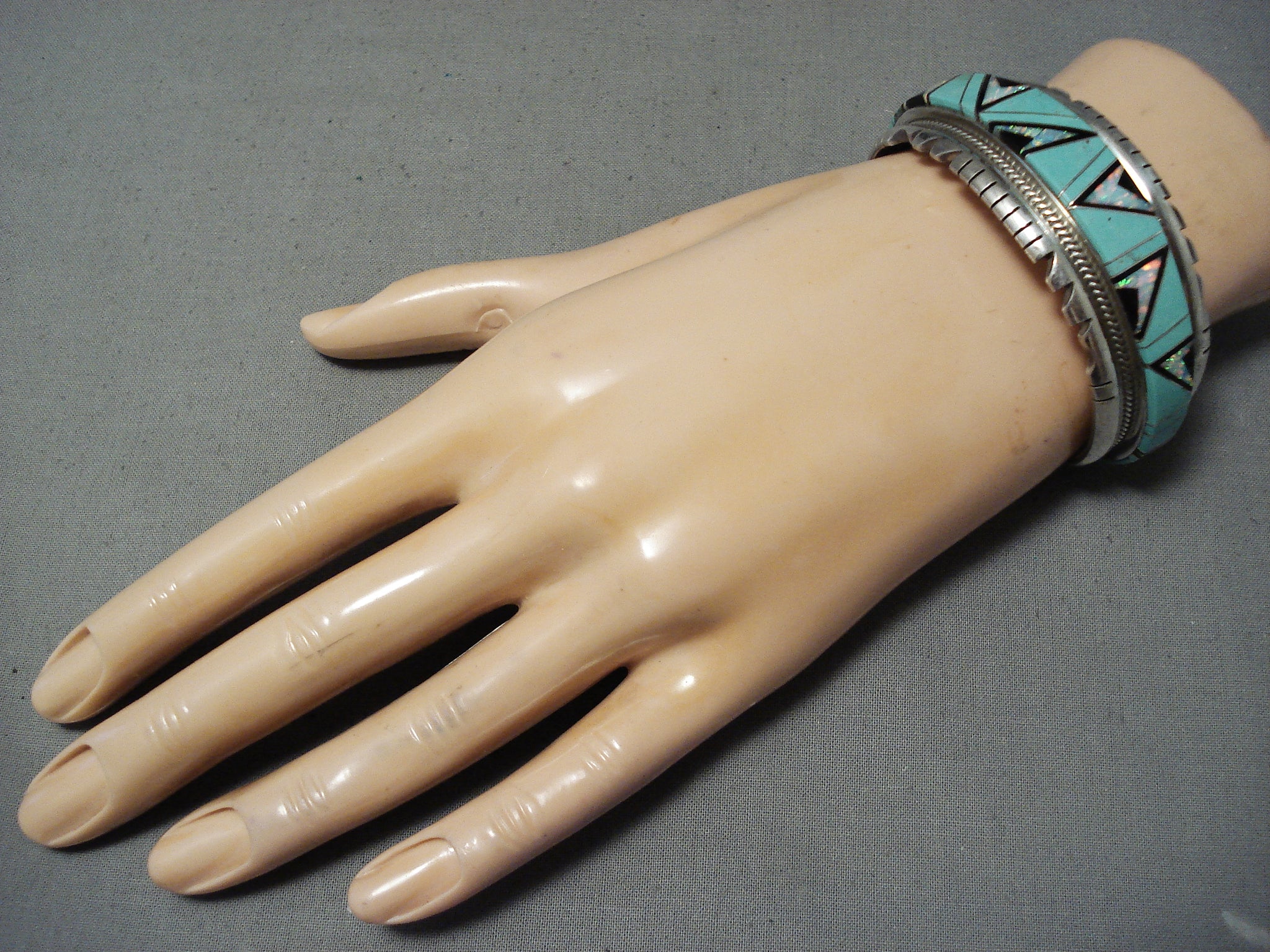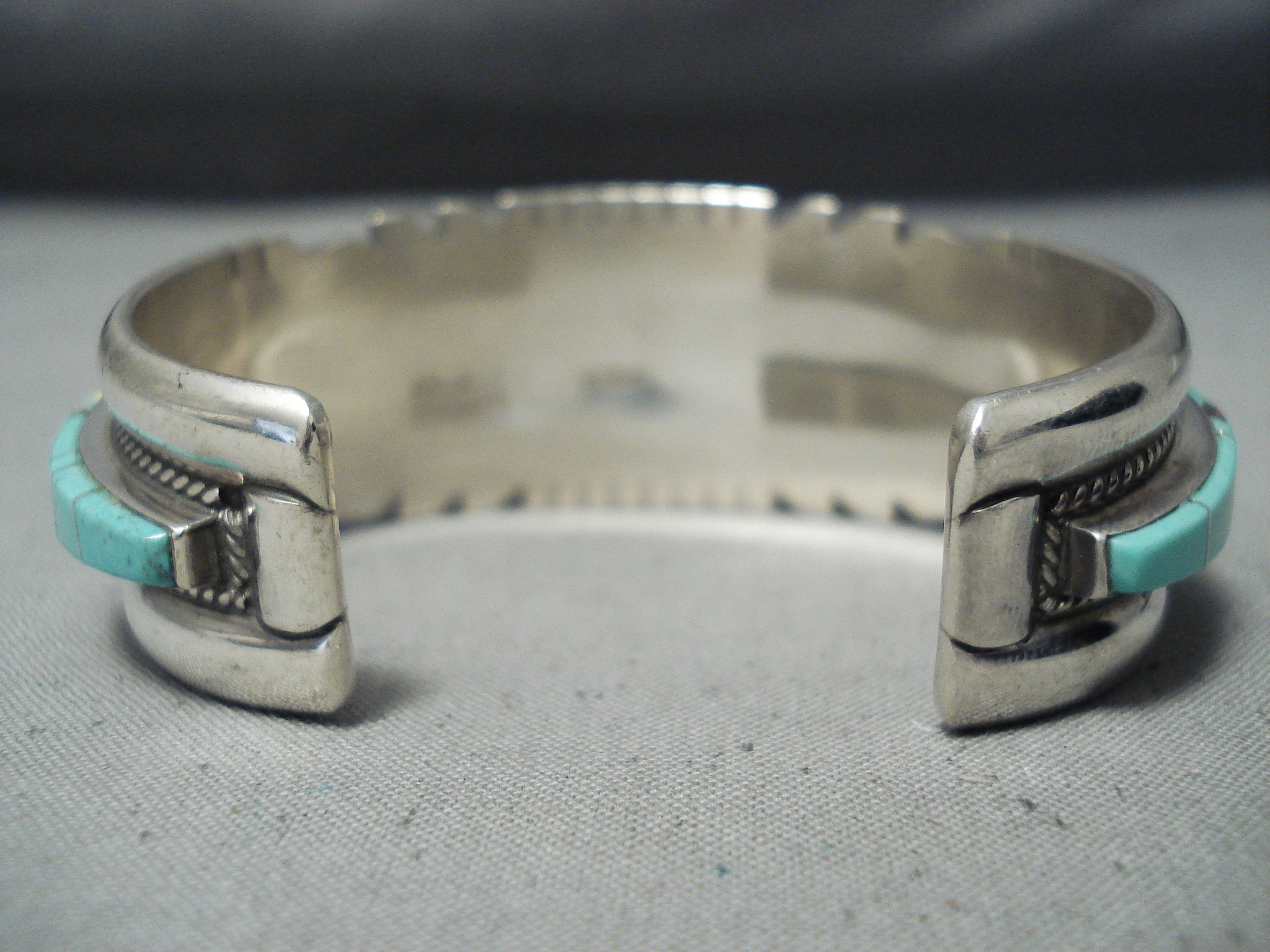 Quality Douglas Heavy Vintage Native American Navajo Turquoise Sterling Silver Inlay Bracelet