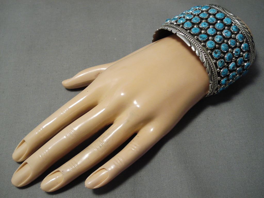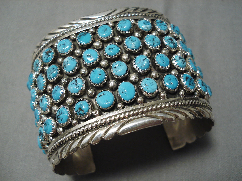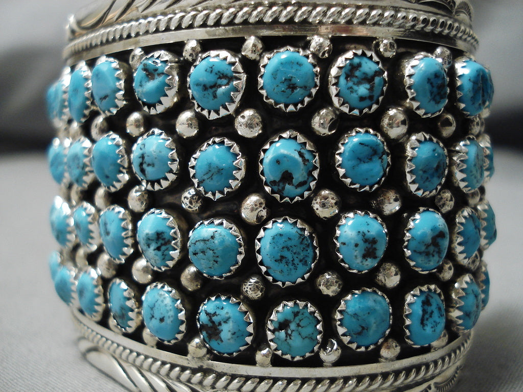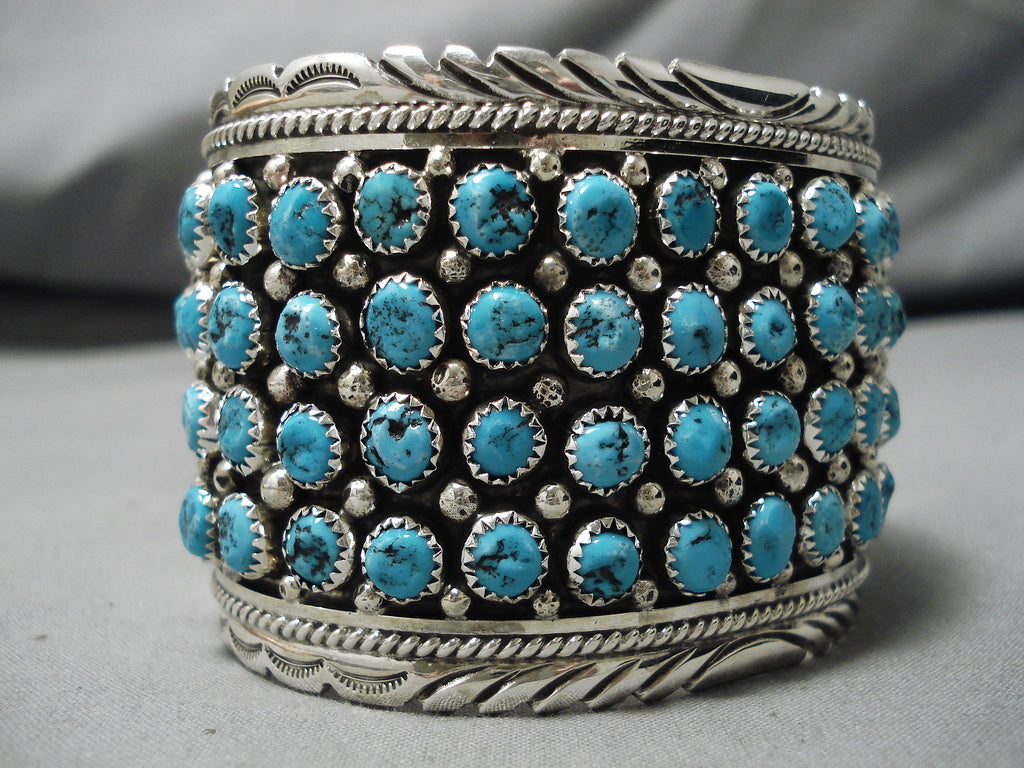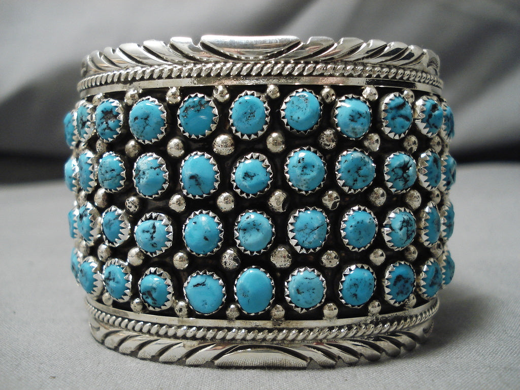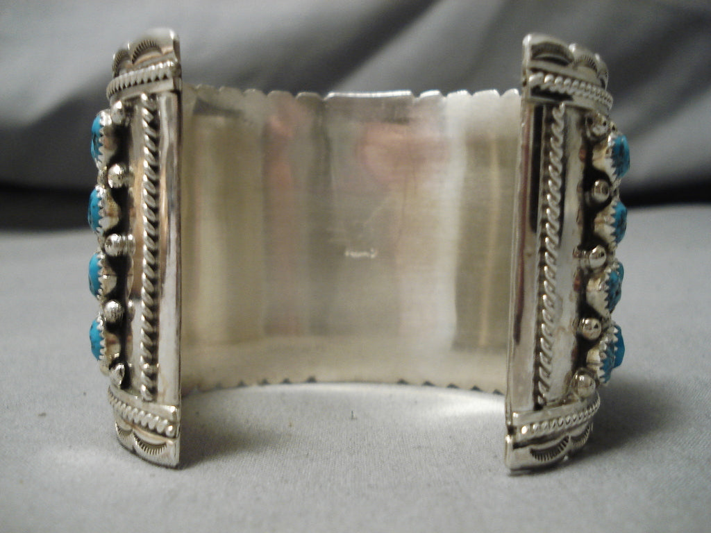 This is a tremendous modernistic Navajo museum quality turquoise row silver bracelet. This outstanding piece contains four fascinating rows of incredible turquoise stones. The cuff is very thick and wide with incredible bordering silver wave works and ropes that run from one end to the other. Resting throughout the stones are phenomenal silver raindrops. The stones measure around 1/4" x 1/4". The width of the bracelet measures around 2". Signed by Navajo artist, Chris Francisco . Sterling silver, marked. The inside end to end measures around 5-3/4" with an additional 1-1/4" gap. Sturdy 93 grams.