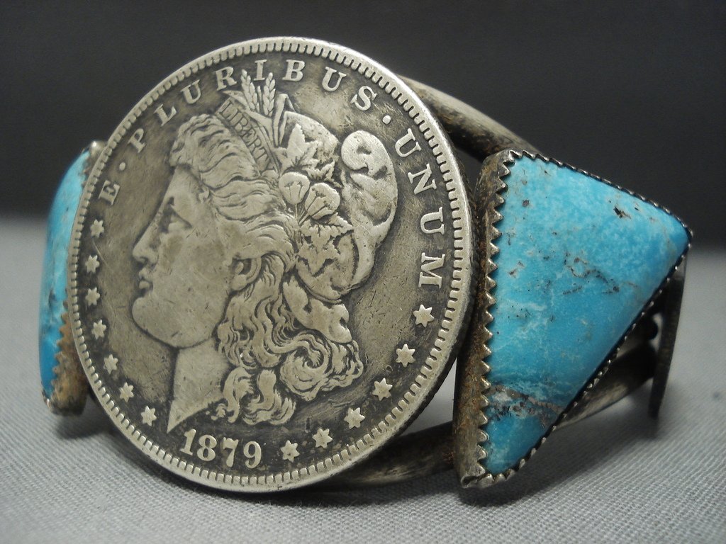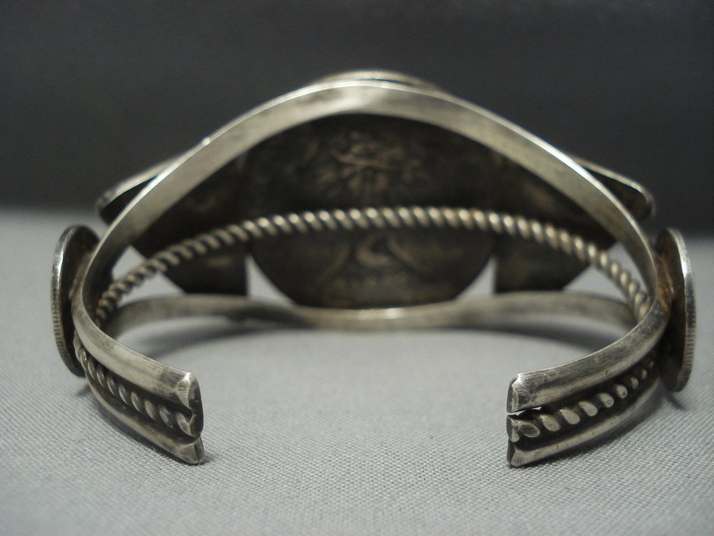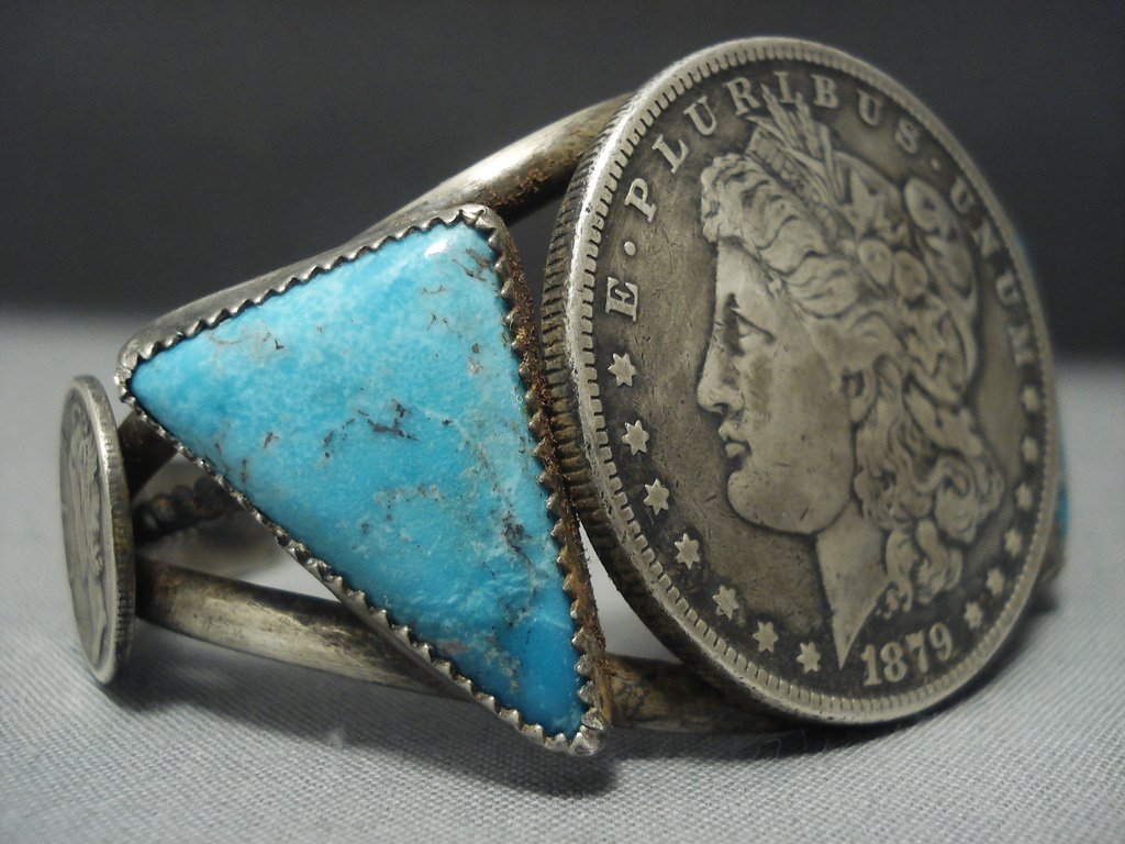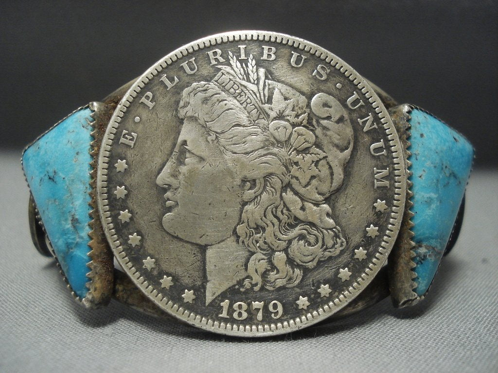 Quality Navajo Coin Native American Jewelry Silver Sterling Blue Diamond Turquoise Bracelet