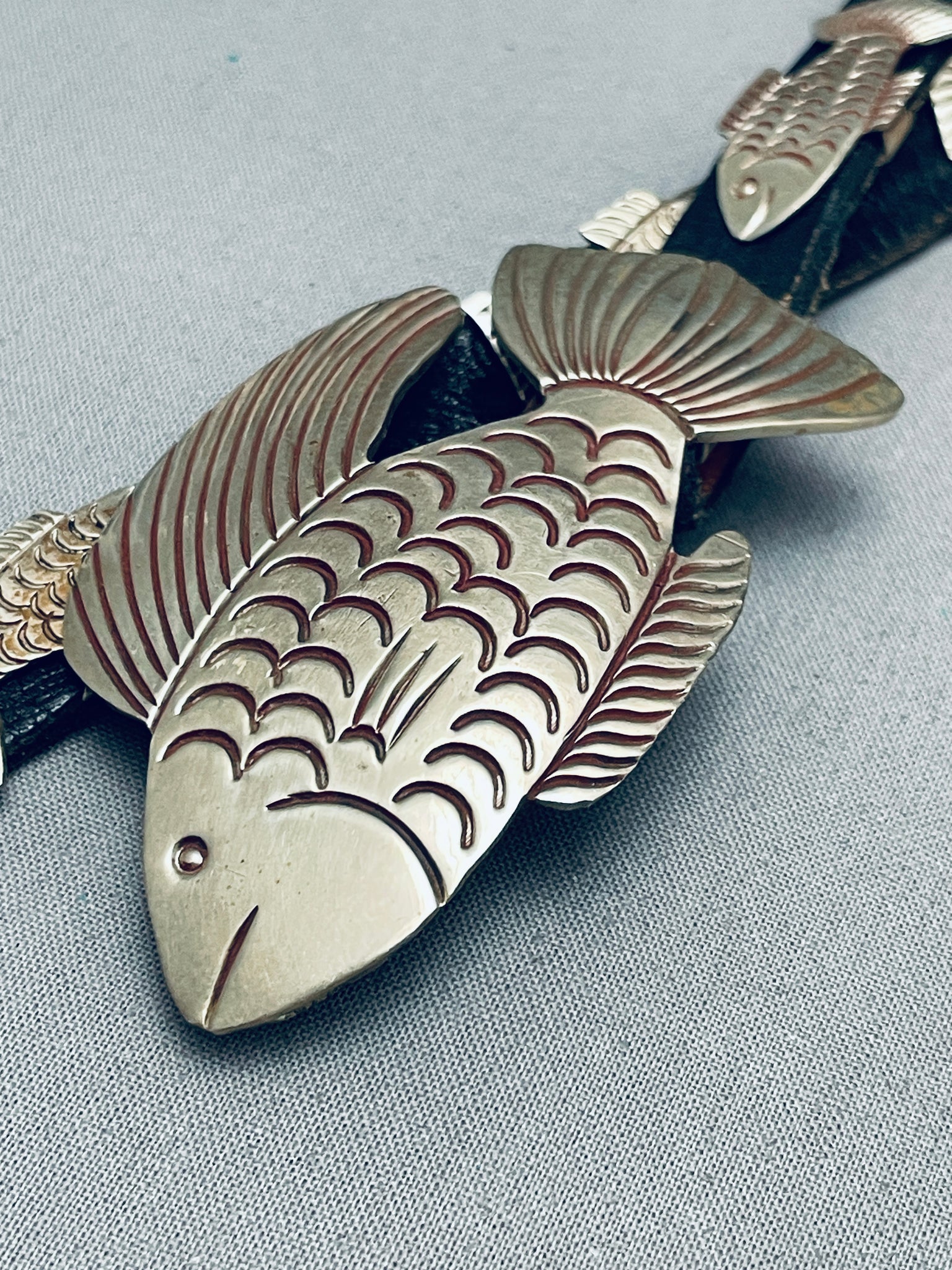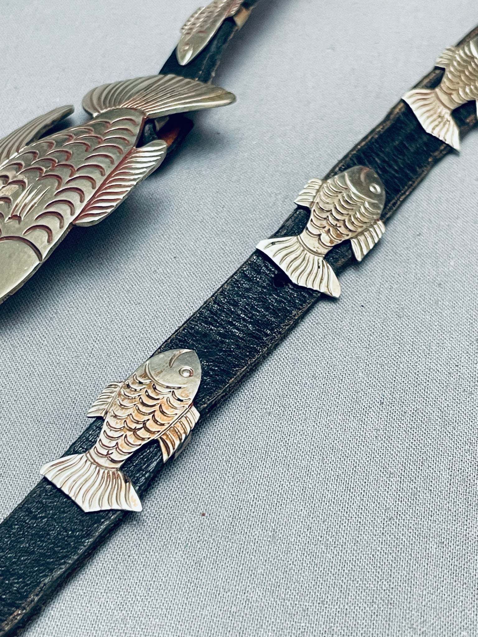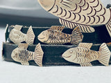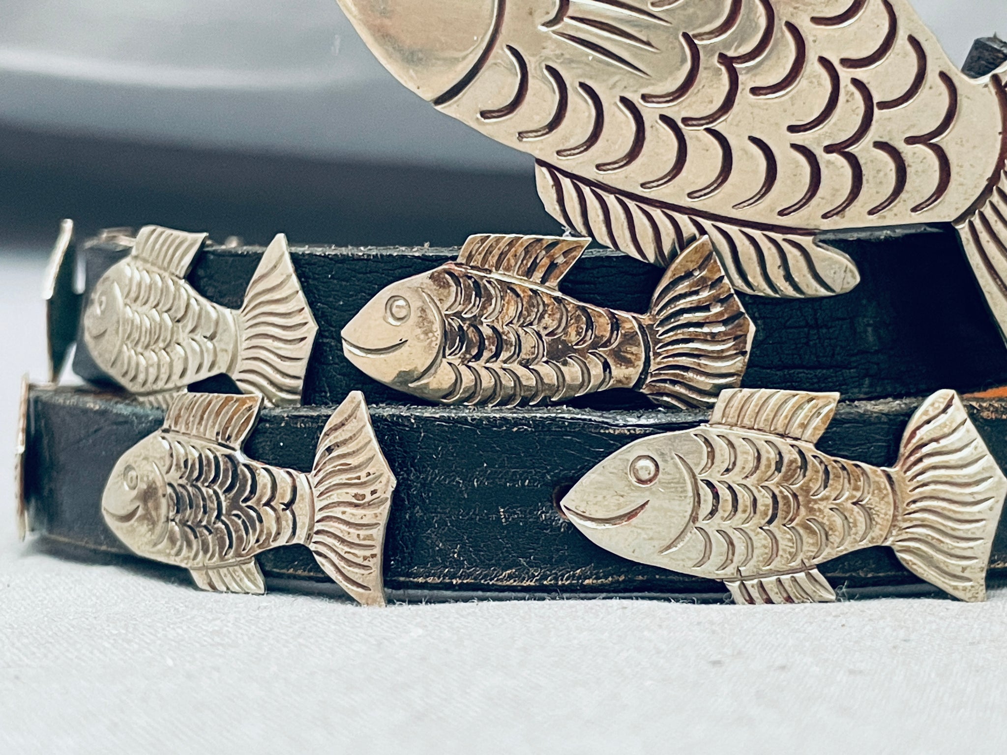 Rare Fish!! Vintage Southwest Sterling Silver Hand Tooled Concho Belt
