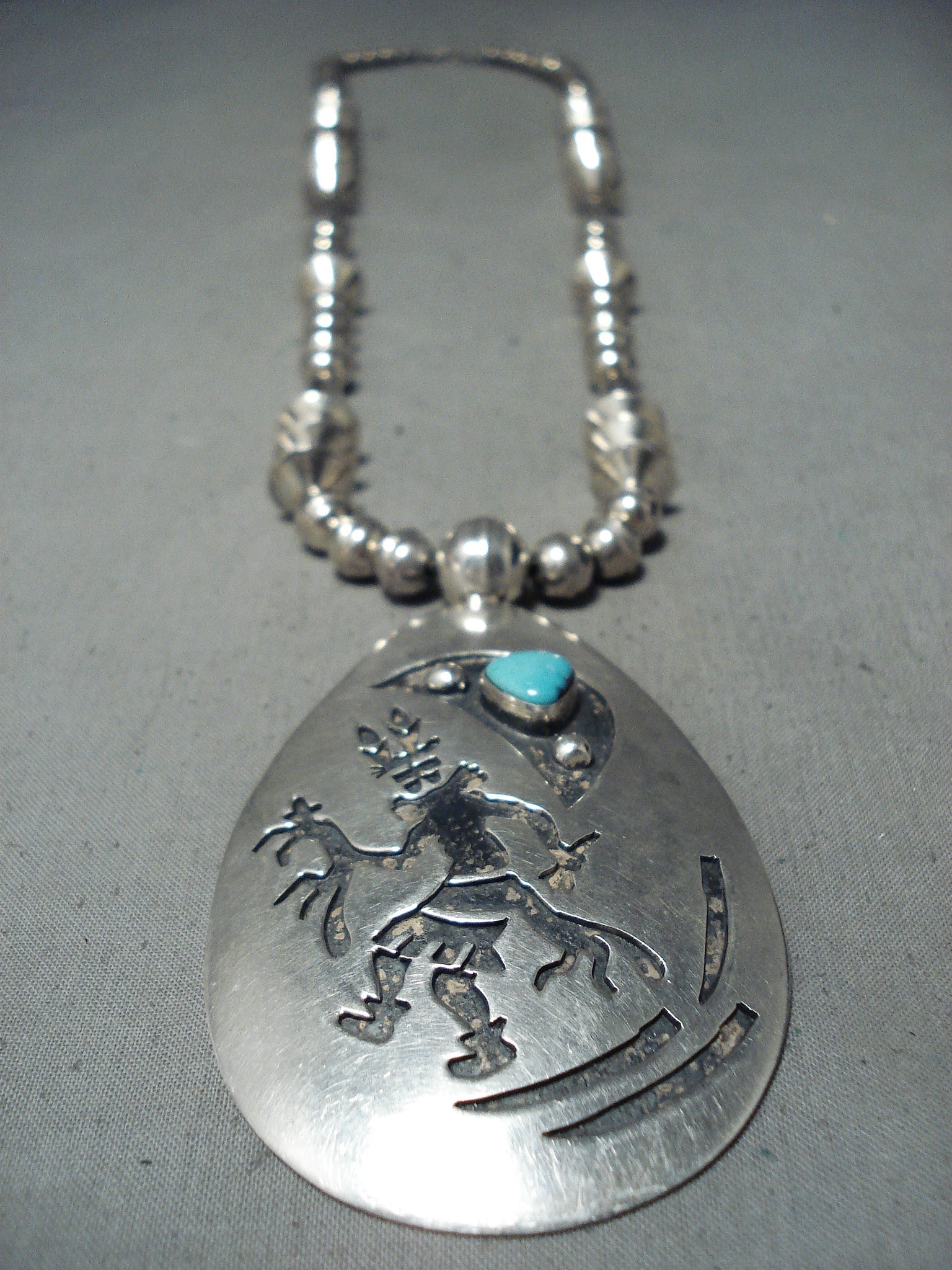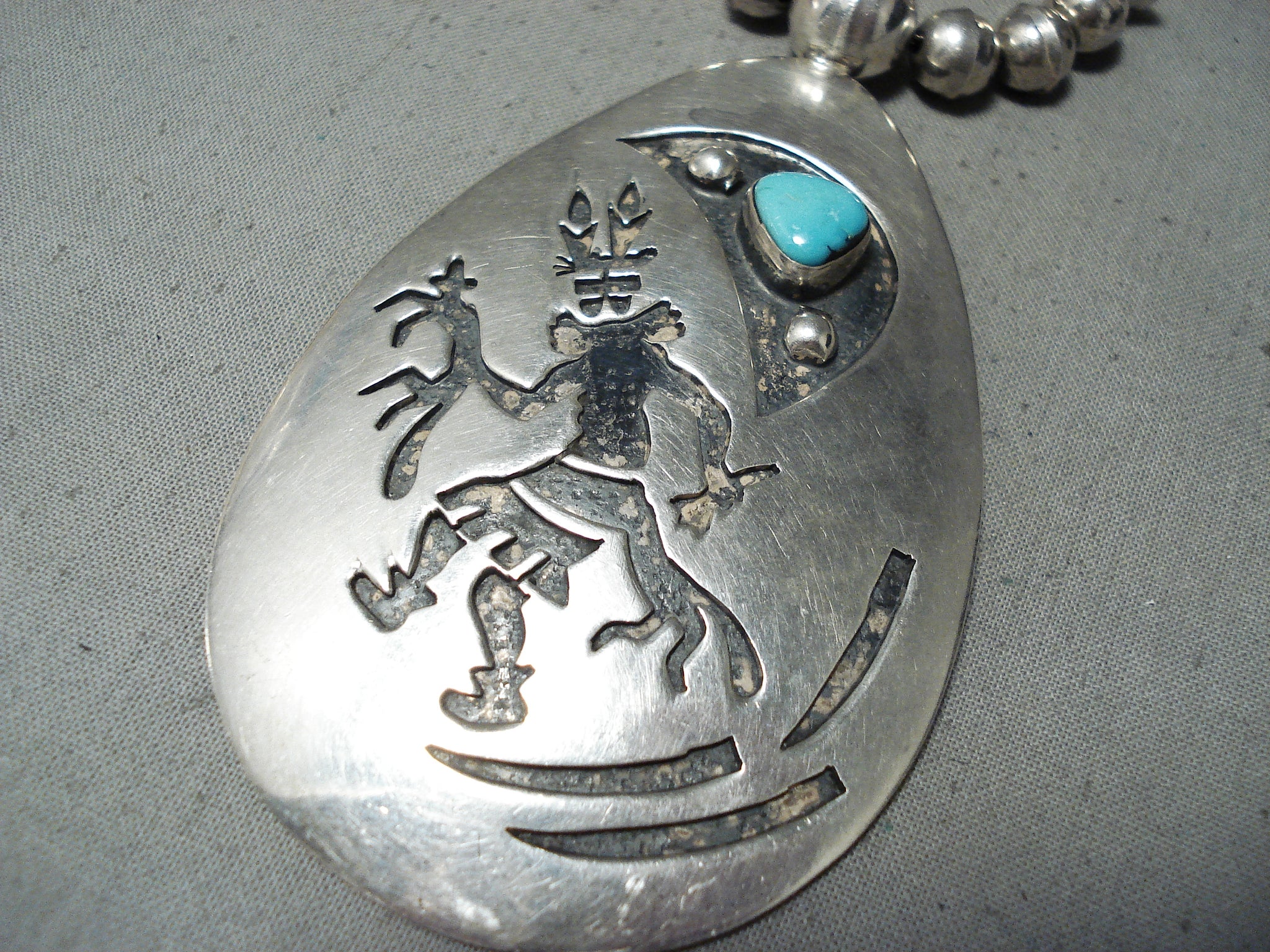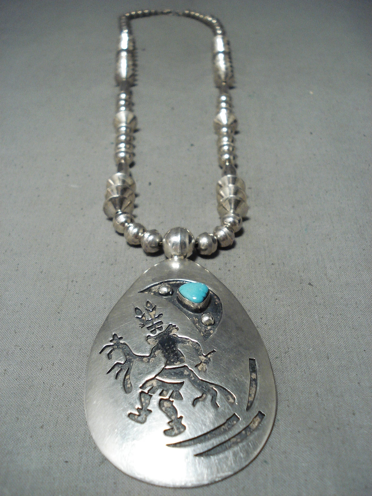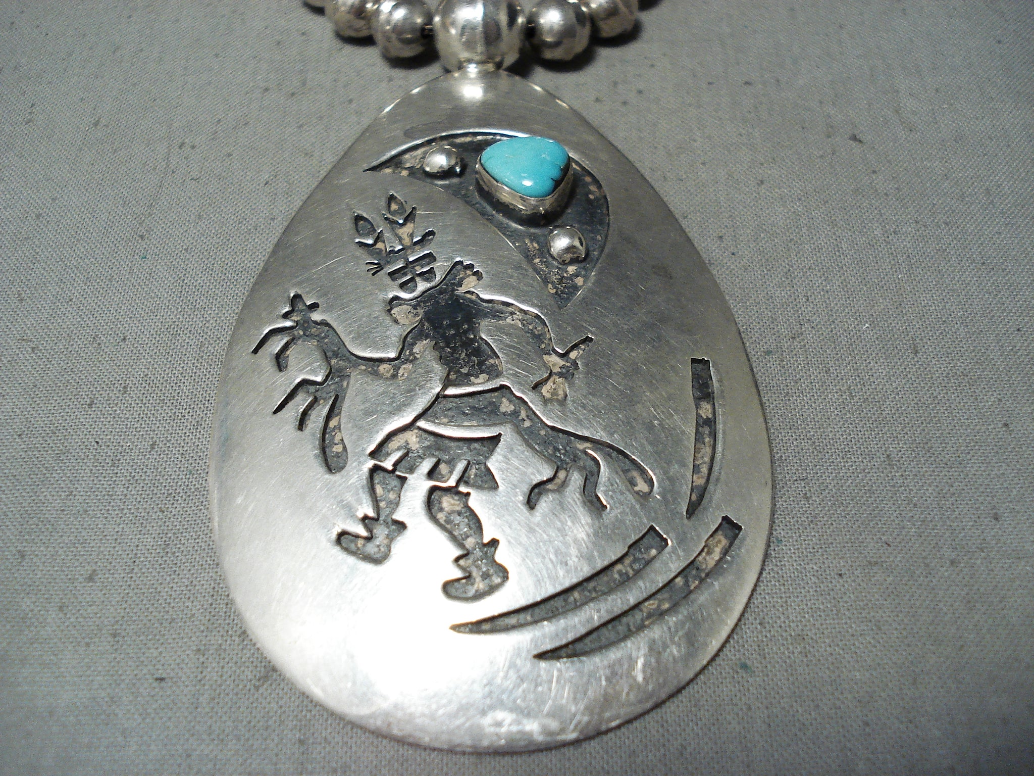 Rare Vintage Native American Navajo Blue Gem Turquoise Sterling Silver Kachina Necklace