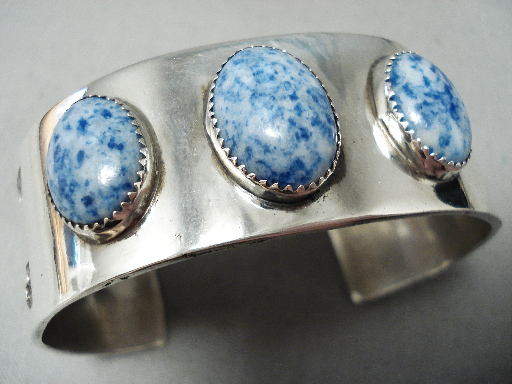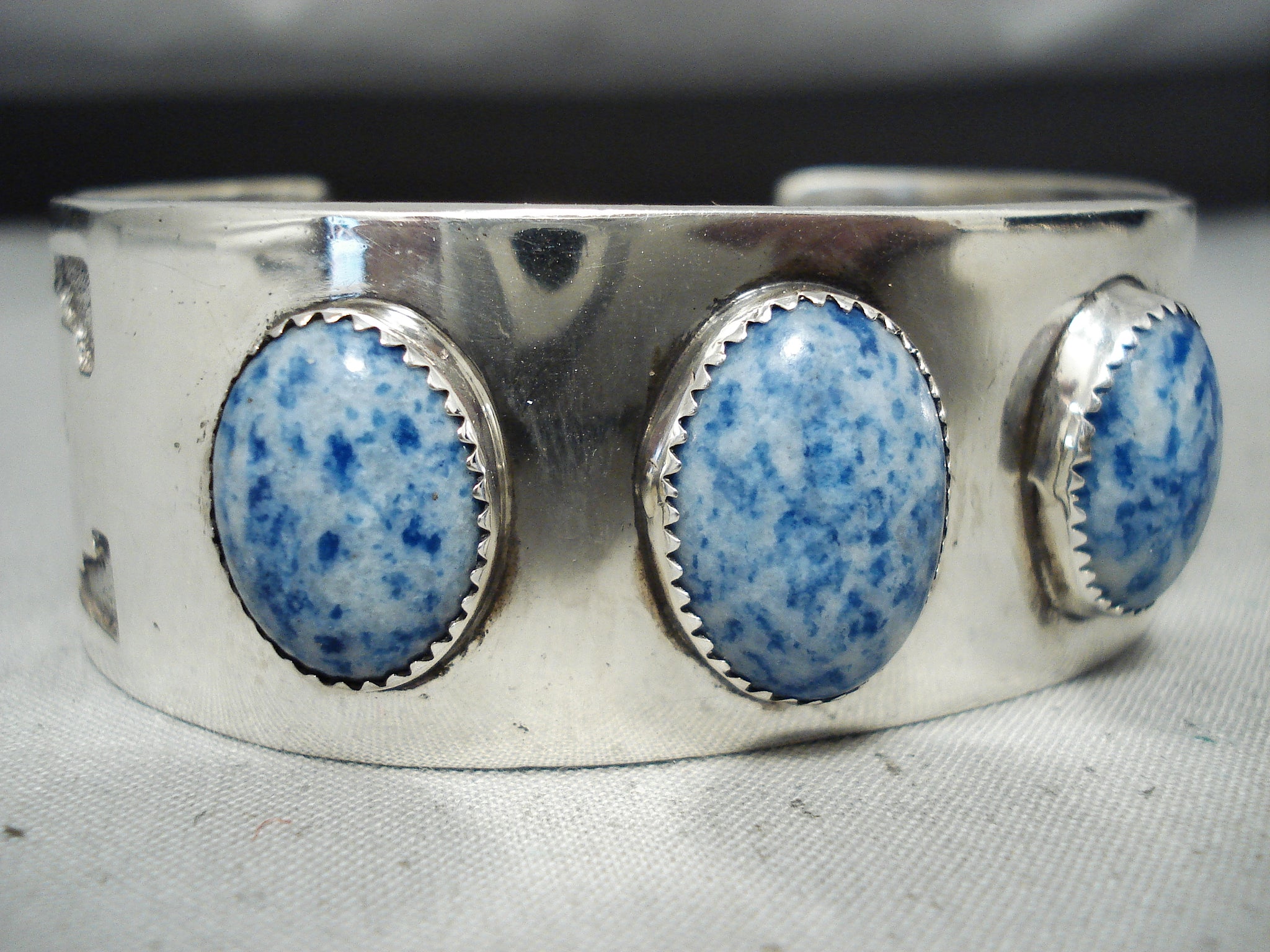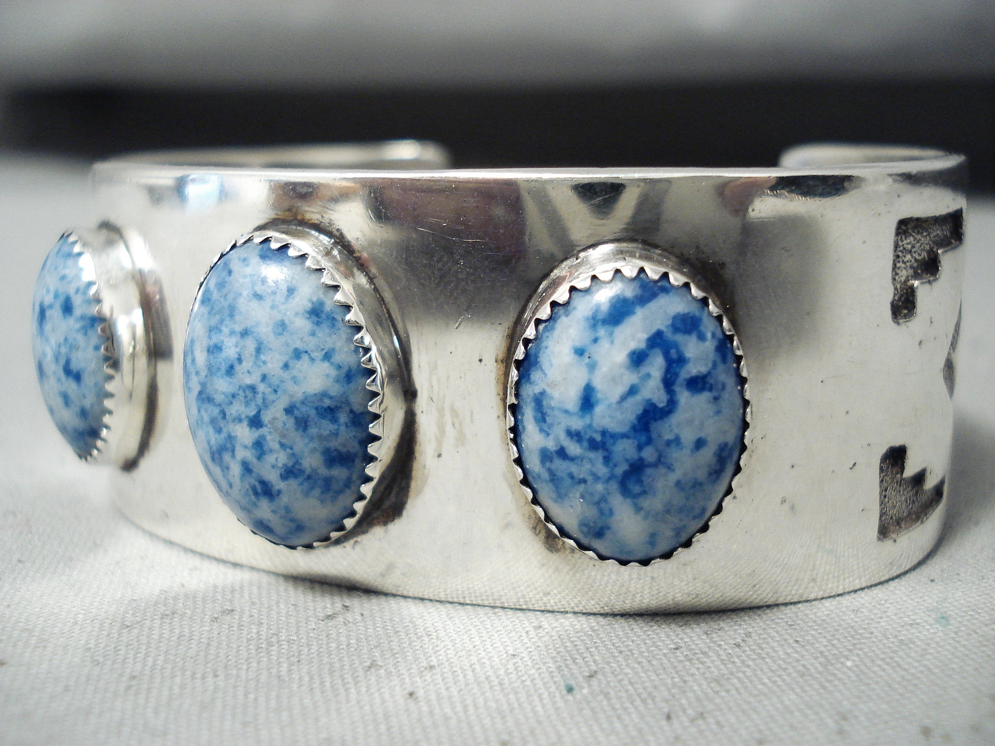 Rare Vintage Native American Navajo Domed Lapis Sterling Silver Geometric Bracelet