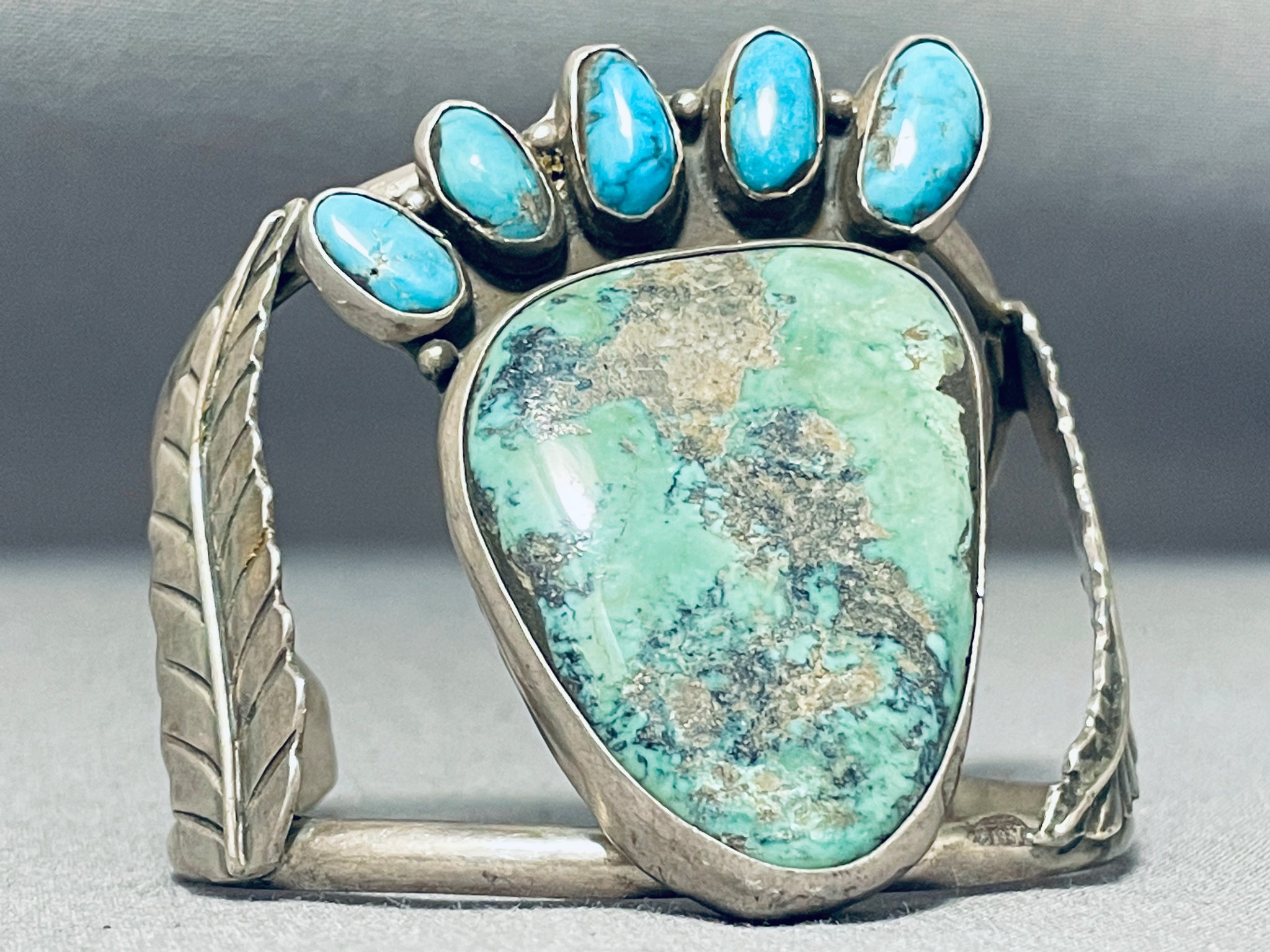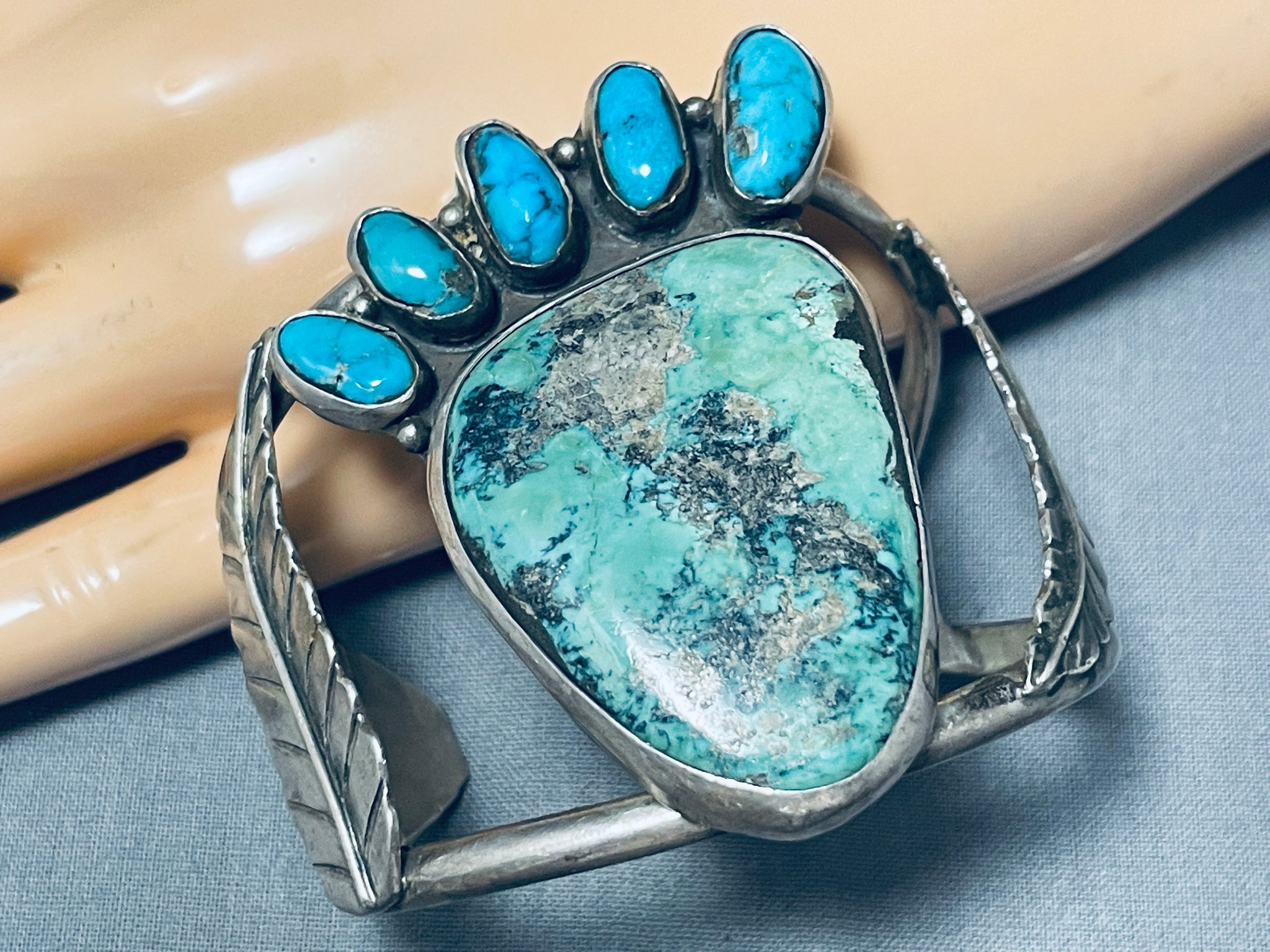 Rare Vintage Native American Navajo Old Kingman Turquoise Sterling Silver Bear Track Bracelet