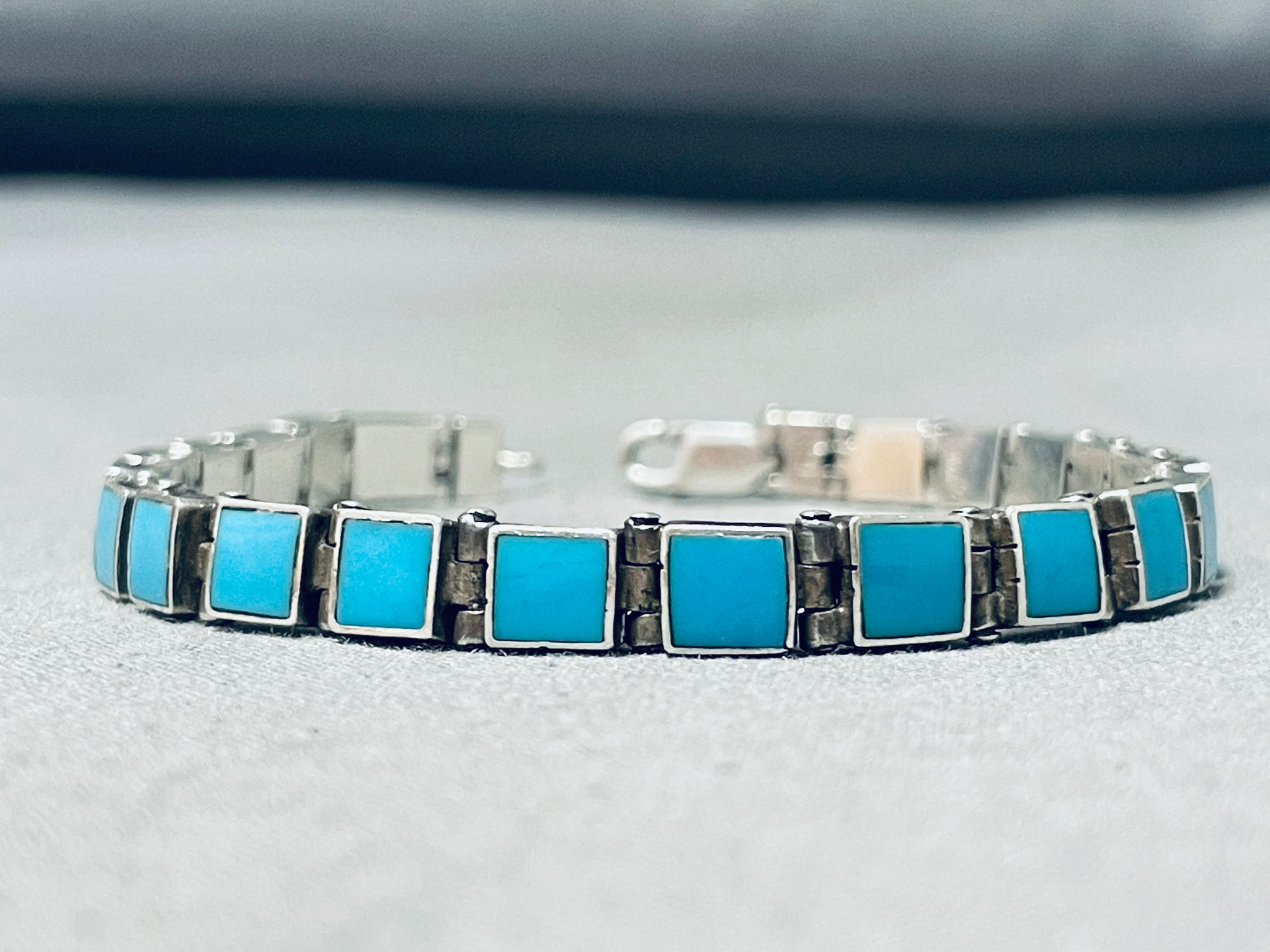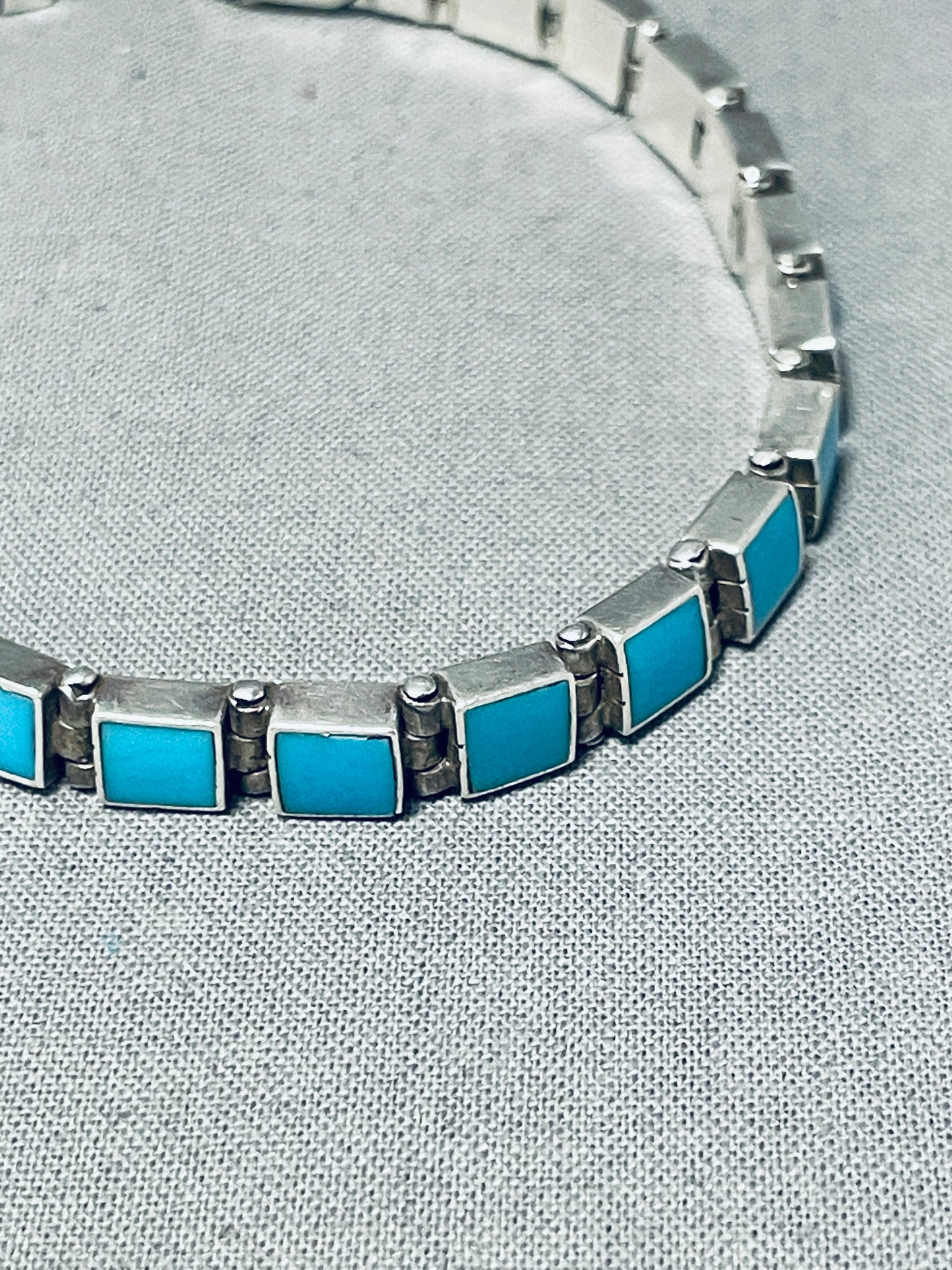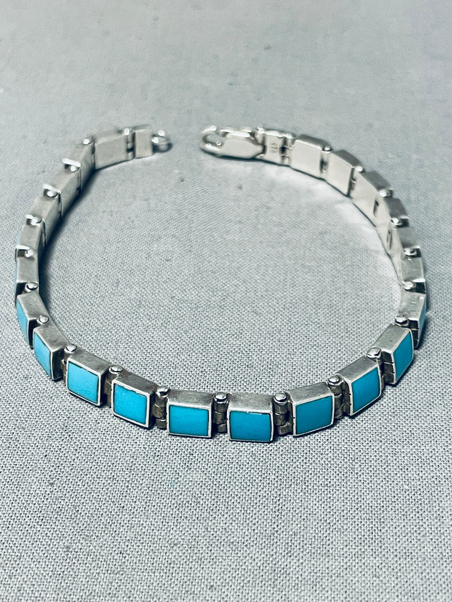 Rare Vintage Native American Navajo Sleeping Beauty Turquoise Square Cut Silver Link Bracelet