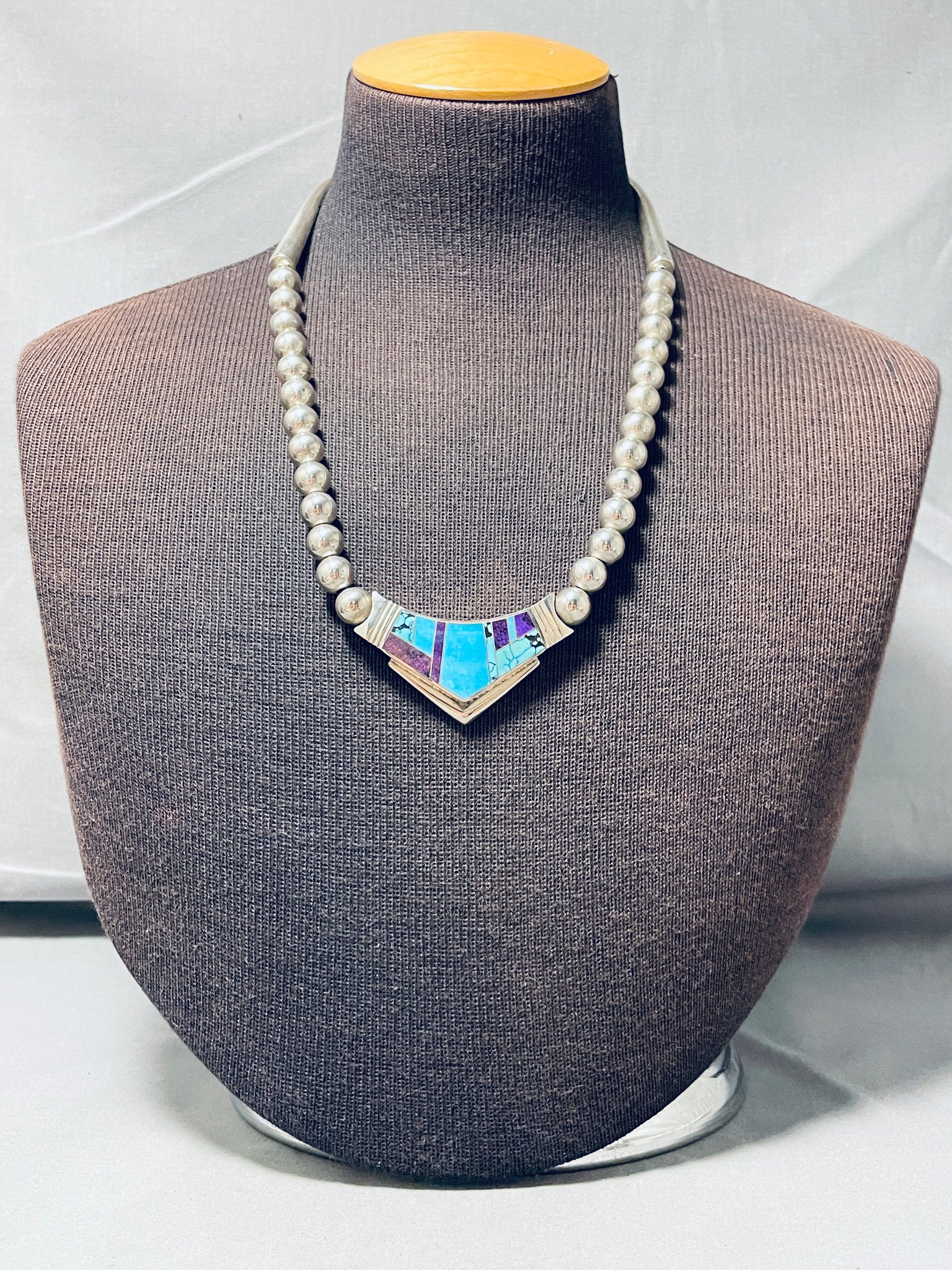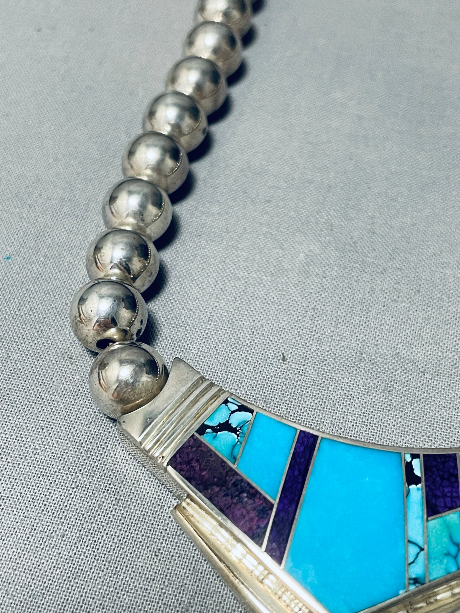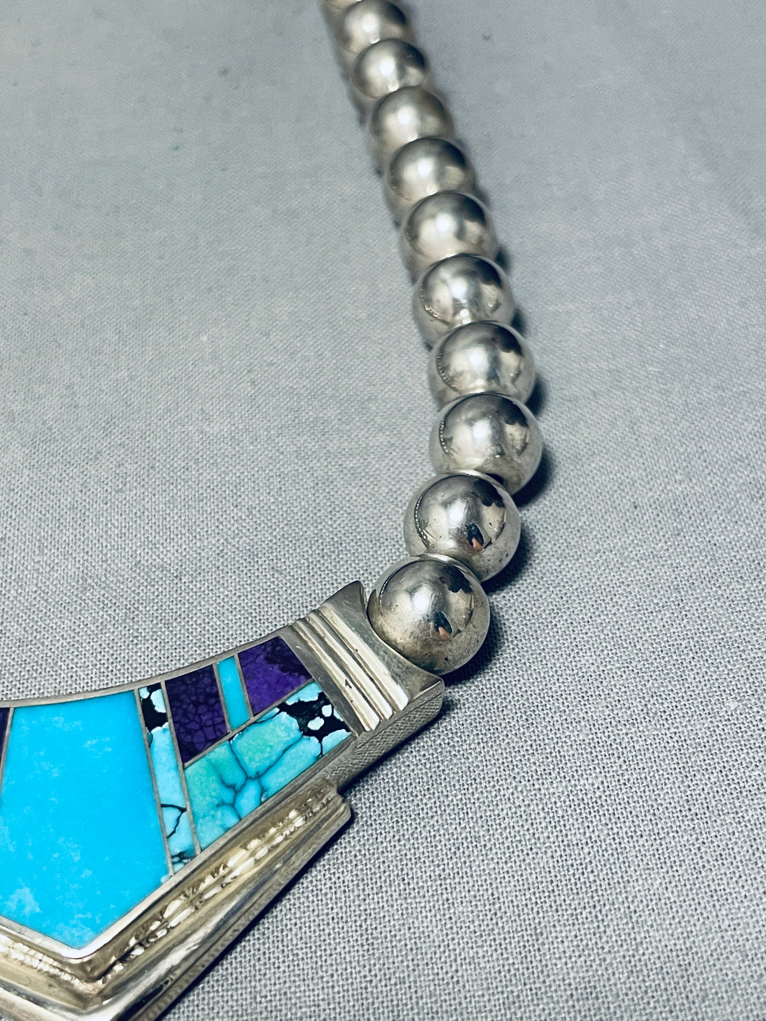 Ray Tracey Vintage Native American Navajo Turquoise Inlay Sterling Silver Necklace