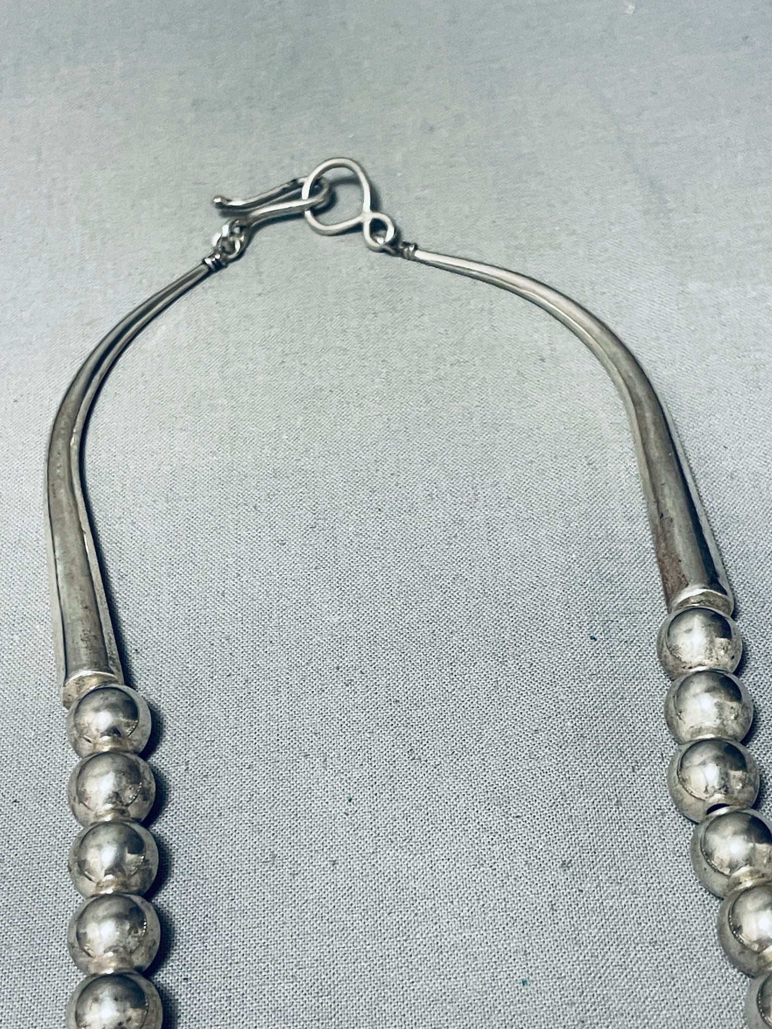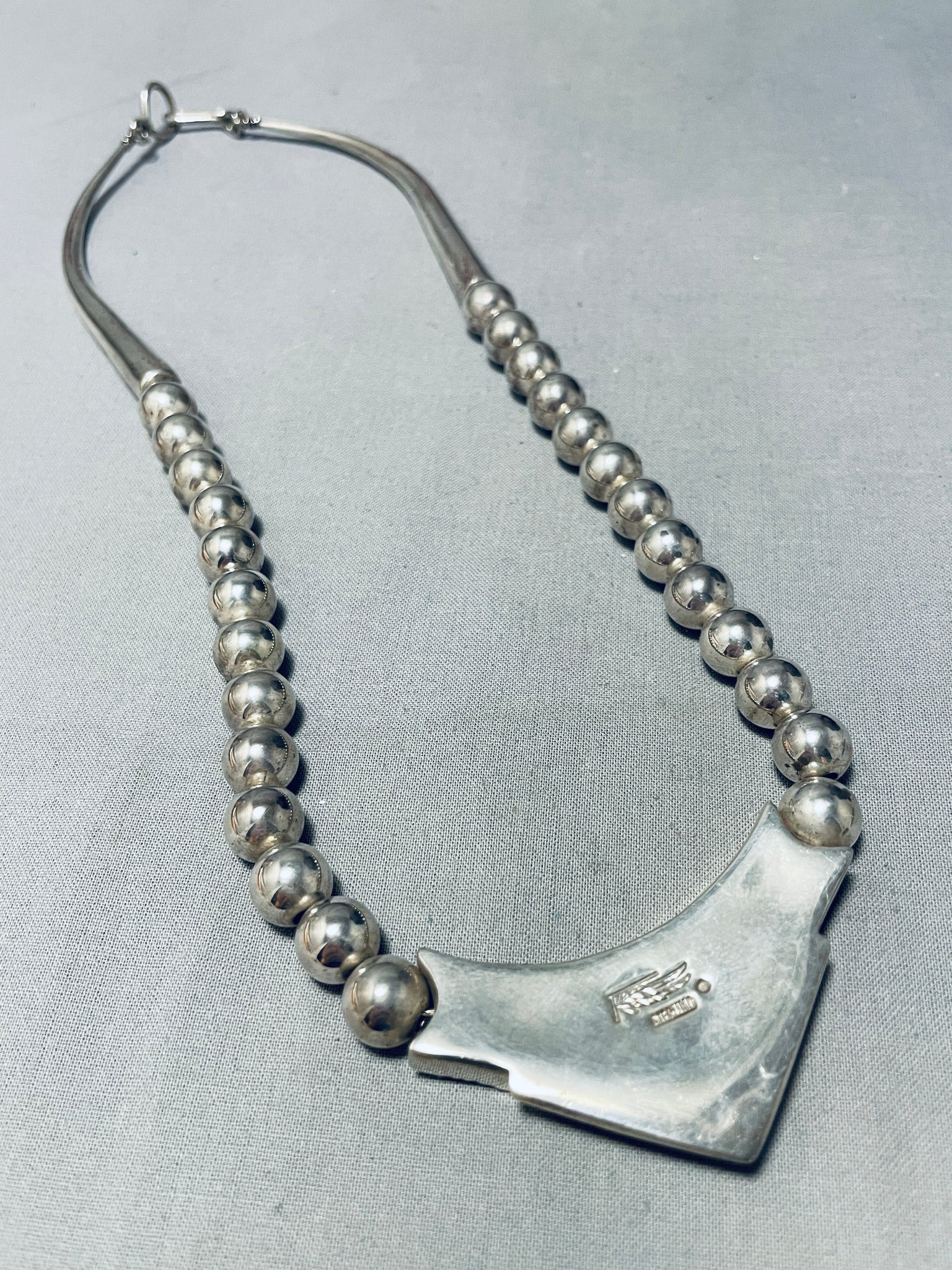 Throughout his career, Ray Tracey's jewelry has received widespread recognition and has been featured in galleries, museums, and exhibitions around the world. His innovative designs have earned him numerous awards and accolades, solidifying his status as a pioneer in contemporary Native American jewelry art. Sterling silver, marked. Cir. 1970's+. Signed by Navajo artist, Ray Tracey . The length of the necklace measures around 19-1/2". Sturdy 56 grams.