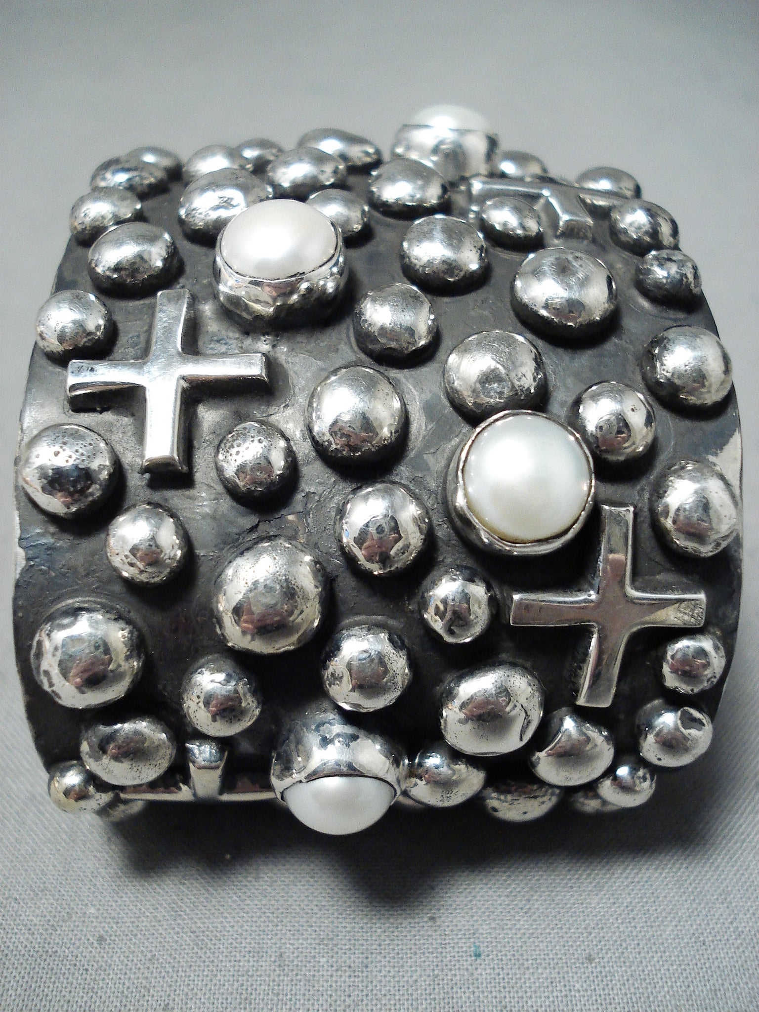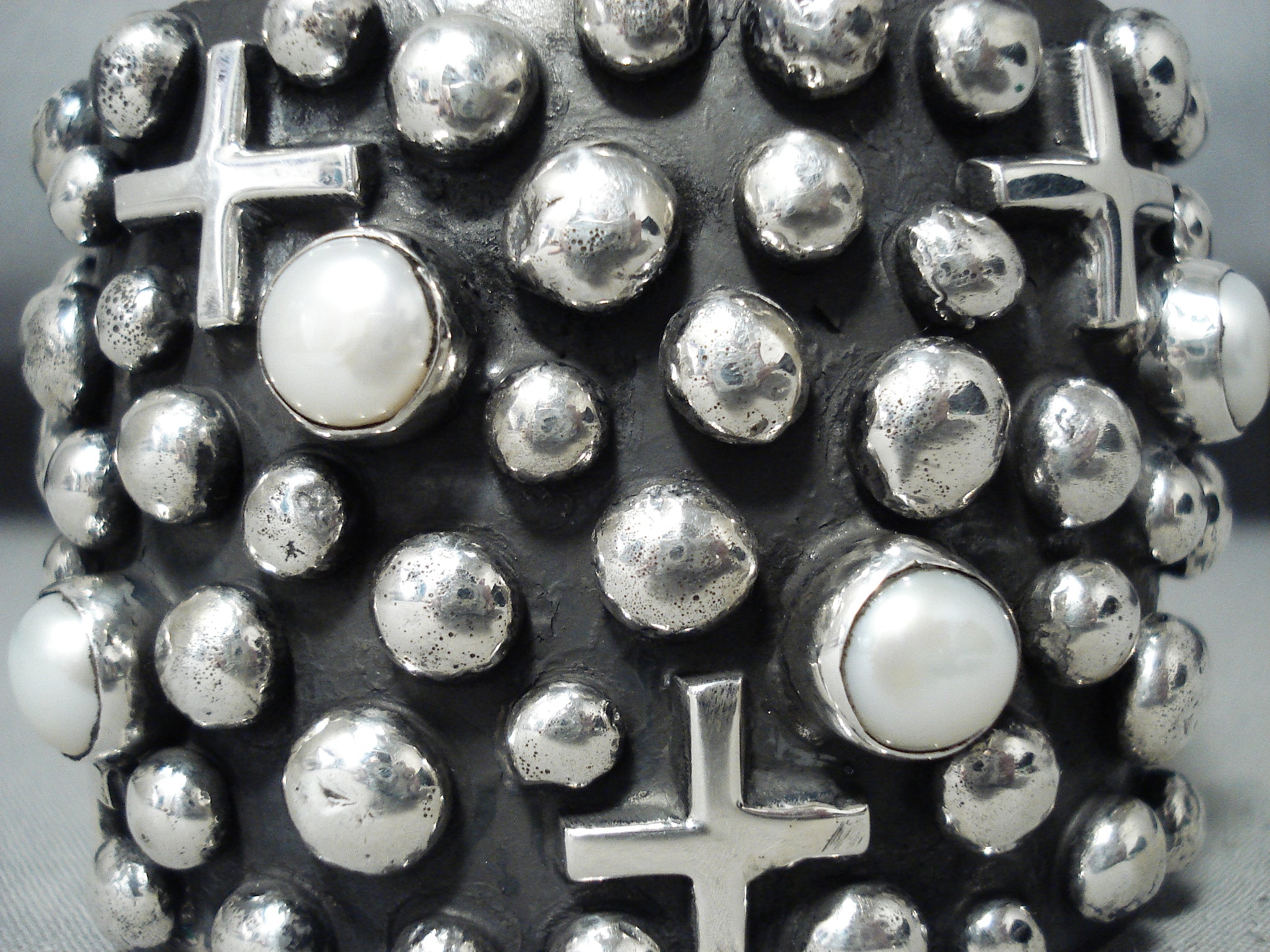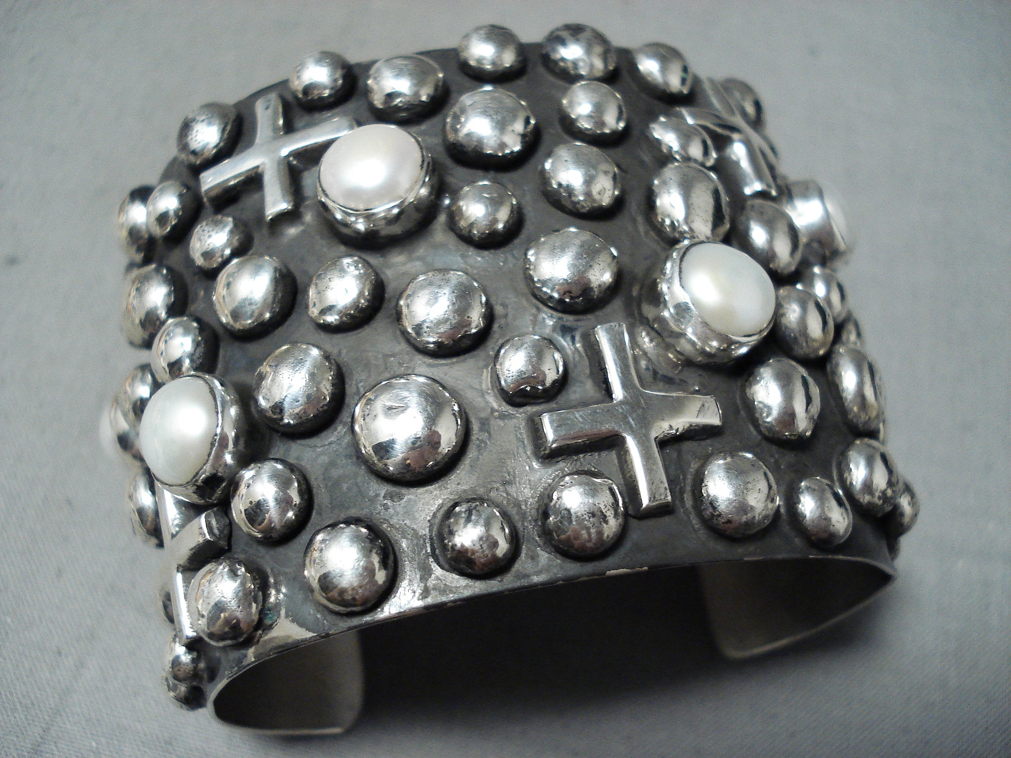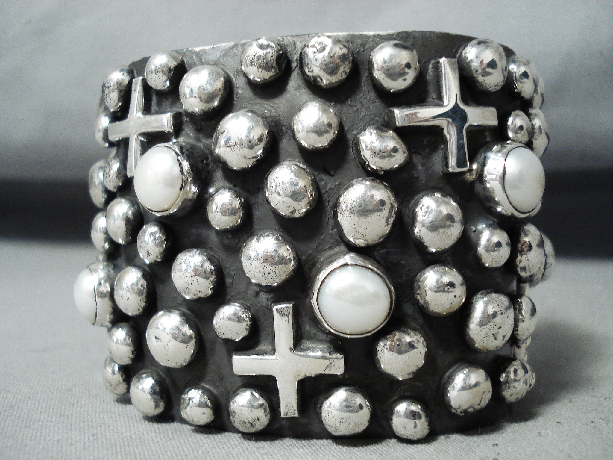 Remarkable Native American Navajo Mother Of Pearl Sterling Silver Crosses Huge Bracelet