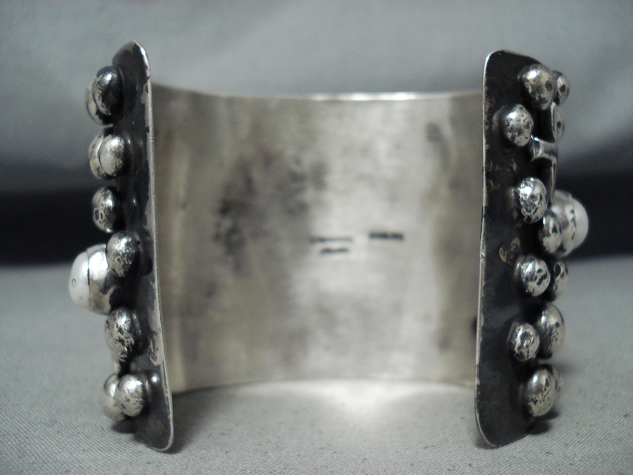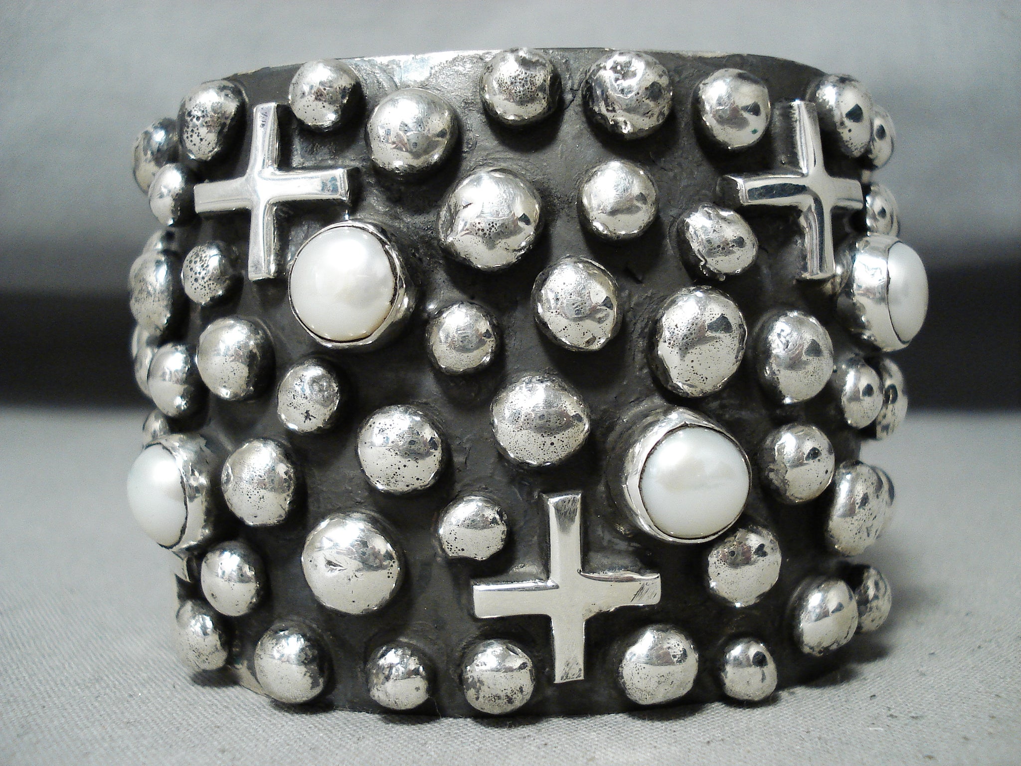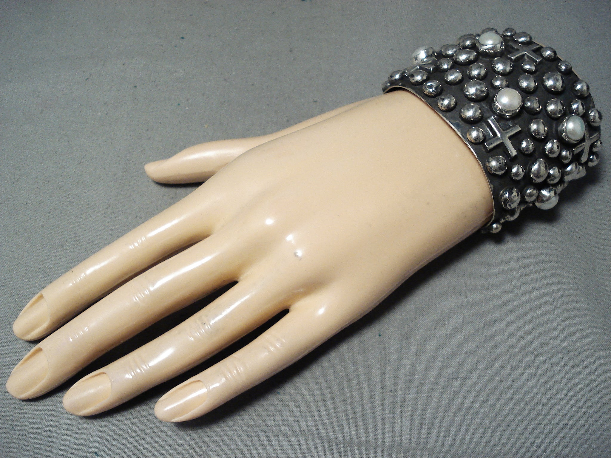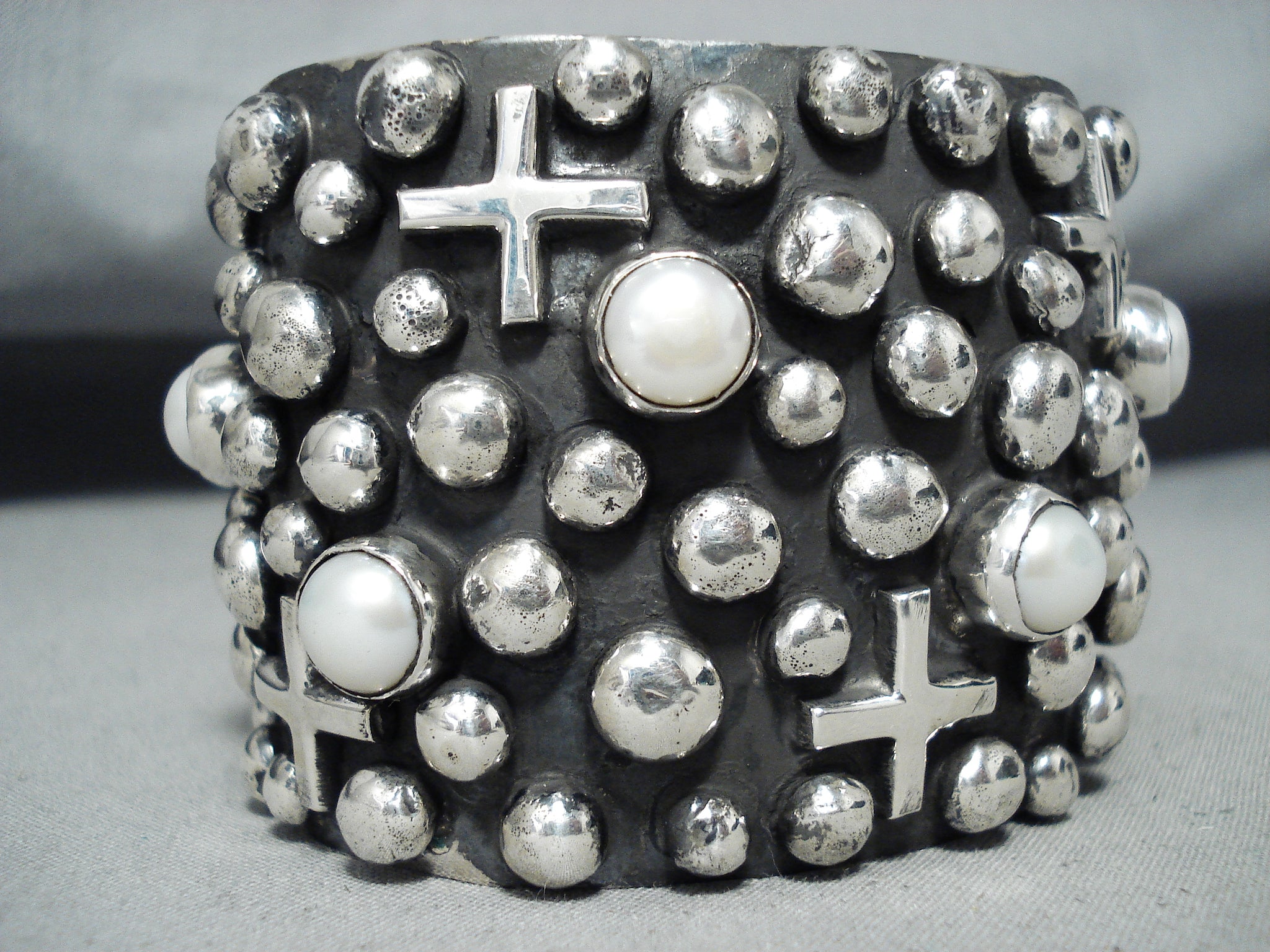 Remarkable Native American Navajo Mother Of Pearl Sterling Silver Crosses Huge Bracelet
