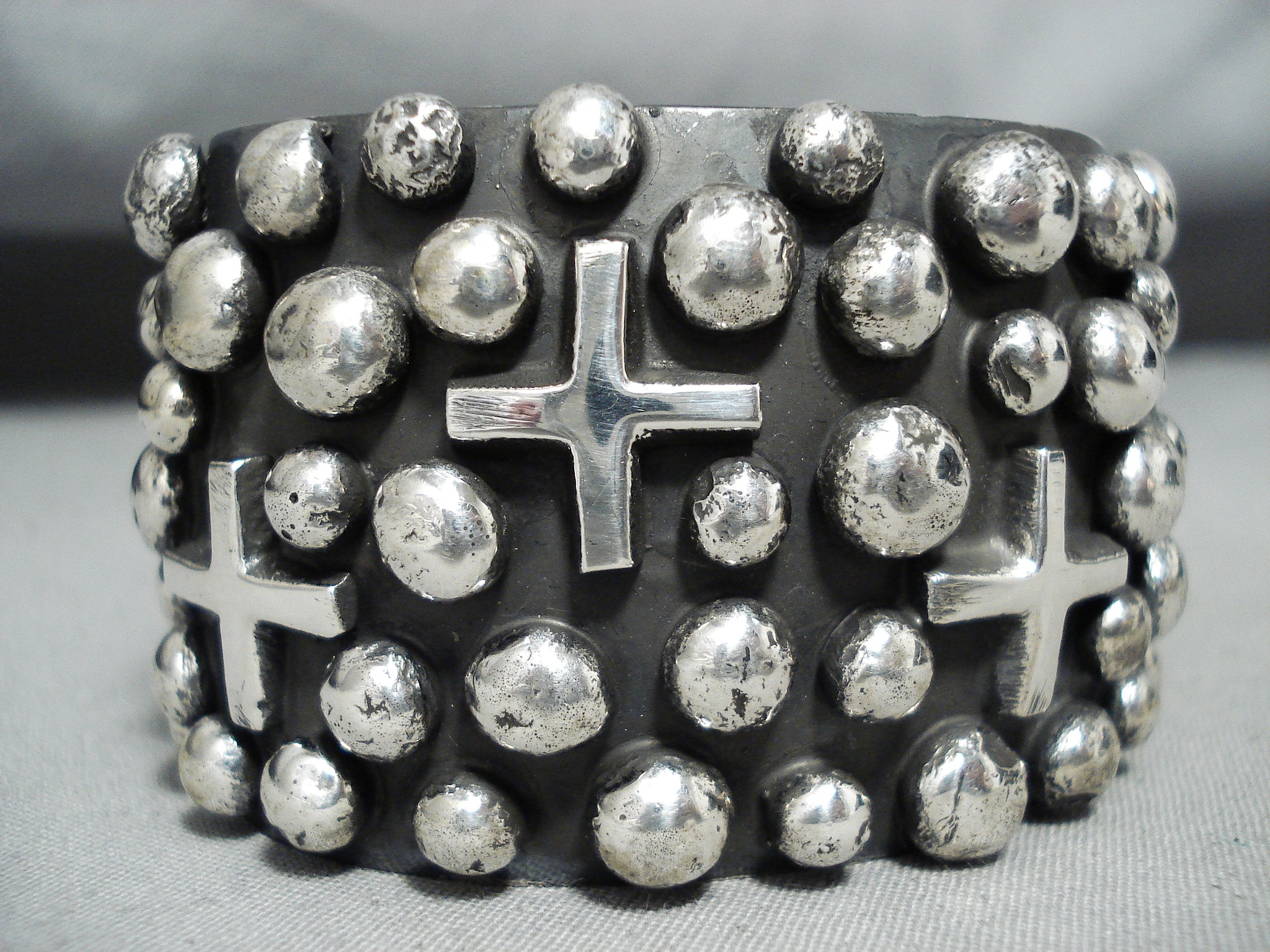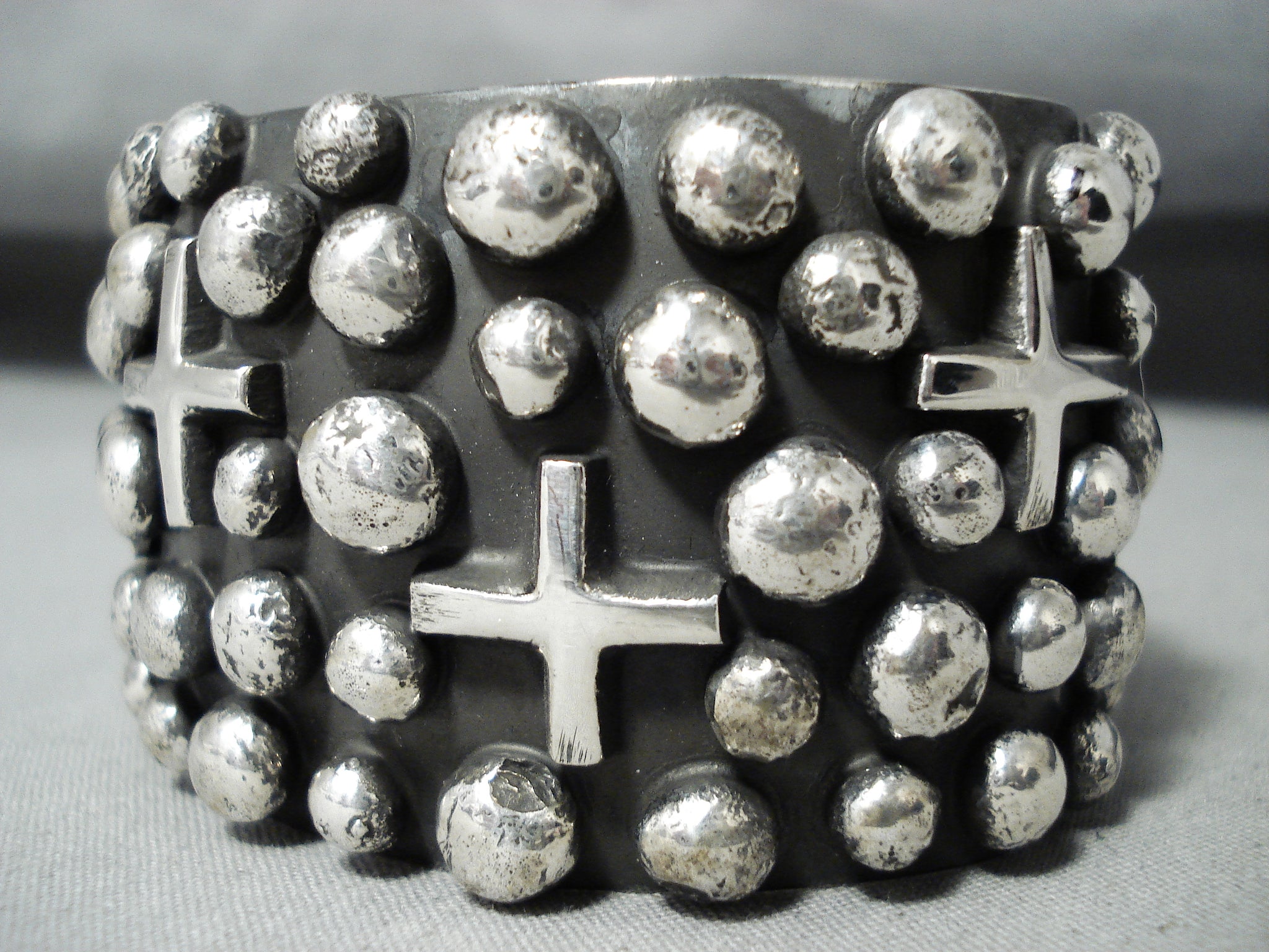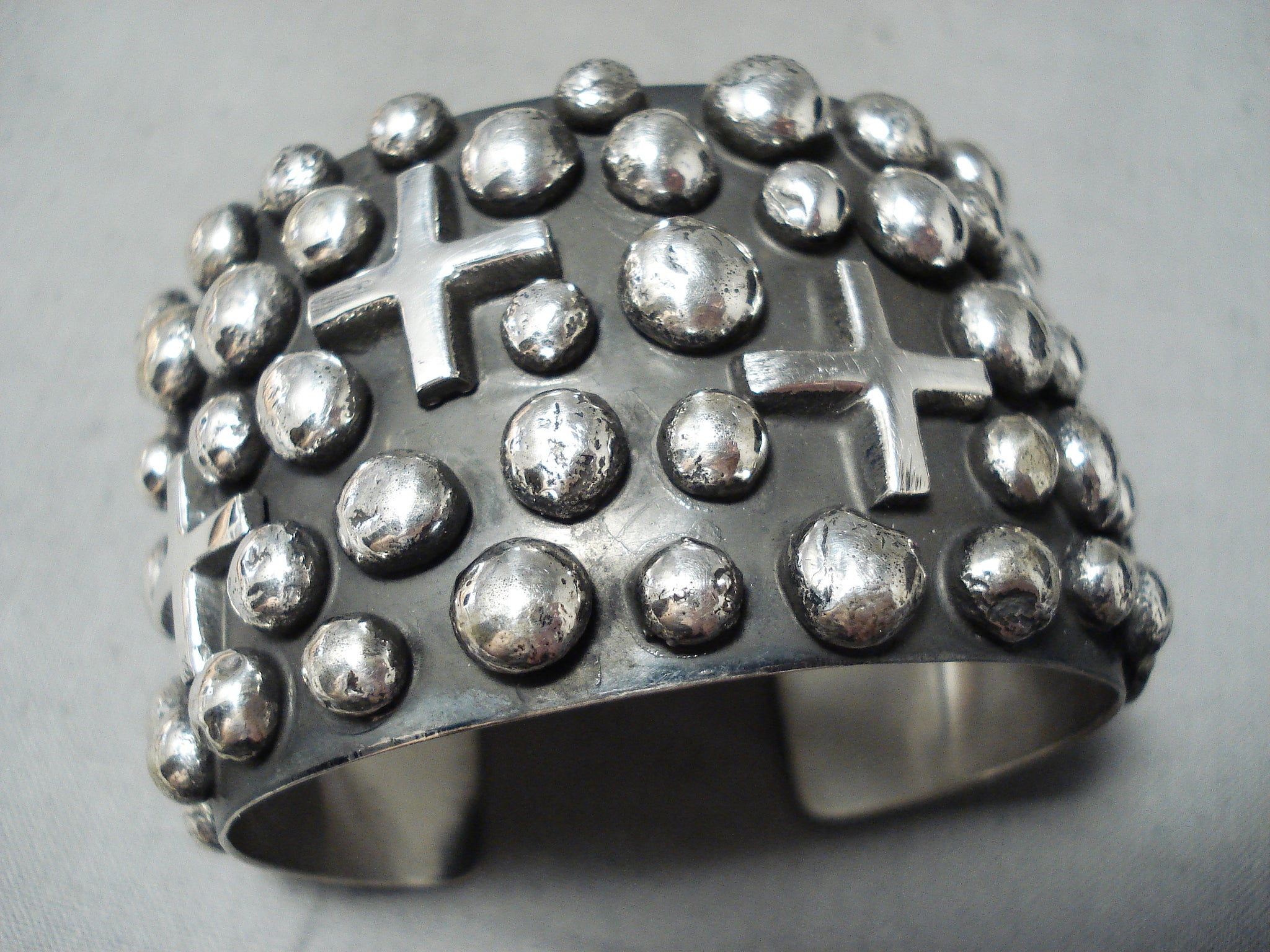 Signed Astounding Native American Navajo Sterling Silver Cross Bracelet