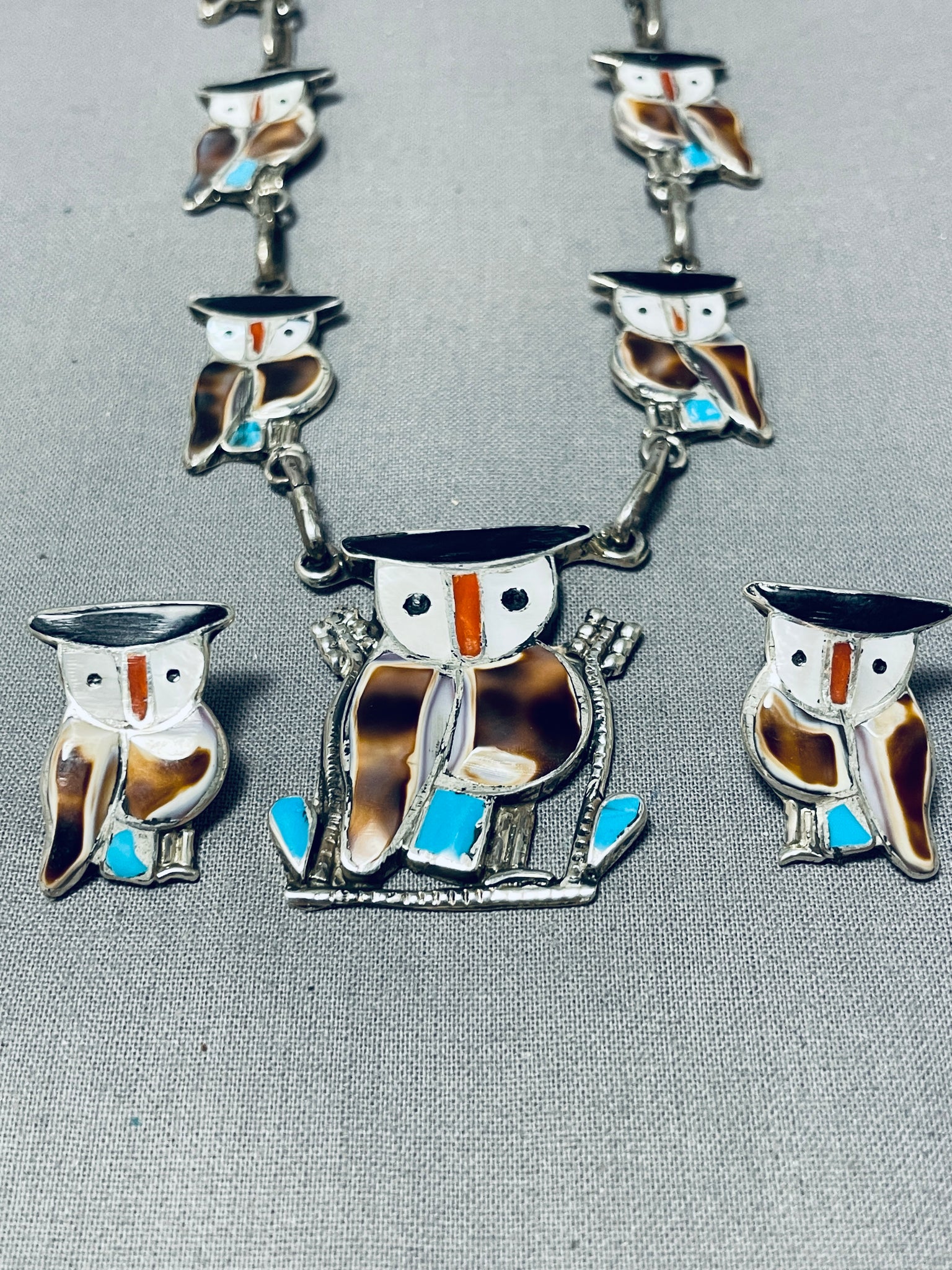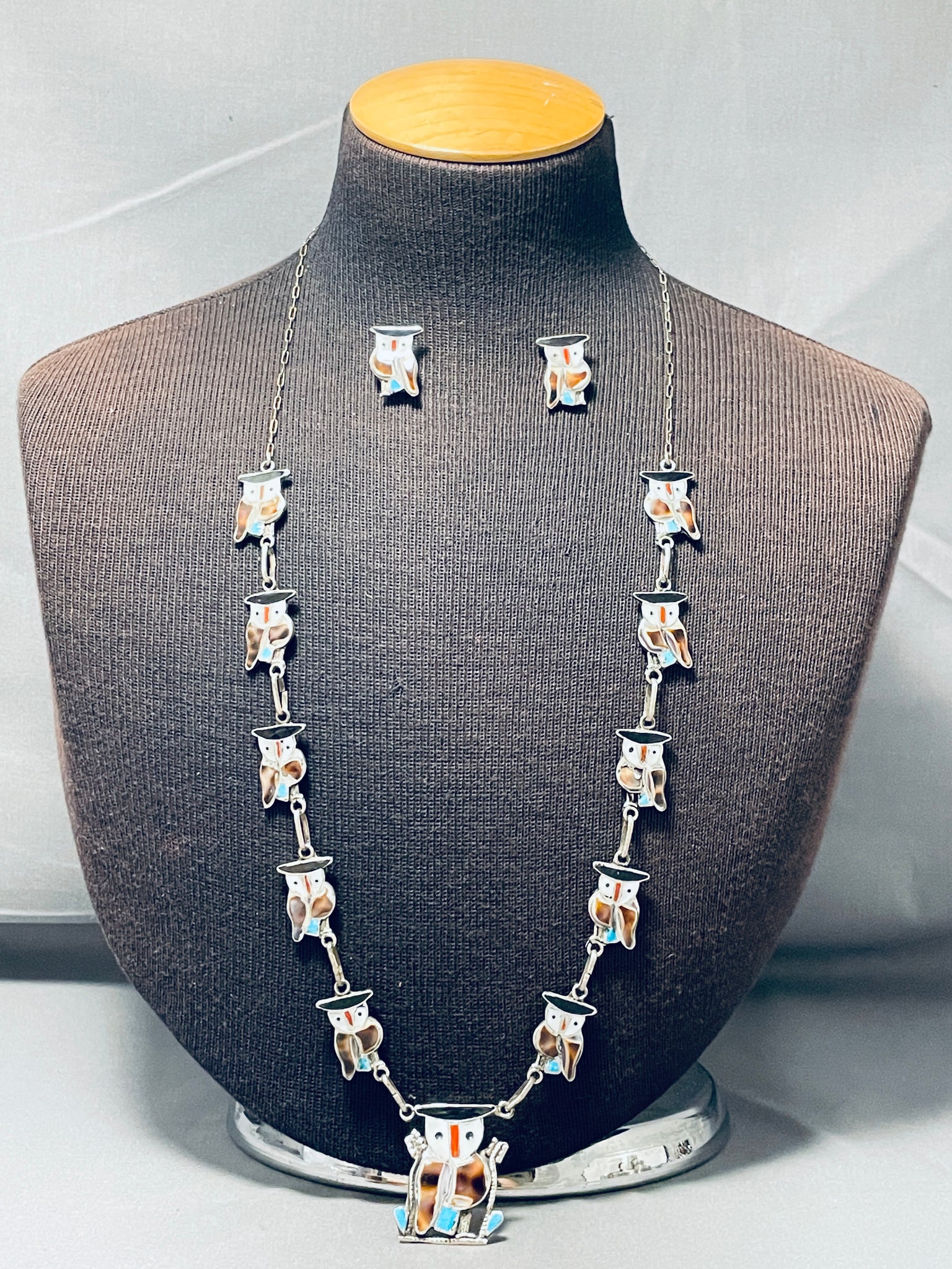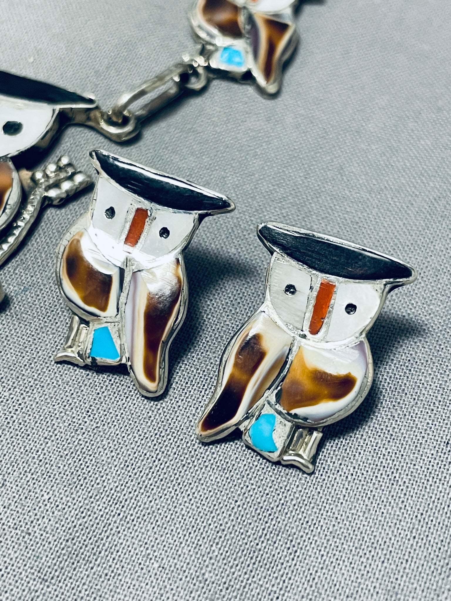 Signed Native American Zuni Turquoise Sterling Silver Owl Necklace And Earring Set