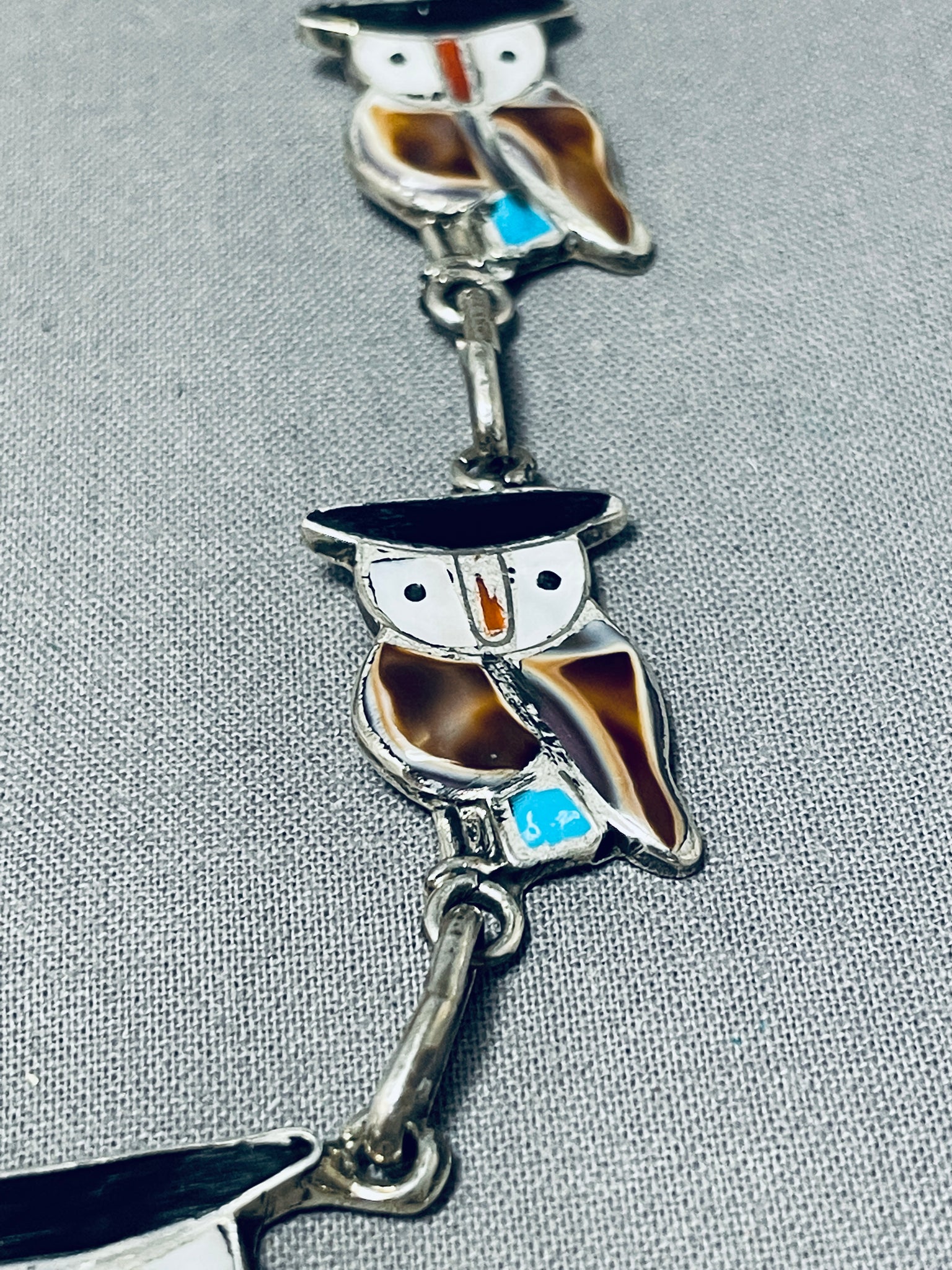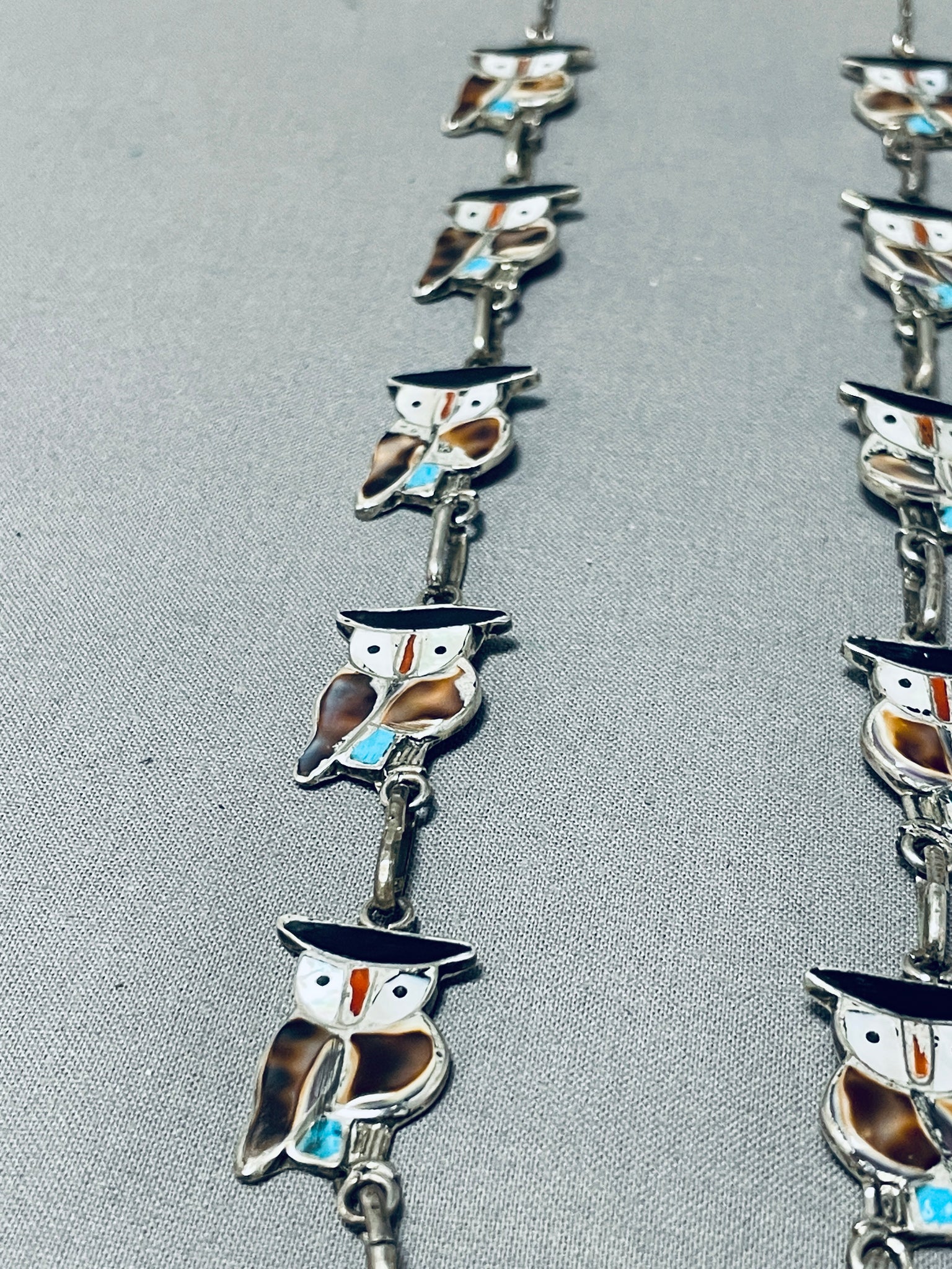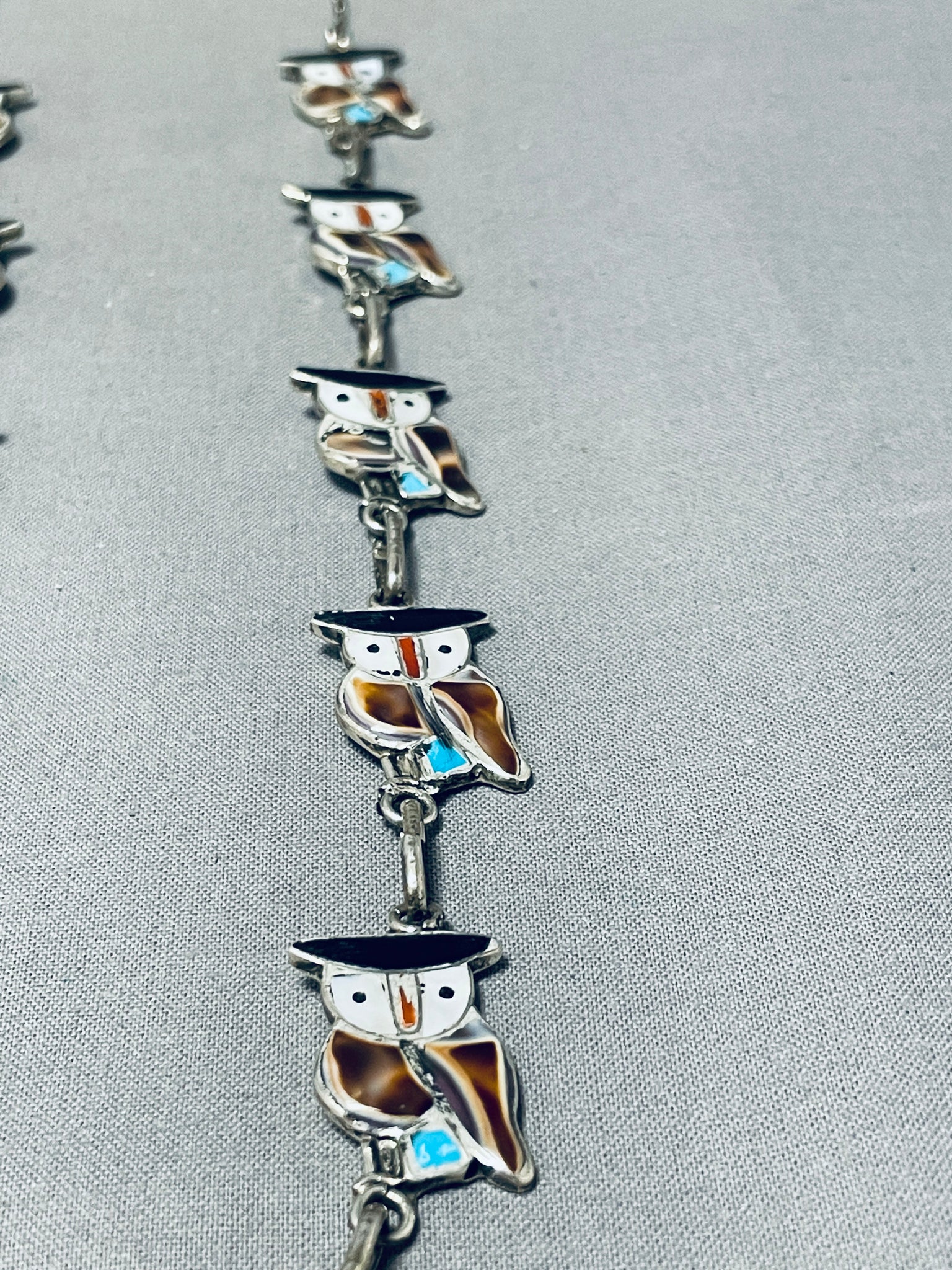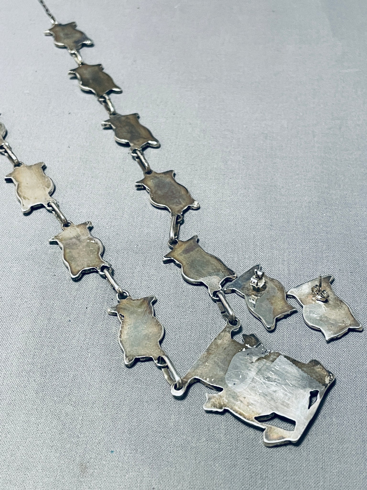 Signed Native American Zuni Turquoise Sterling Silver Owl Necklace And Earring Set