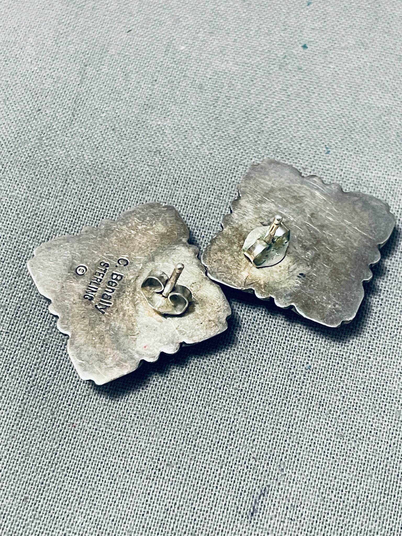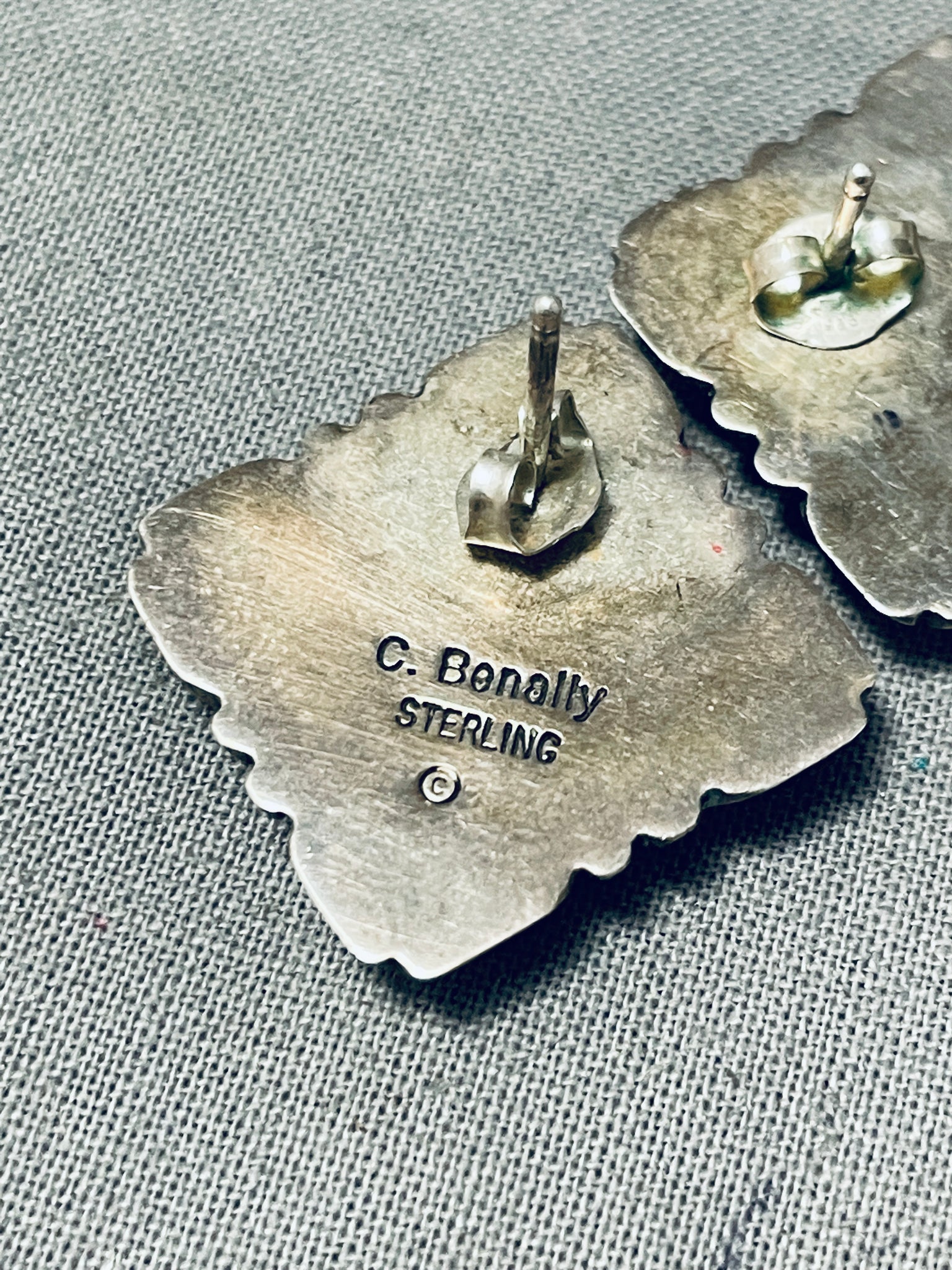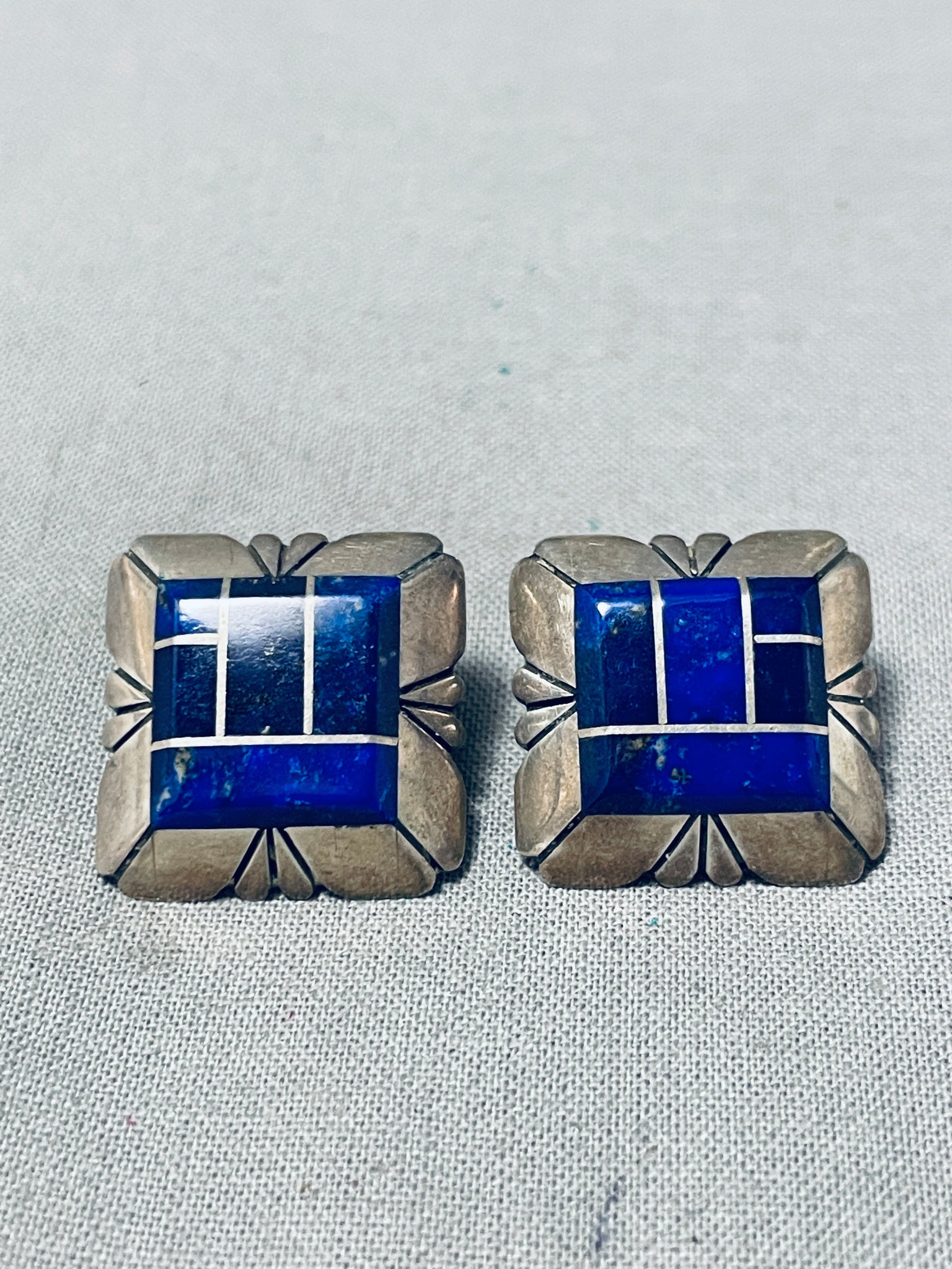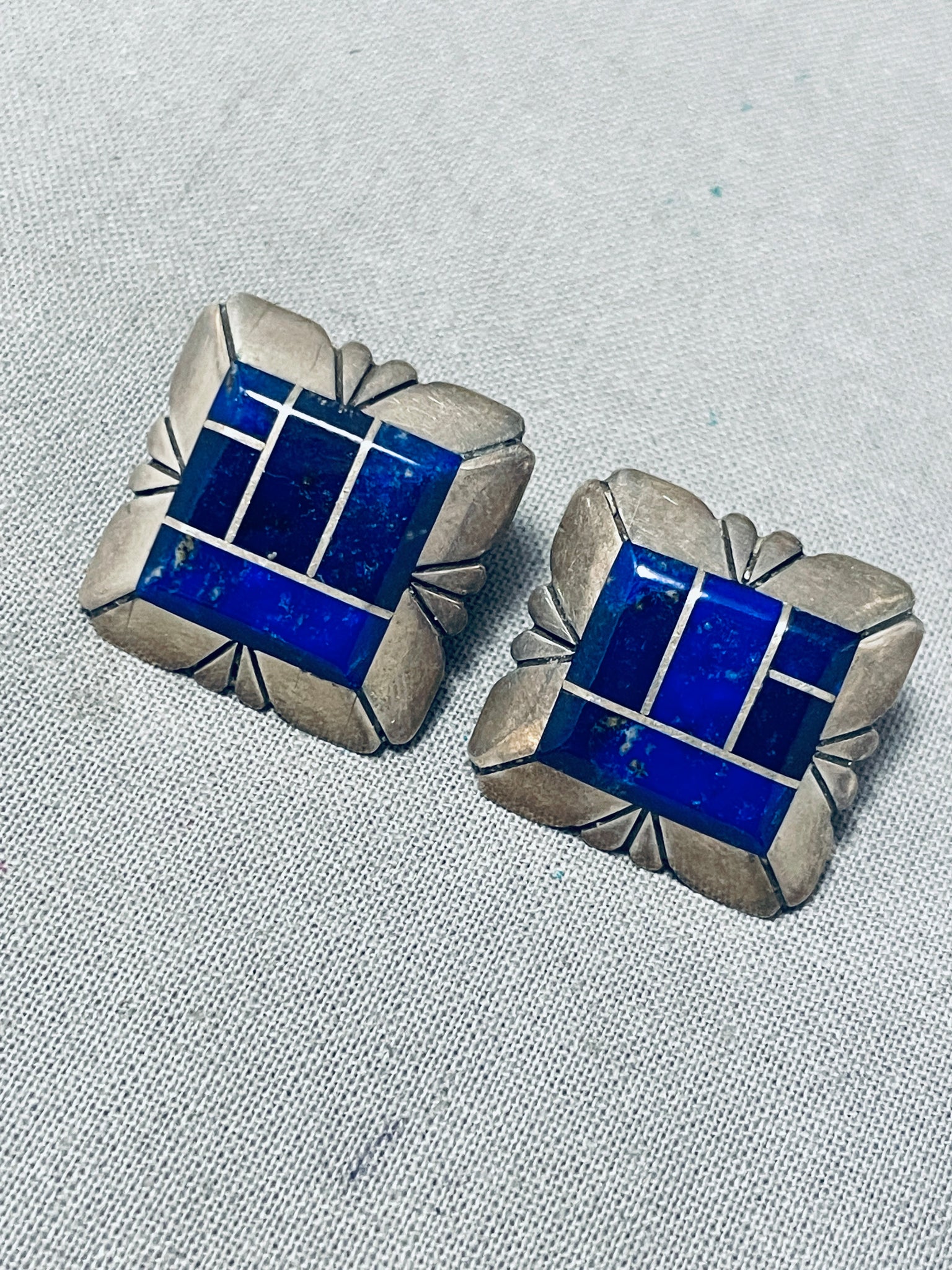Signed Vintage Native American Navajo Lapis Inlay Sterling Silver Earrings