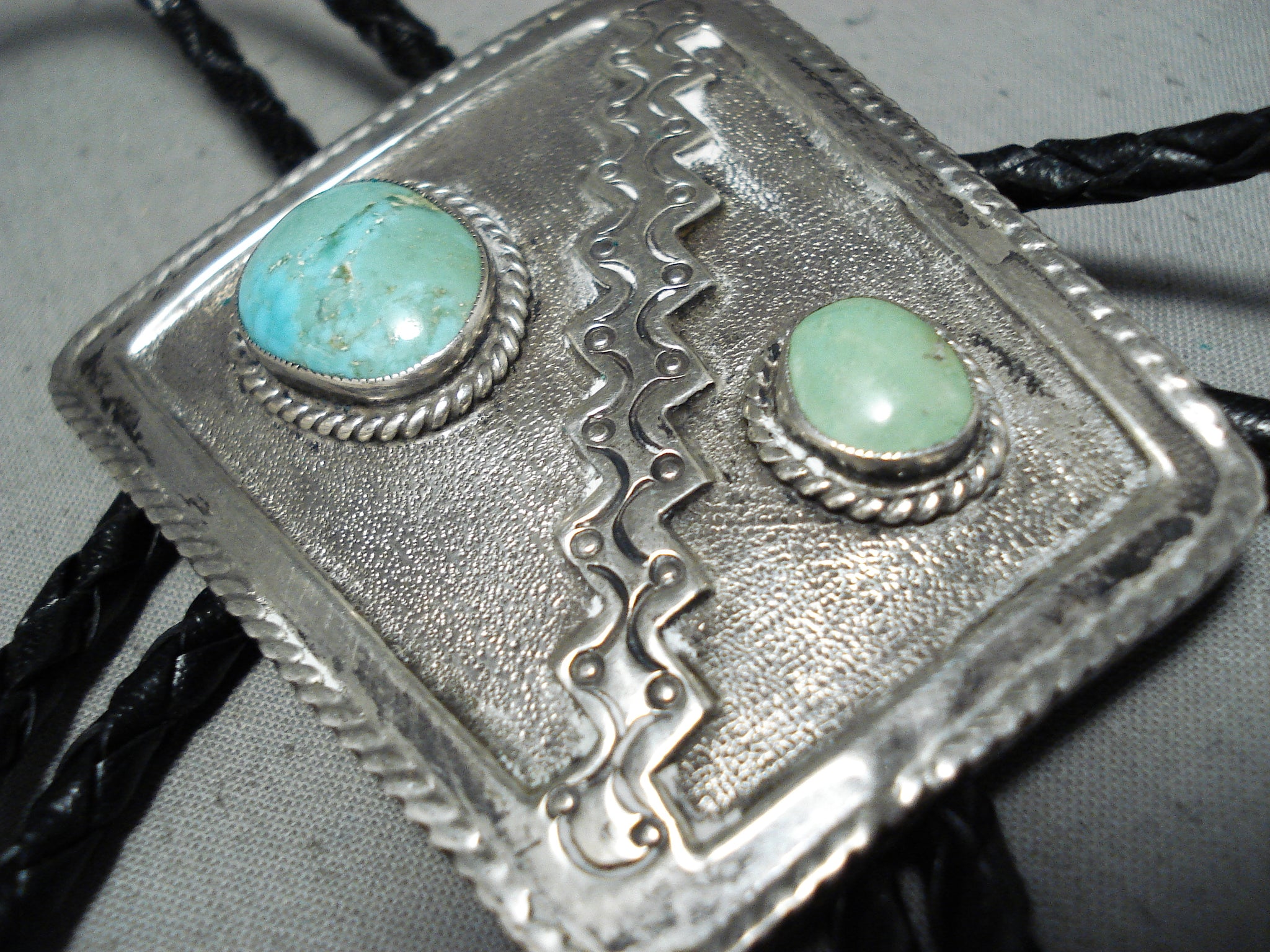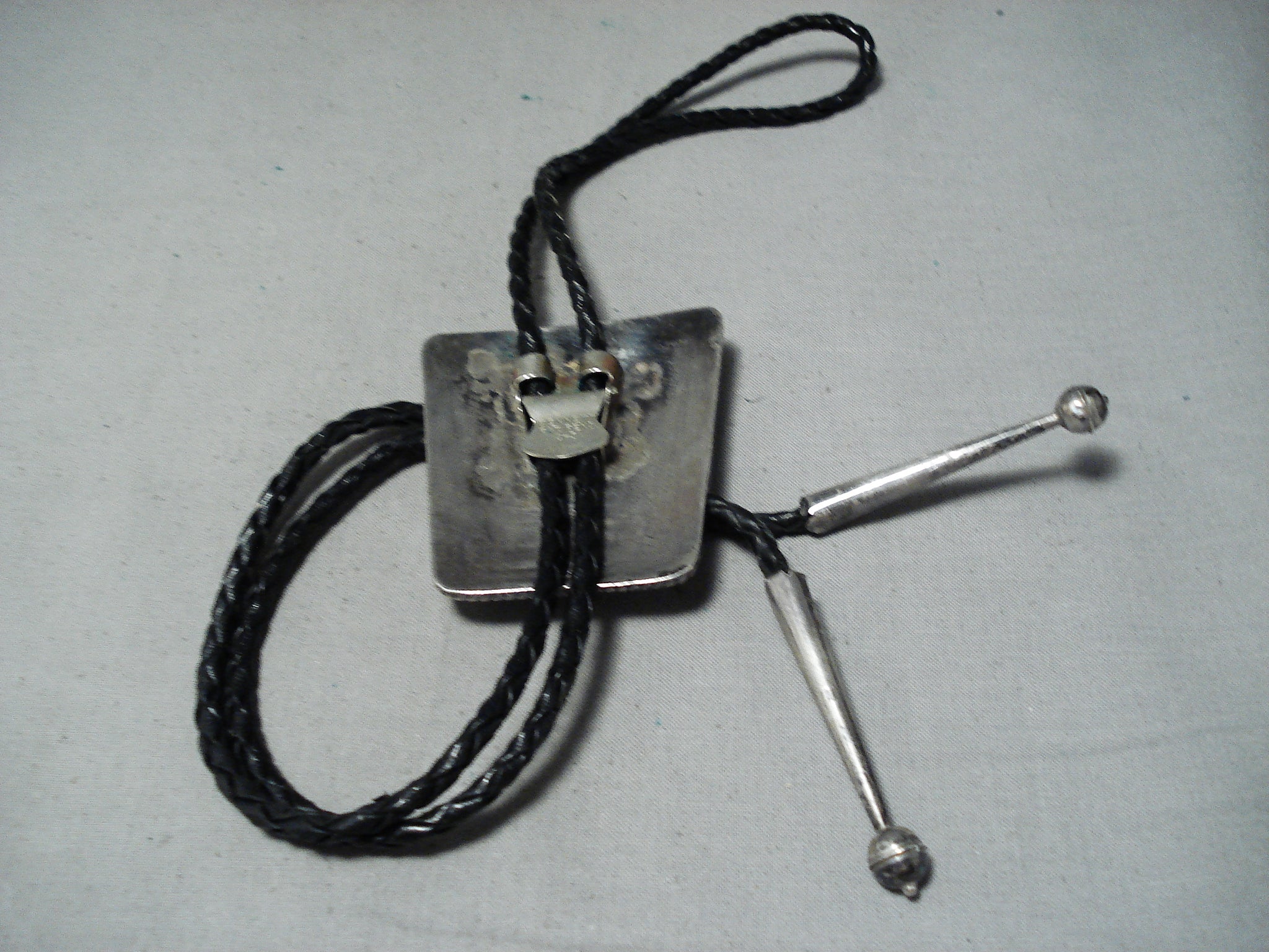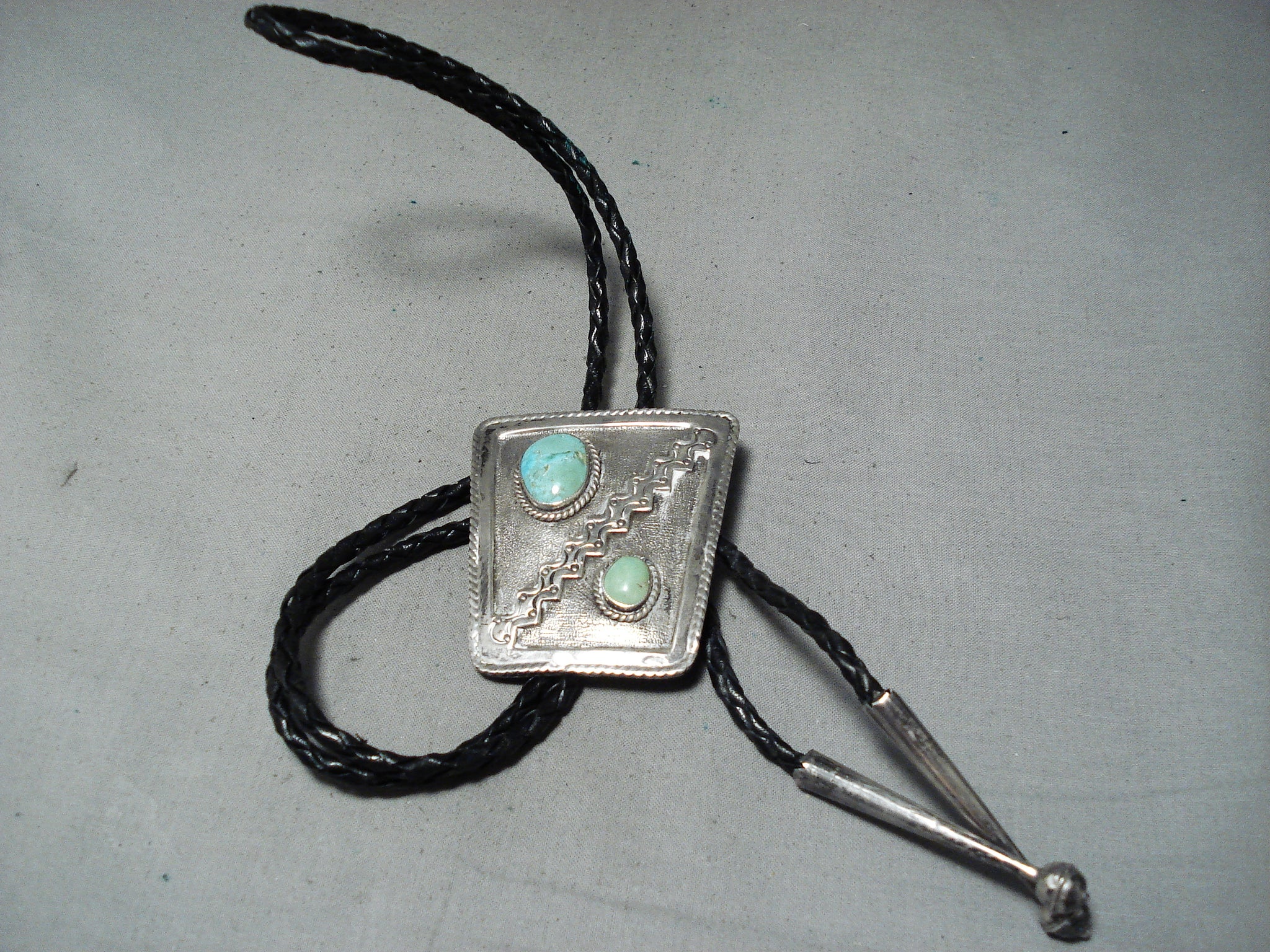 Signed Vintage Native American Navajo Pilot Mountain Turquoise Sterling Silver Bolo Tie