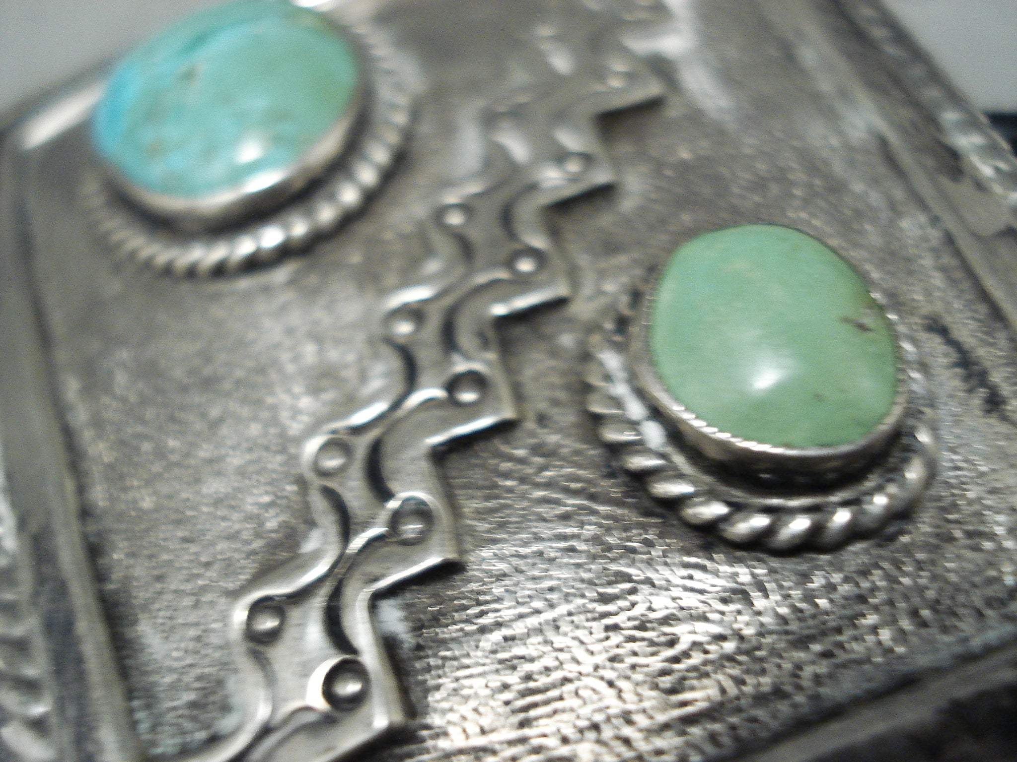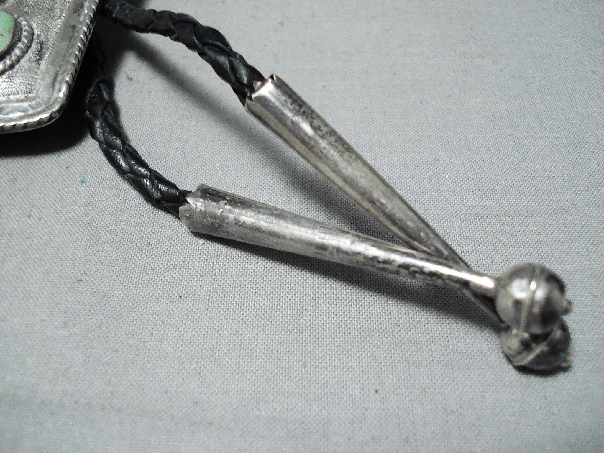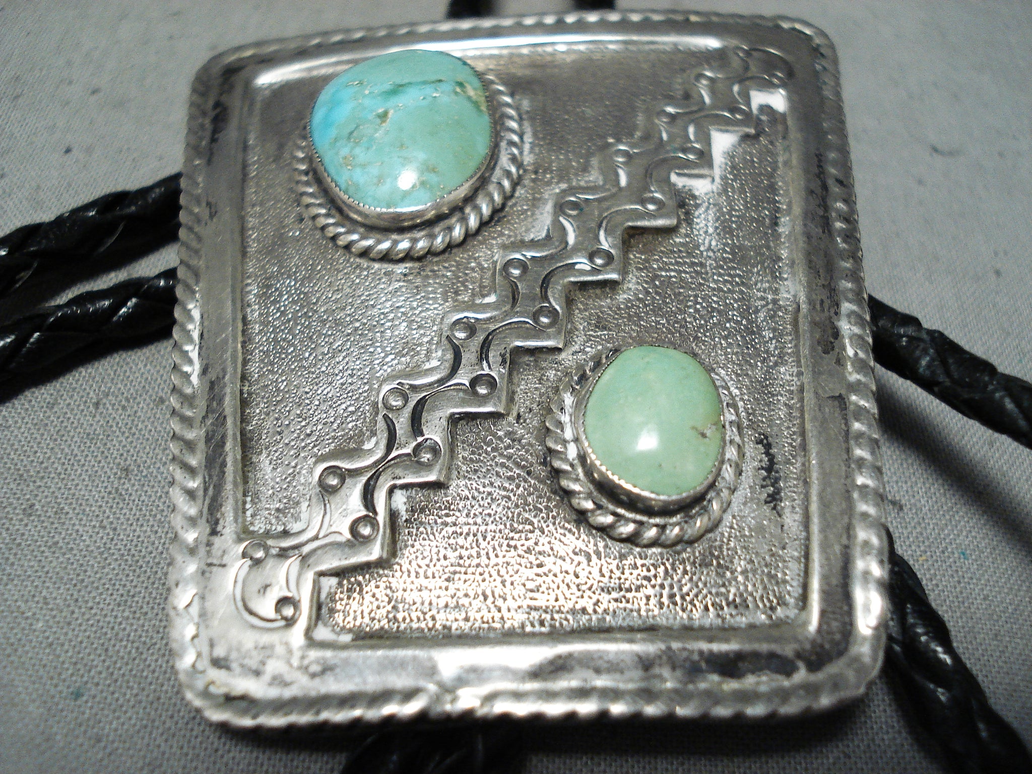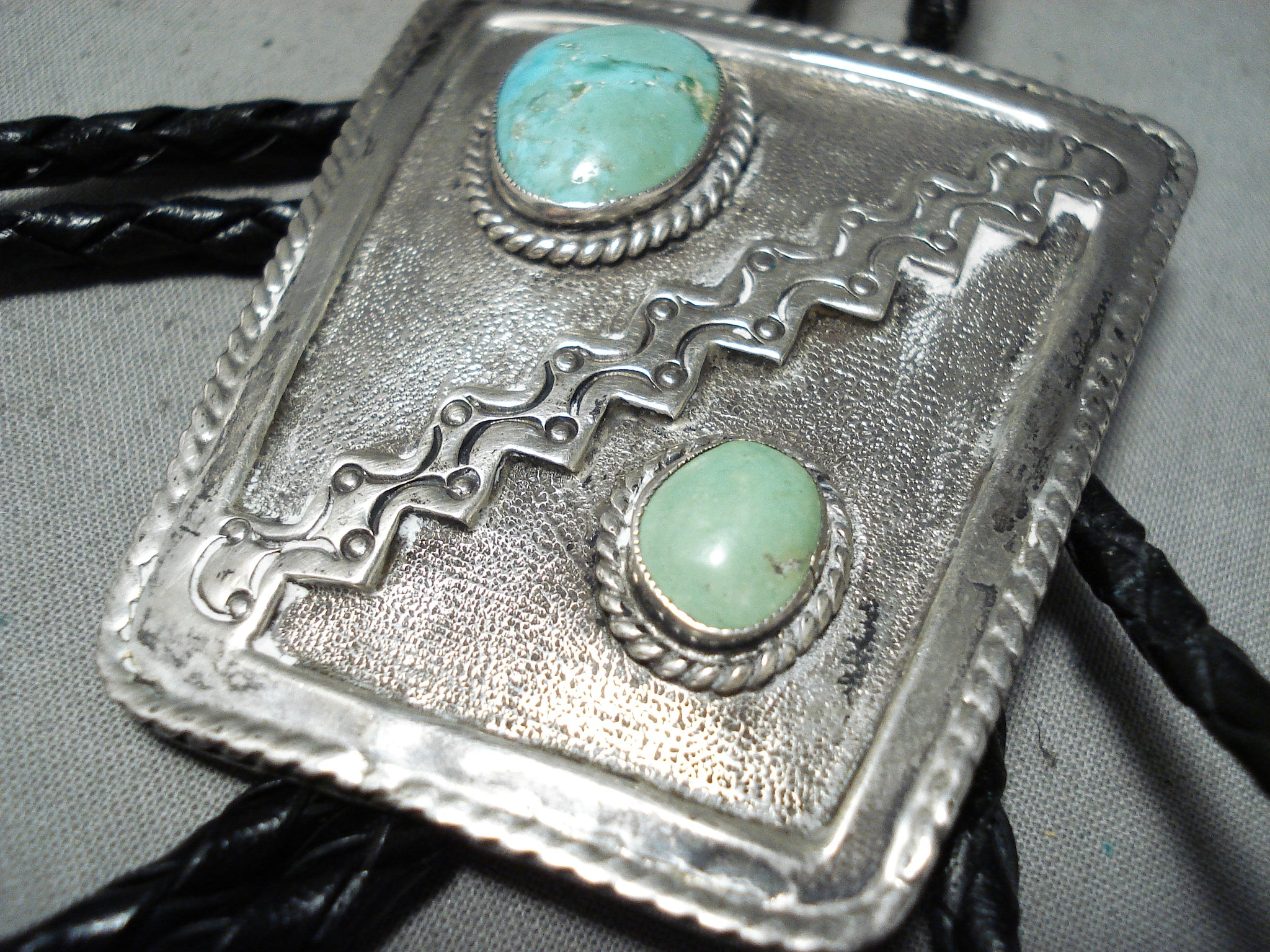 Signed Vintage Native American Navajo Pilot Mountain Turquoise Sterling Silver Bolo Tie