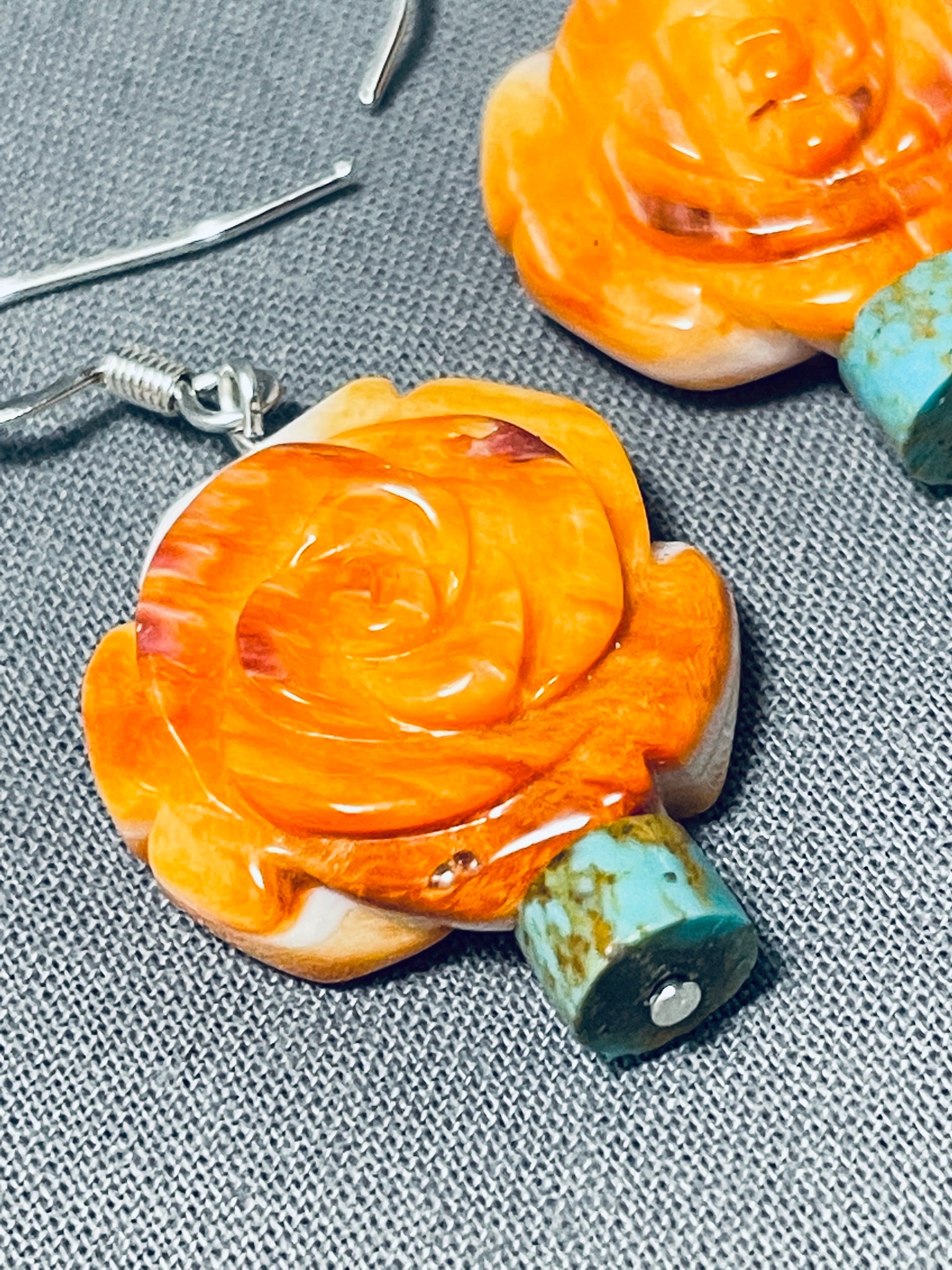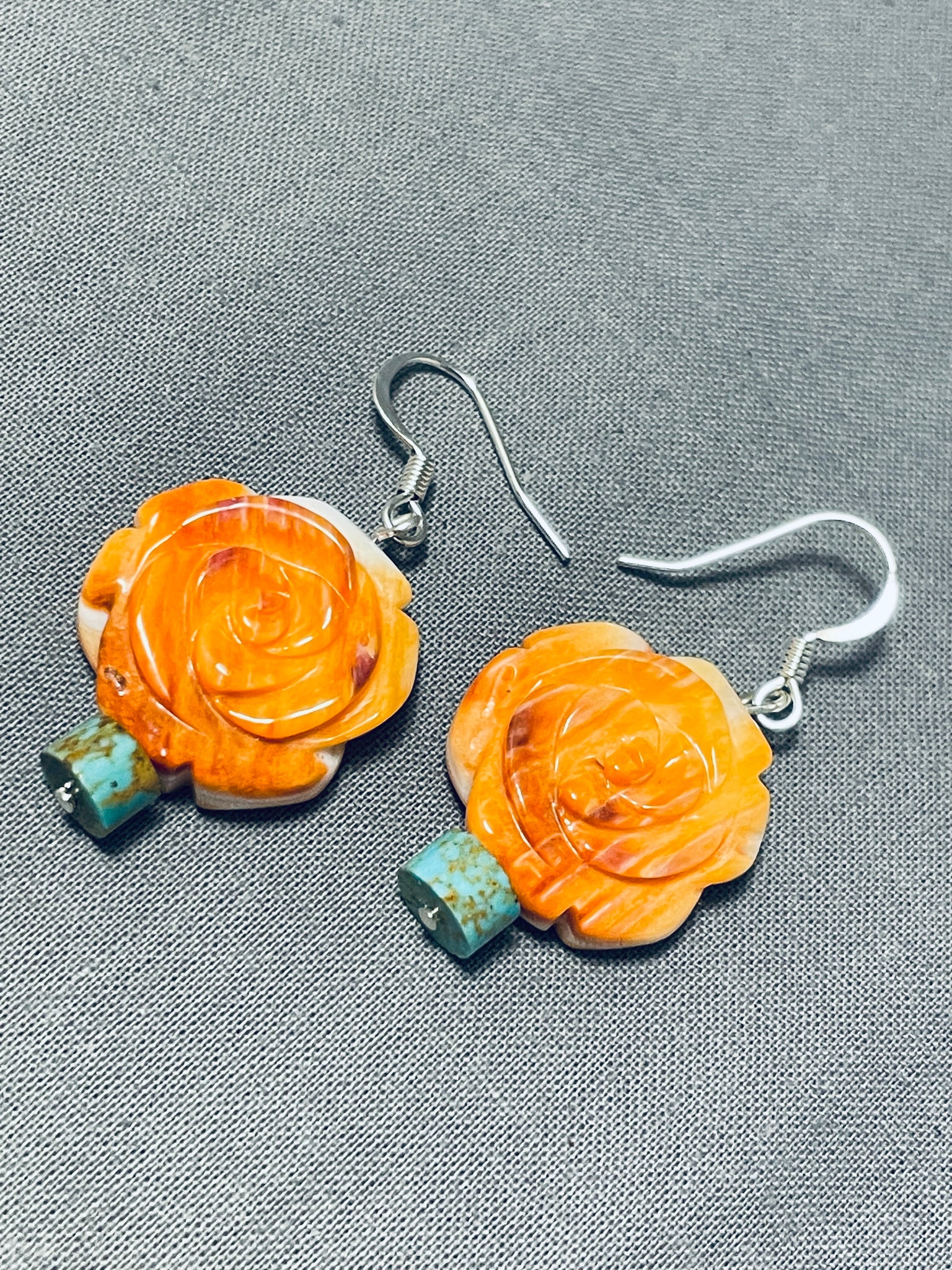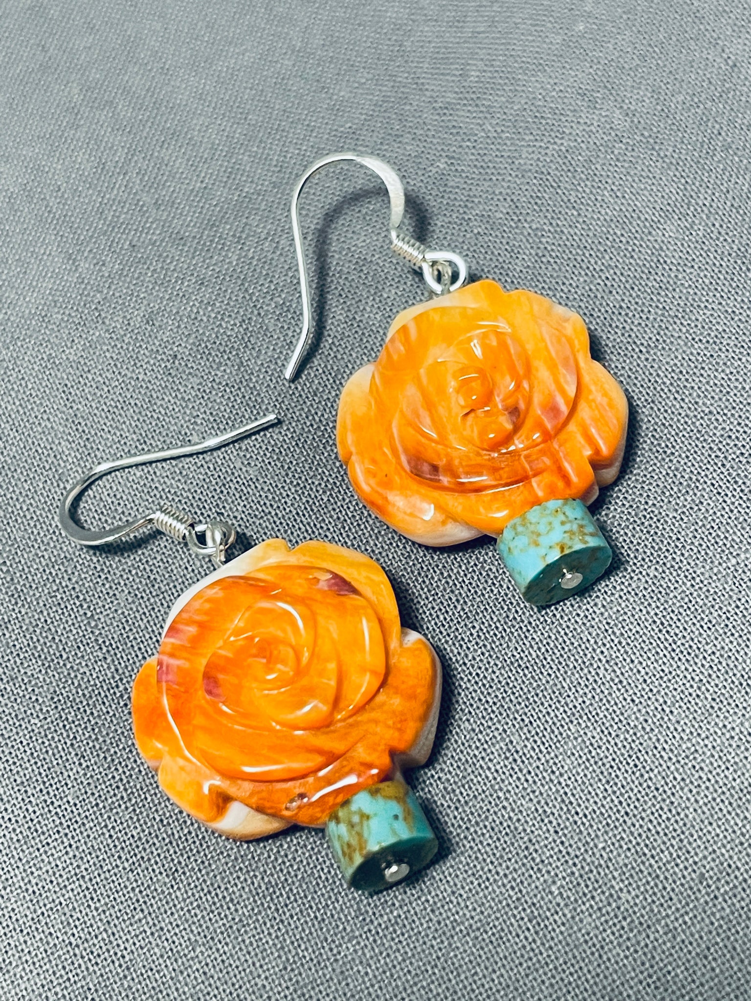 Up for sale is this remarkable Navajo silver pair of earrings. Each of the vibrant spiny oyster "roses" of these pierced wire dangle earrings have a turquoise stone at the base, creating a truly unique pair of earrings! So Fine! Sterling silver. Each earring measures 1-5/8" long and 3/4" wide. The earrings weigh around 10 grams.