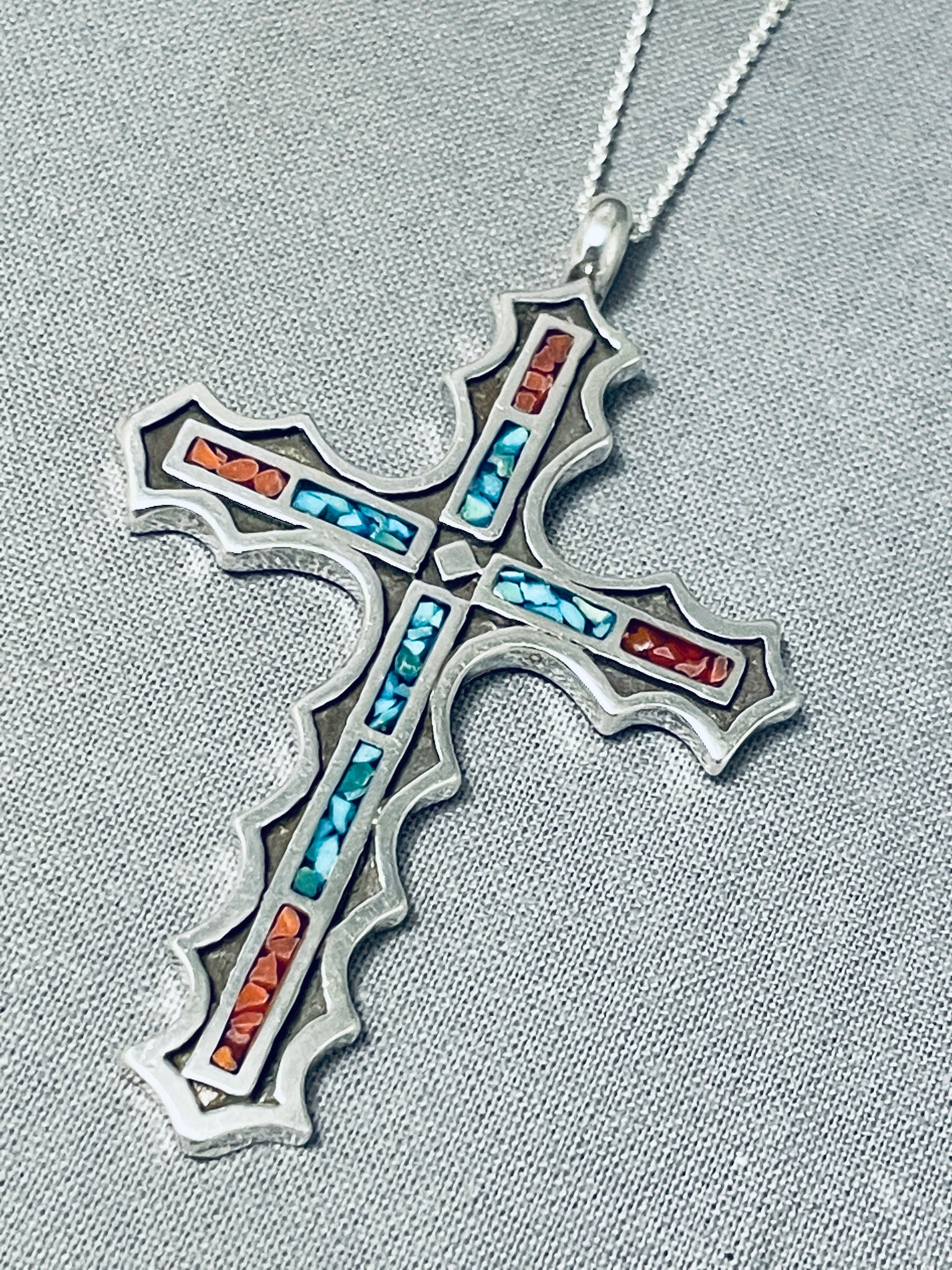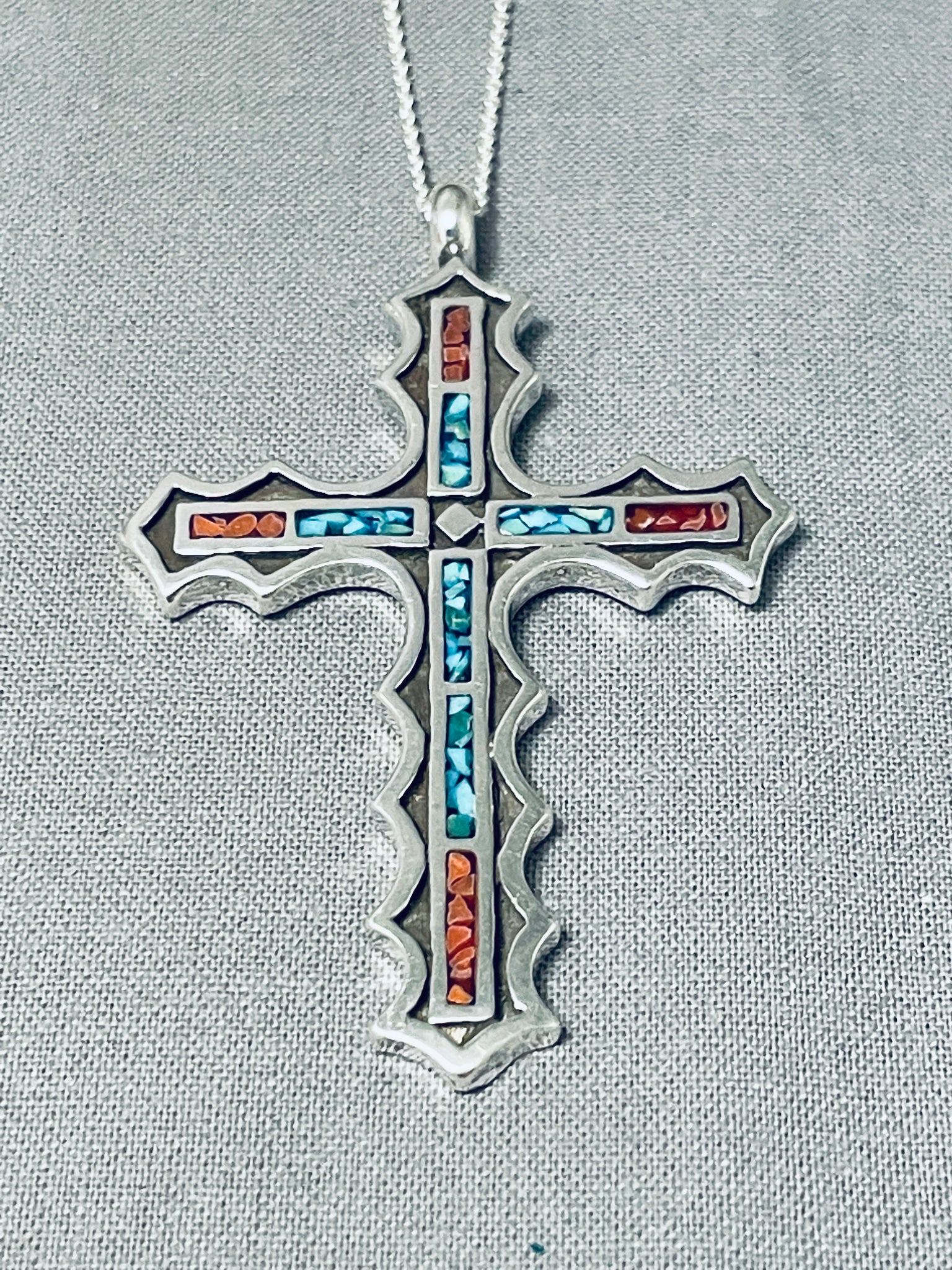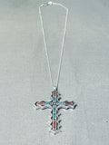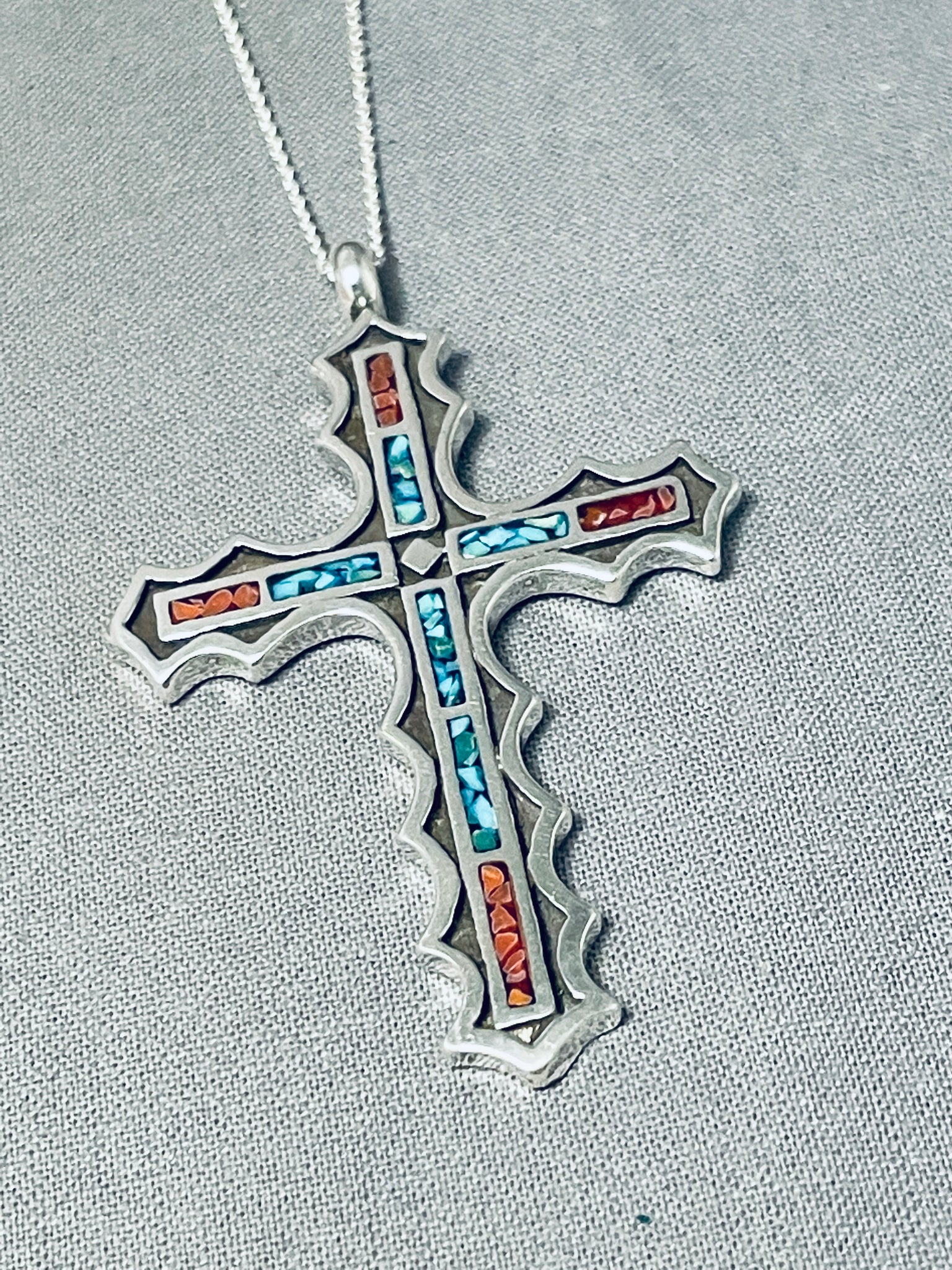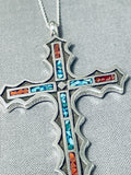 Striking Native American Navajo Turquoise And Coral Sterling Silver Cross Necklace