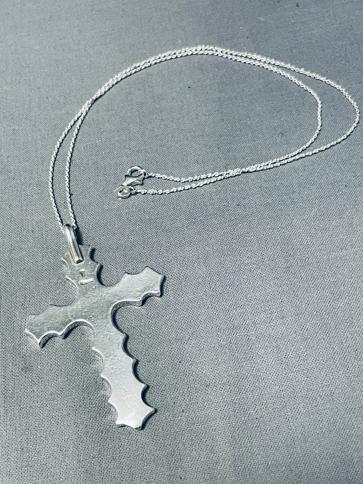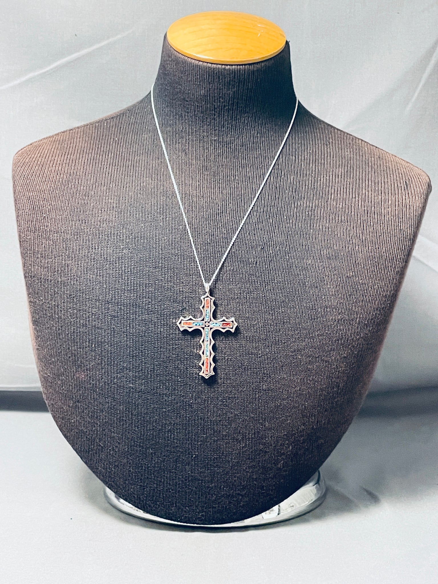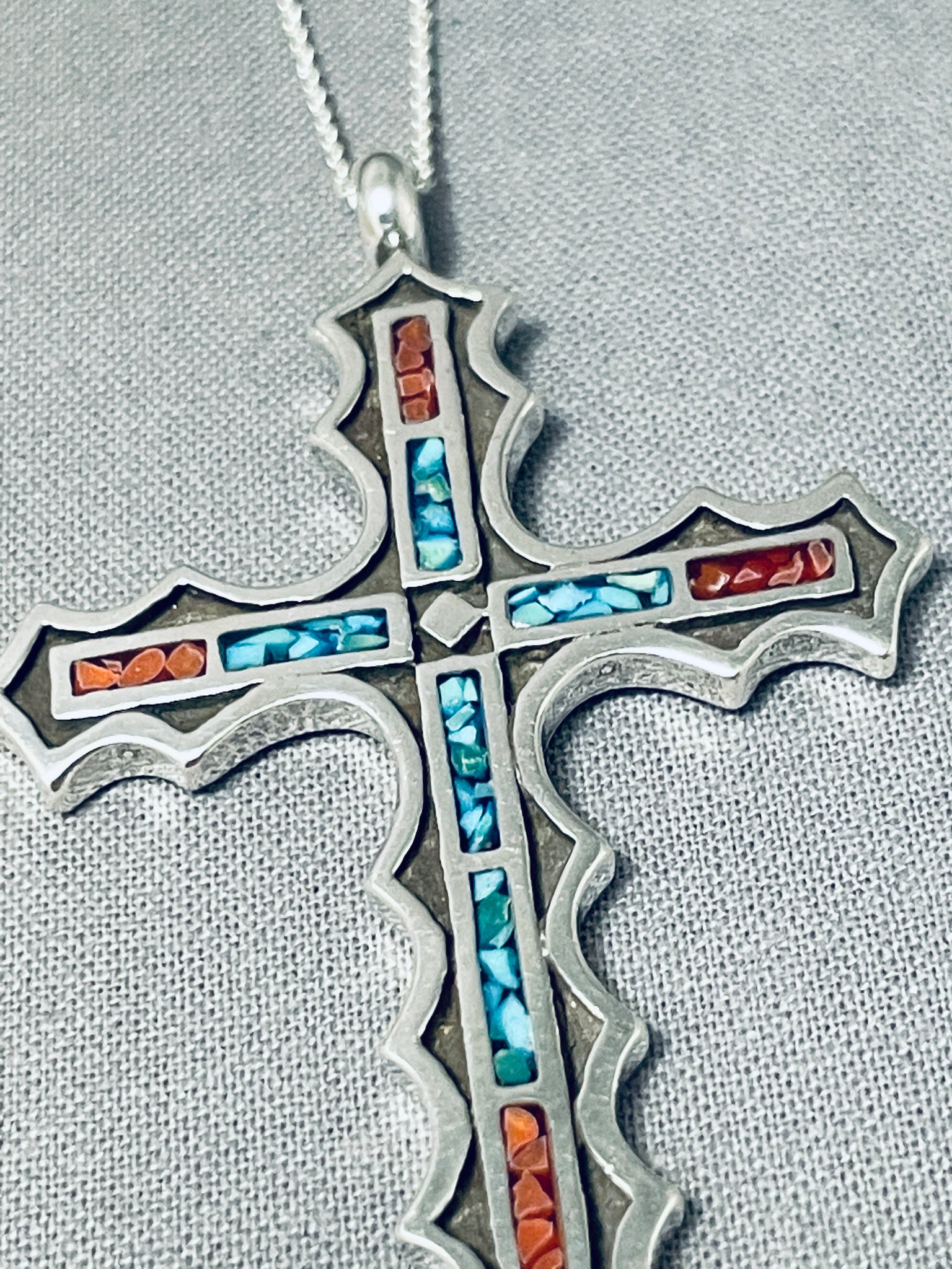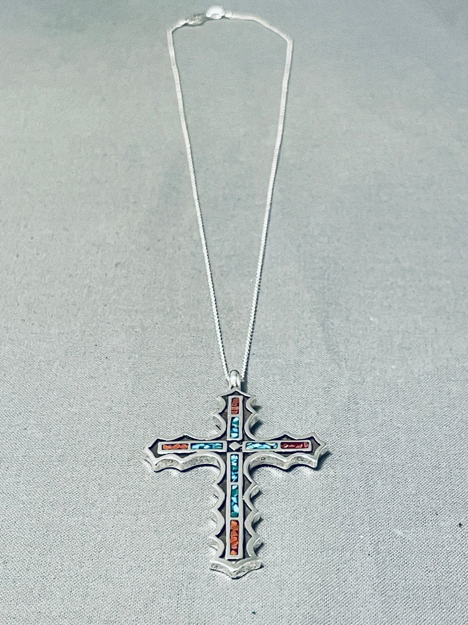 Striking Native American Navajo Turquoise And Coral Sterling Silver Cross Necklace