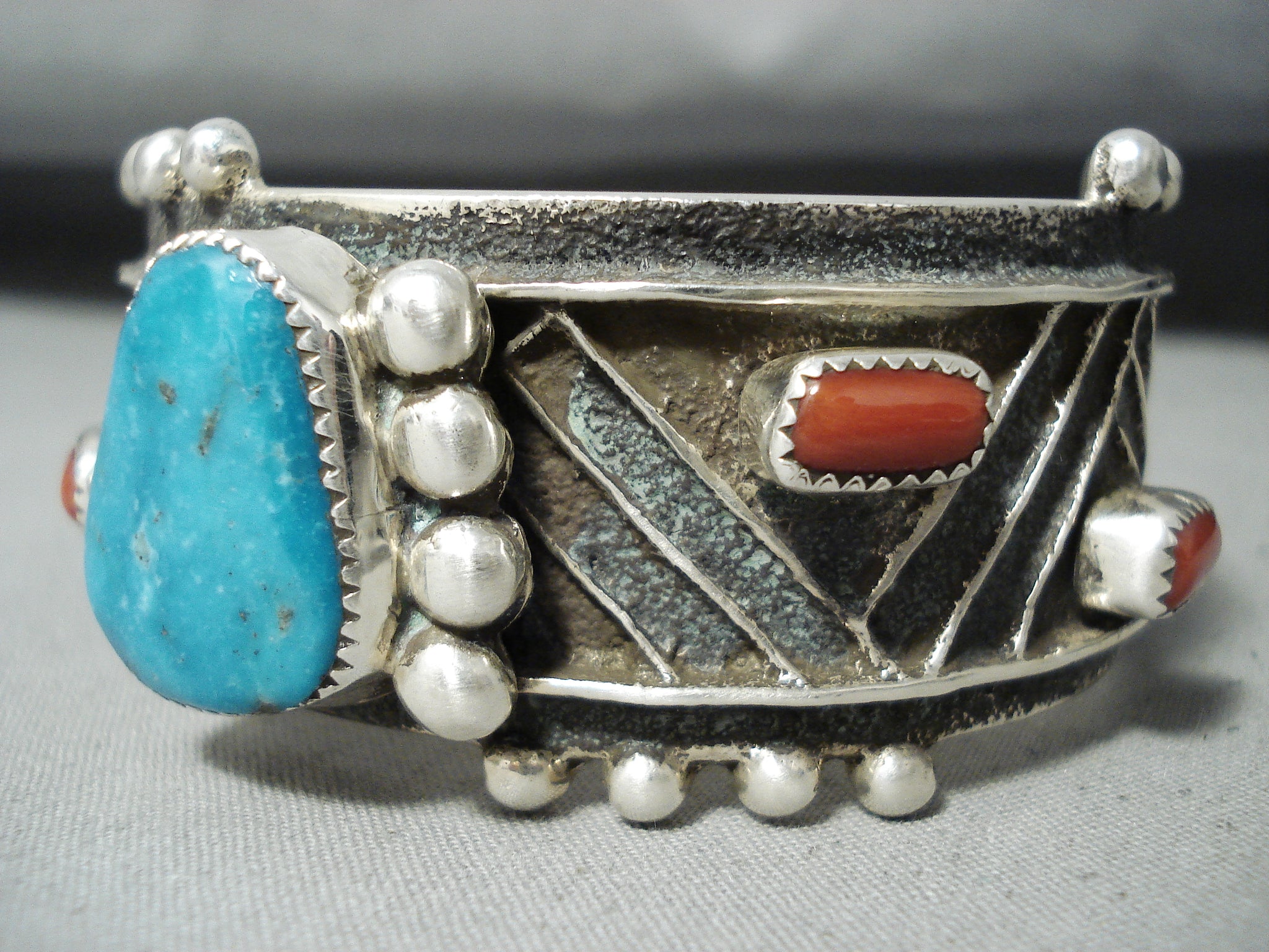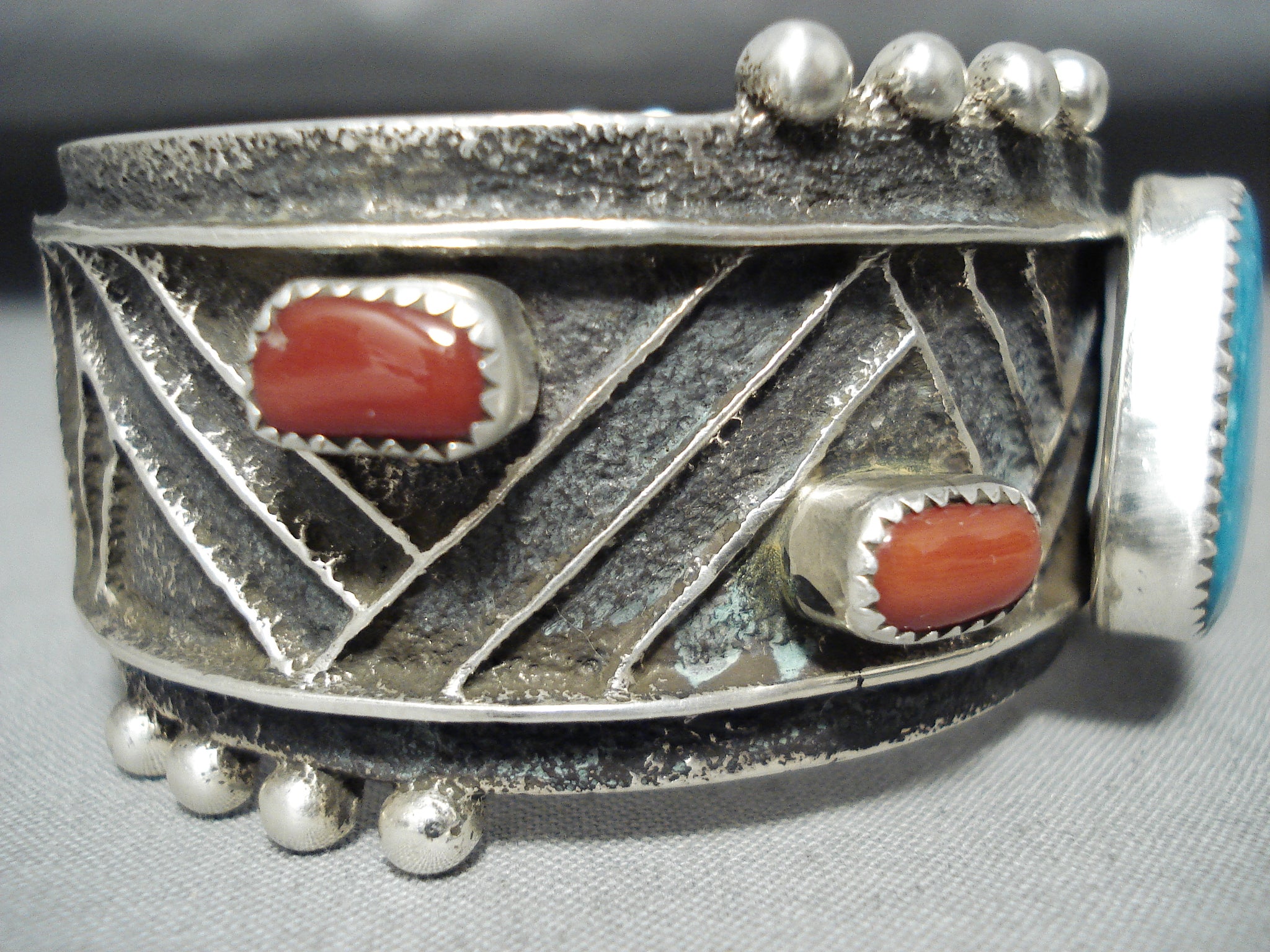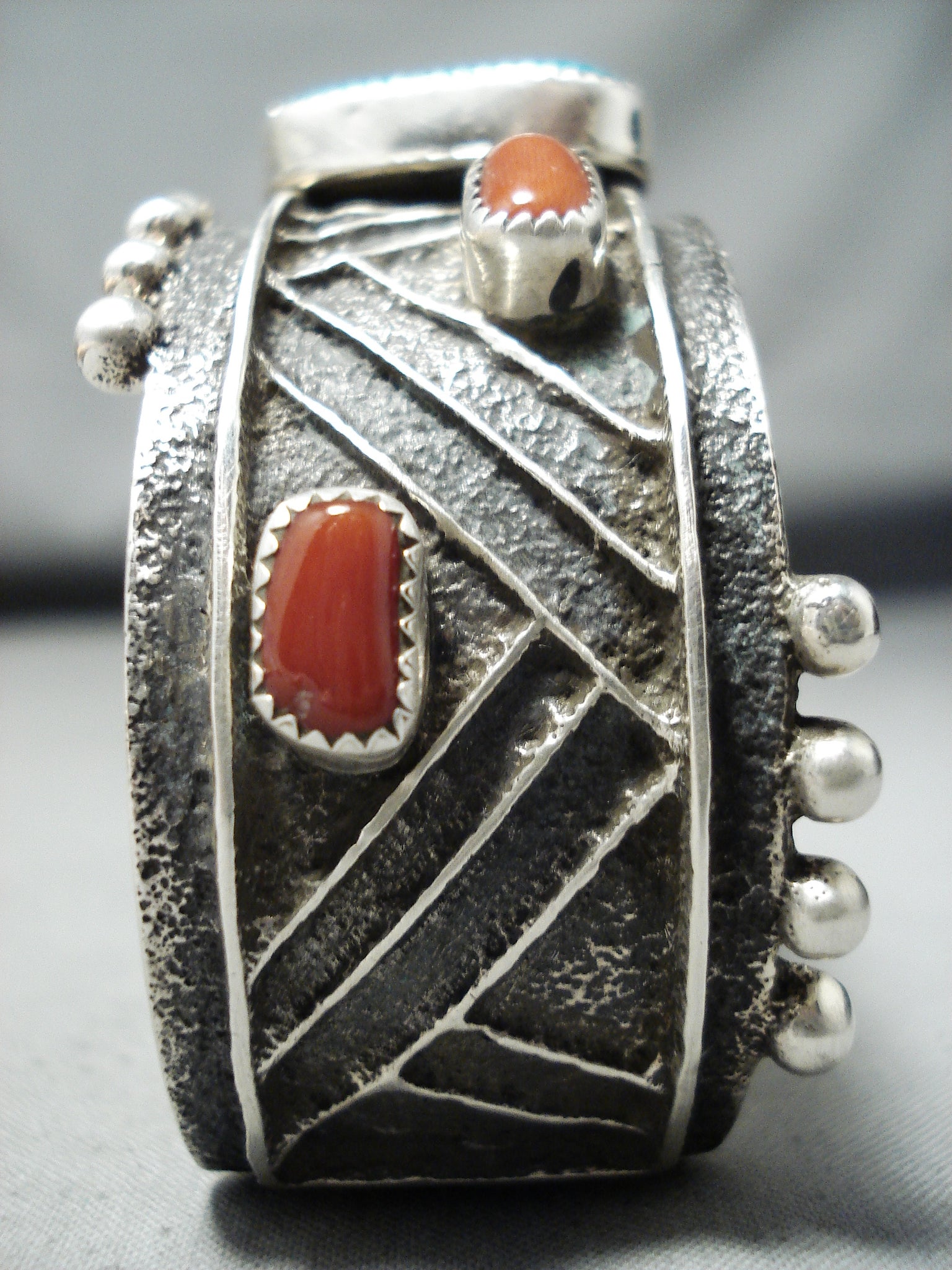 Stunning Arviso Native American Navajo Turquoise Coral Sterling Silver Bracelet