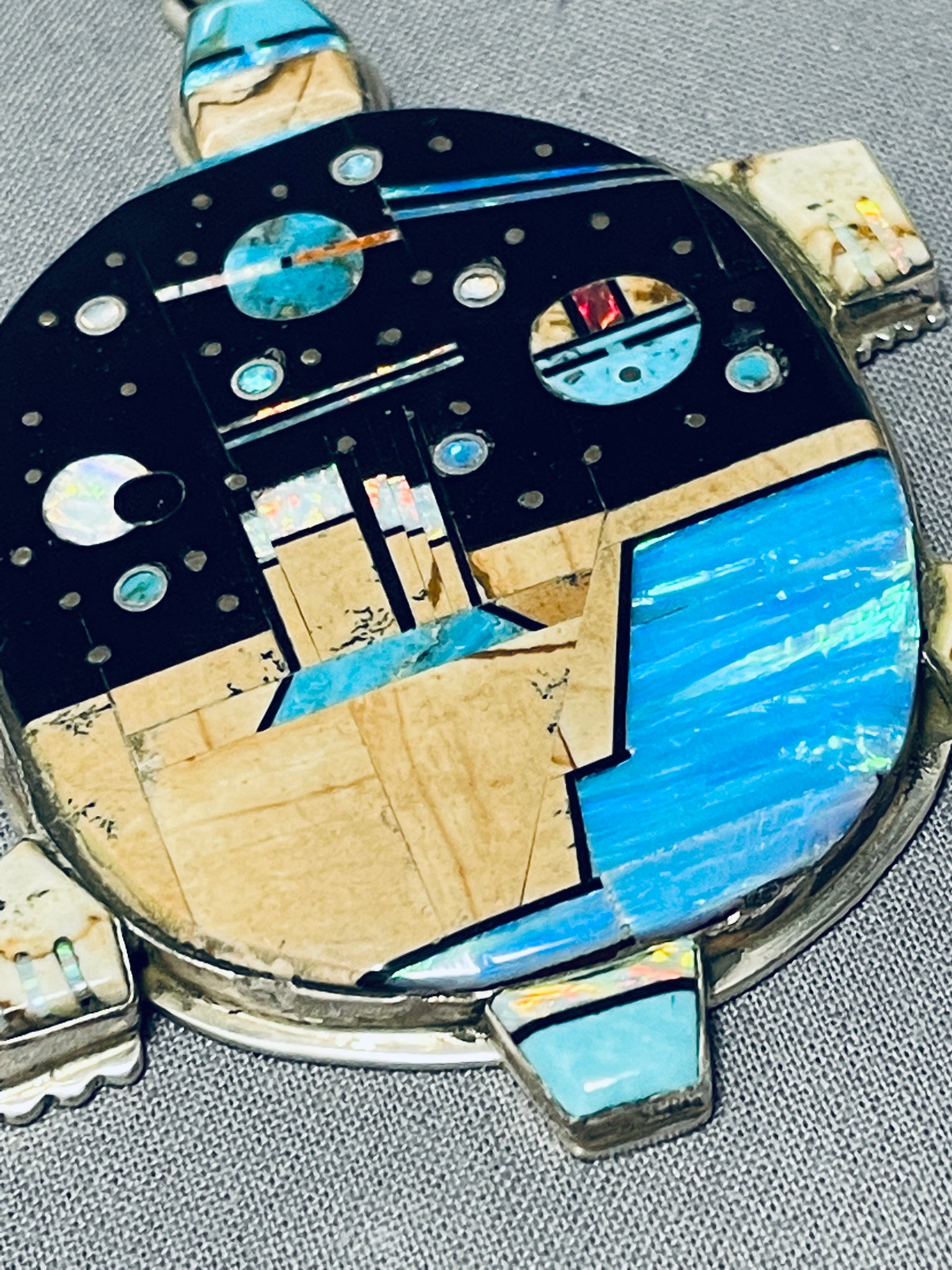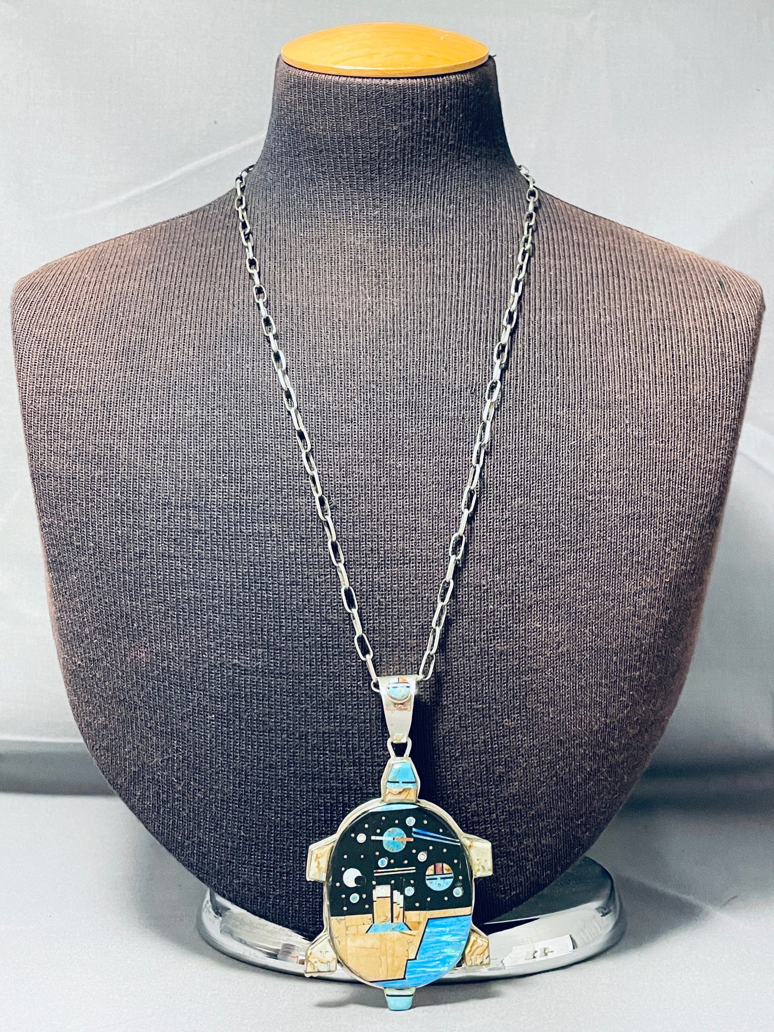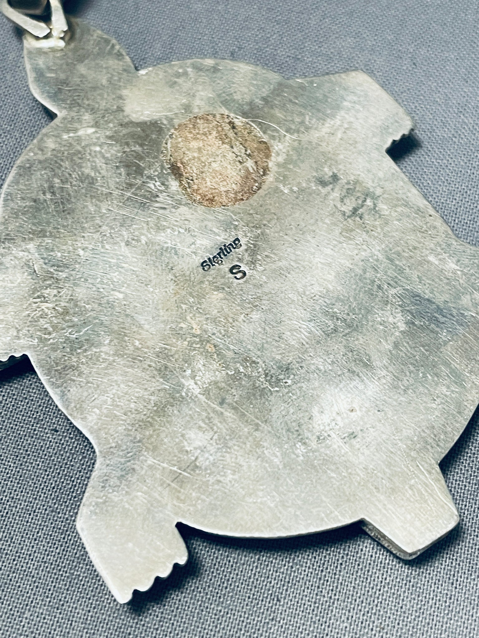 Symbolic Turtle Native American Navajo Turquoise Inlay Stserling Silver Necklace