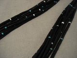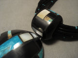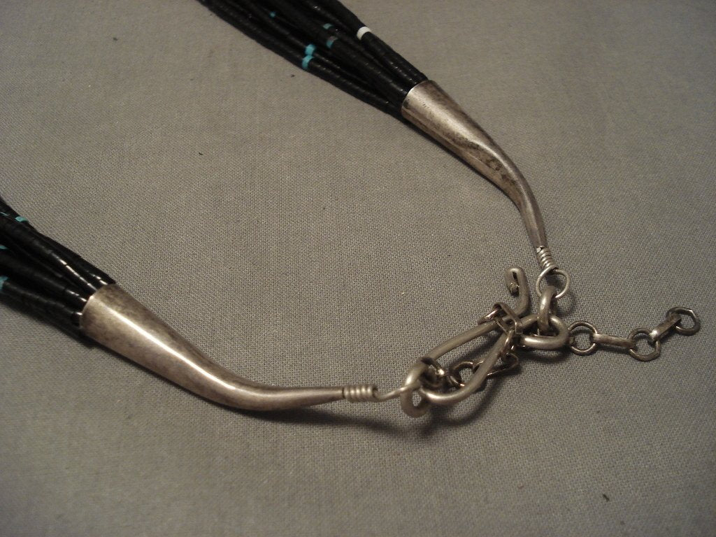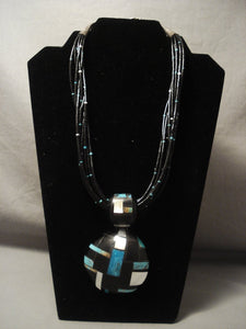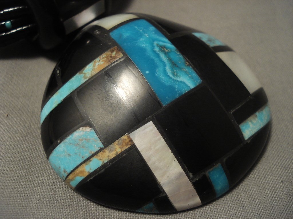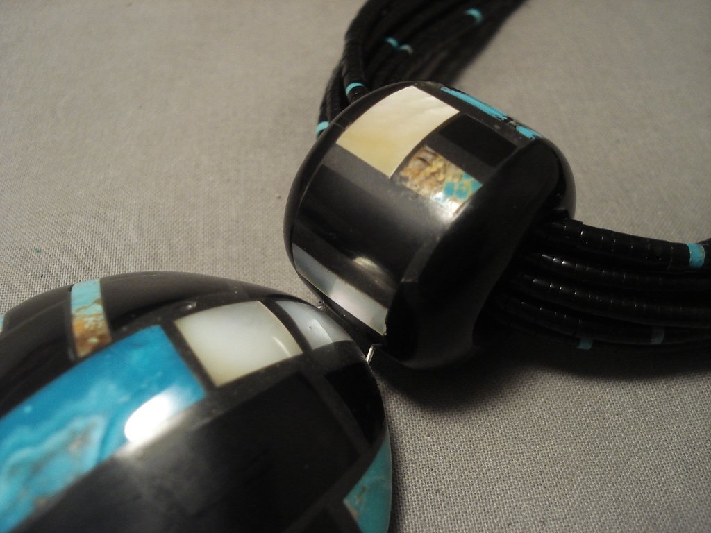 This is a marvelous vintage Santo Domingo important necklace handmade by one of the most talented inlaid artist of the Santo Domingo tribe, Chris Nieto. This piece contains 10 fabulous strands of black trade beads with accenting turquoise and mother of pearl stones. Located on both ends of the piece are two accenting silver cones with a beautiful large tradtional silver clasp. This necklace consists of a huge inlaid shell pendant with a gigantic inlaid bail. The shell measures around 2-1/4" X 2-1/4" not including the large bail. Sterling silver, marked. Cir. 1970's+. Artist Chris Nieto . The length of the necklace measures around 20". Sturdy 81 grams.
