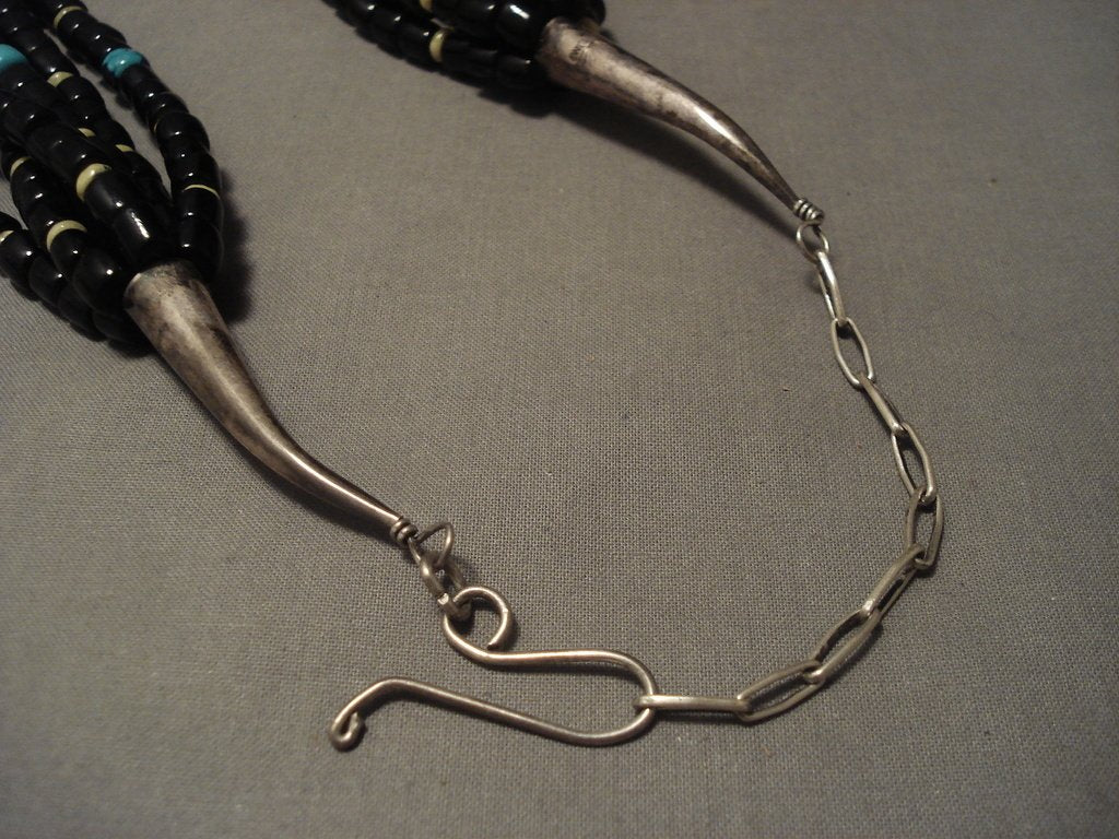 This is a tremendous vintage Santo Domingo jet necklace handmade by one of the most famous inlay artist of our time, Chris Nieto. Situated throughout the piece is fabulous Easter Blue turquoise and fascinating gaspeite stones with accenting beautiful jet stones. The stones rest upon 6 wonderful strands. Check out those marvelous handmade silver cones with a traditional silver clasp. The beautiful inlaid pendant at the bottom measures around 2-1/4" in diameter. Sterling silver, marked. Cir. 1980's+. Signed by Santo Domigo artist Chris Nieto. The length of the necklace measures around 20". Sturdy 136 grams.