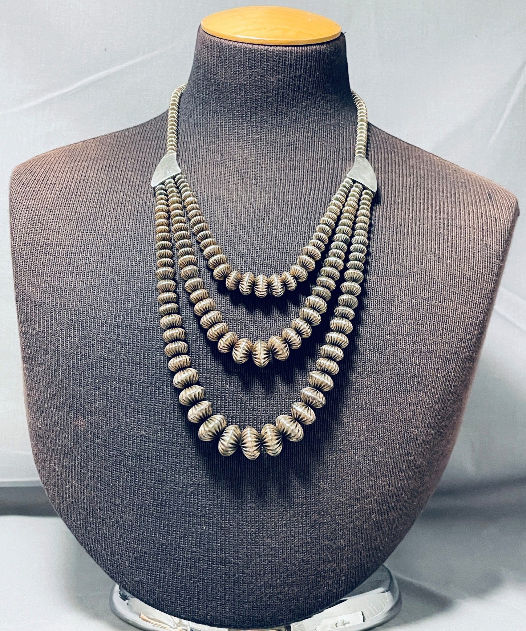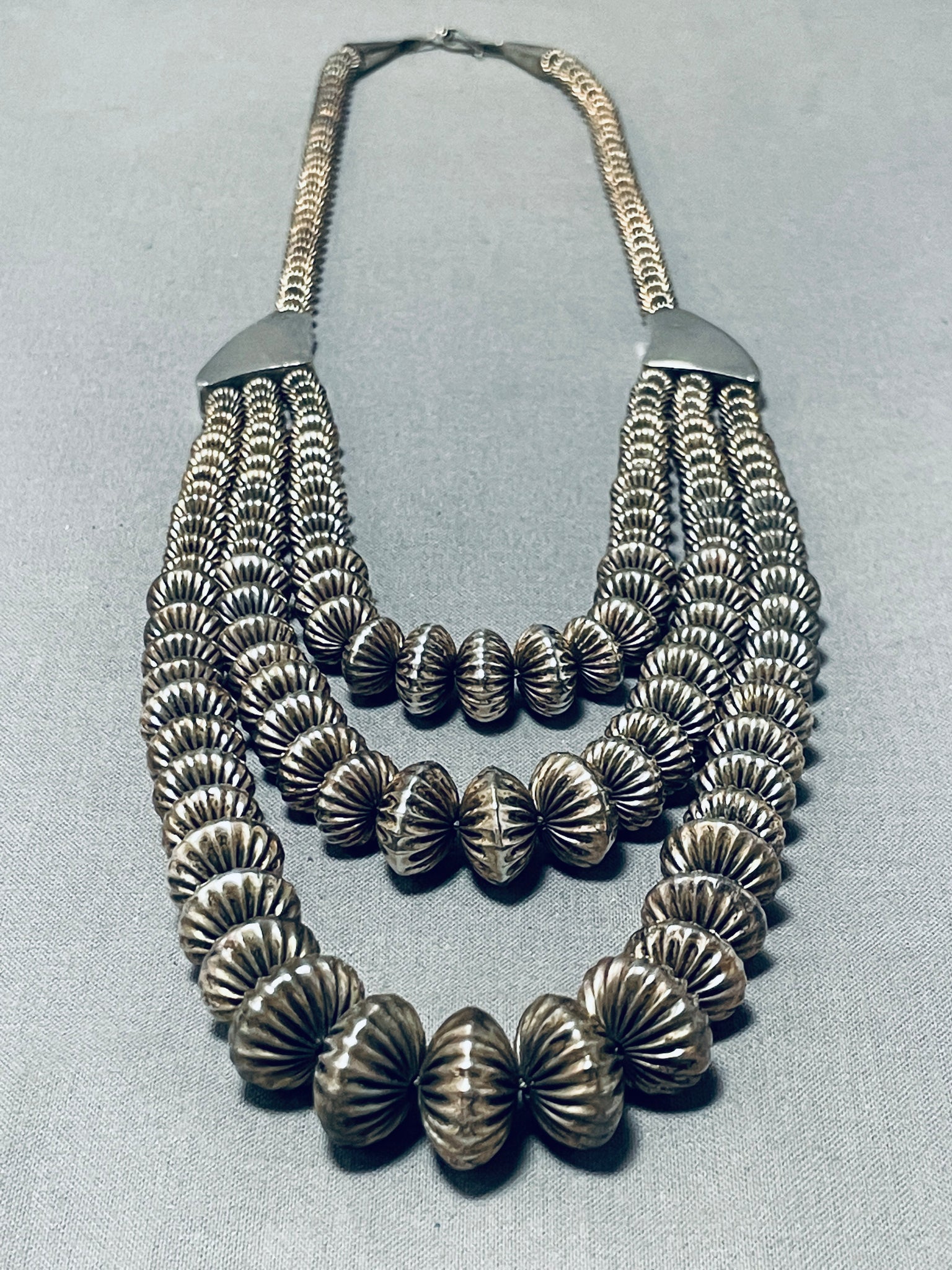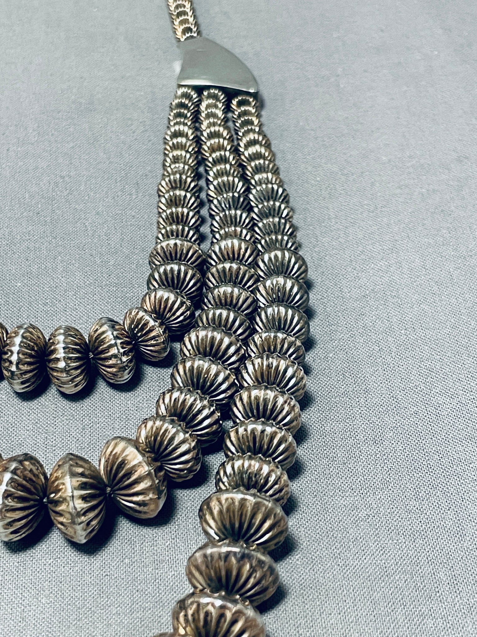 Very rare triple tier hogan necklace, even the connectors are handmade. This is an amazing Navajo all silver necklace. This remarkable necklace contains a beautiful plethora of graduating silver hogan beads that graduate in size from about 1/4" in diameter to about 5/8" in diameter. I love how the bottom portion of the necklace contains three strands that all rest within each other and the top of the necklace contains a single strand of wonderful hogan silver beads. Seperating the triple strands from the single strand are wonderful unique shaped silver pieces. Located at the ends are amazing silver cones with a traditional silver clasp. Sterling silver. Cir. 1970's+. The length of the necklace measures around 24". Sturdy 78 grams.