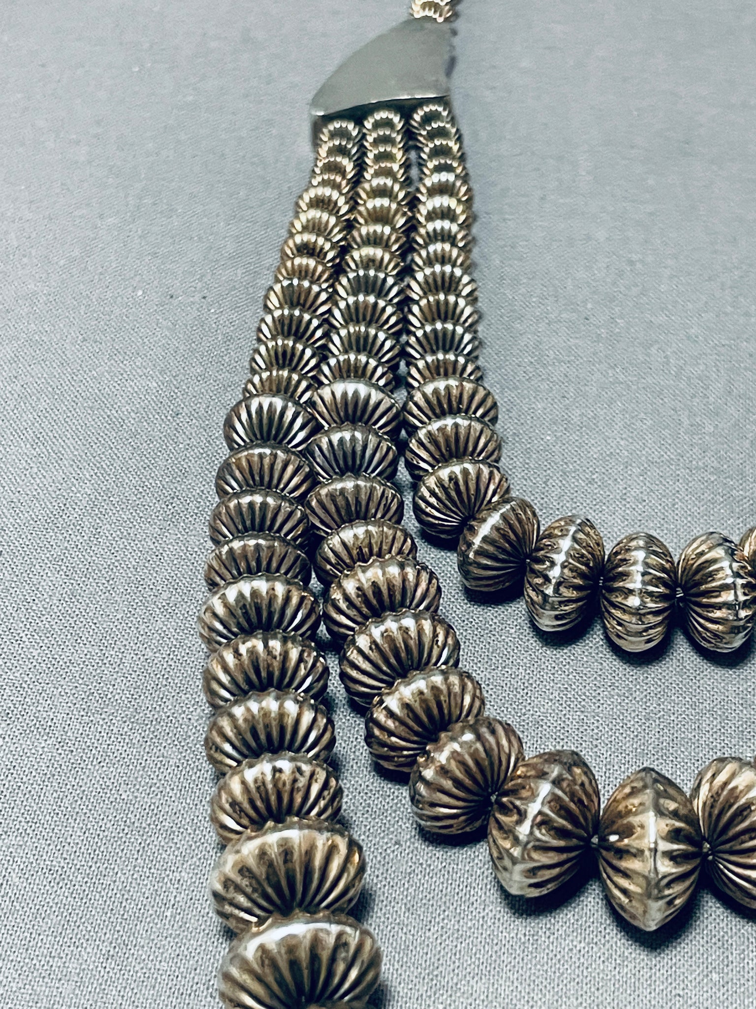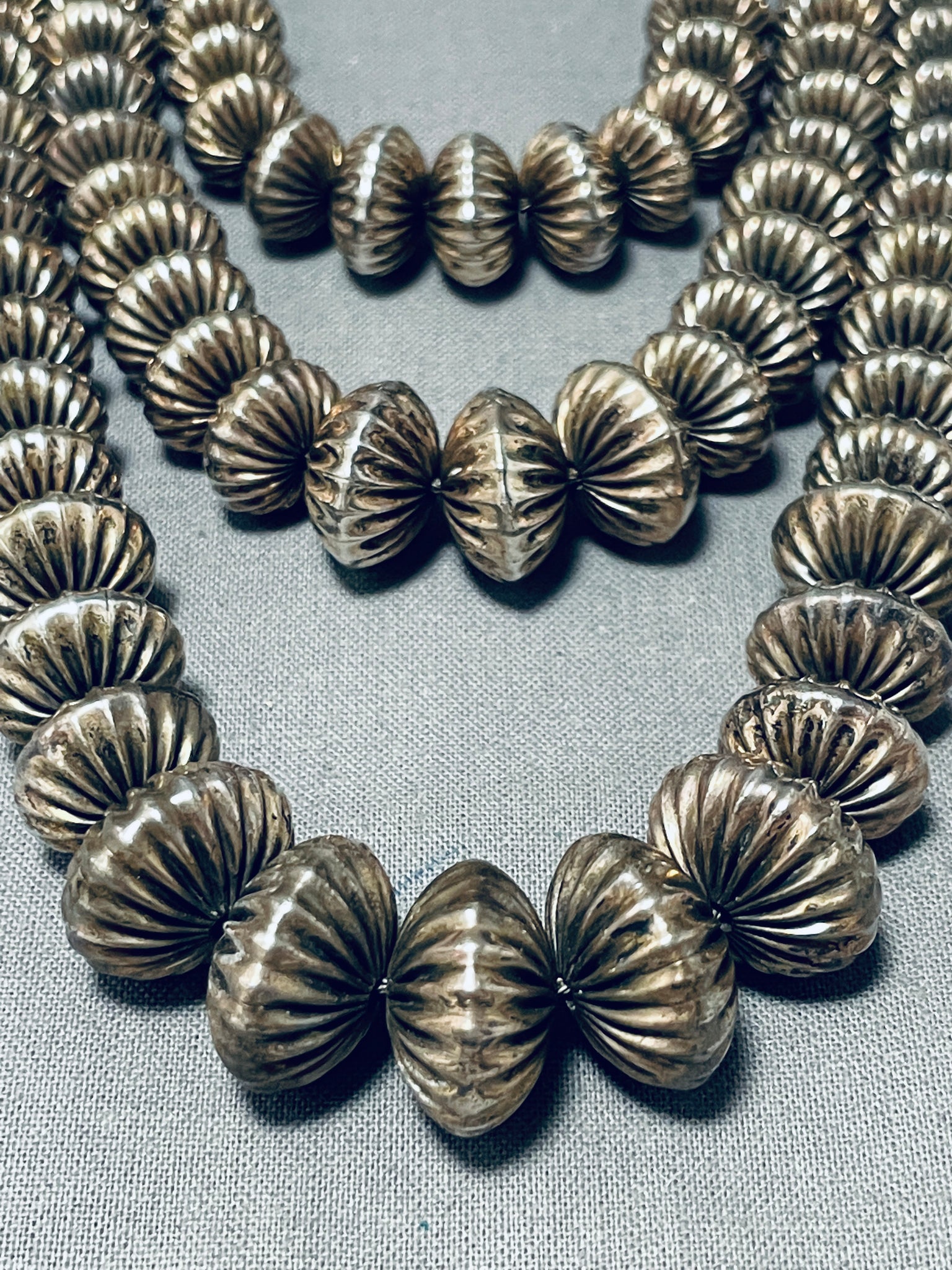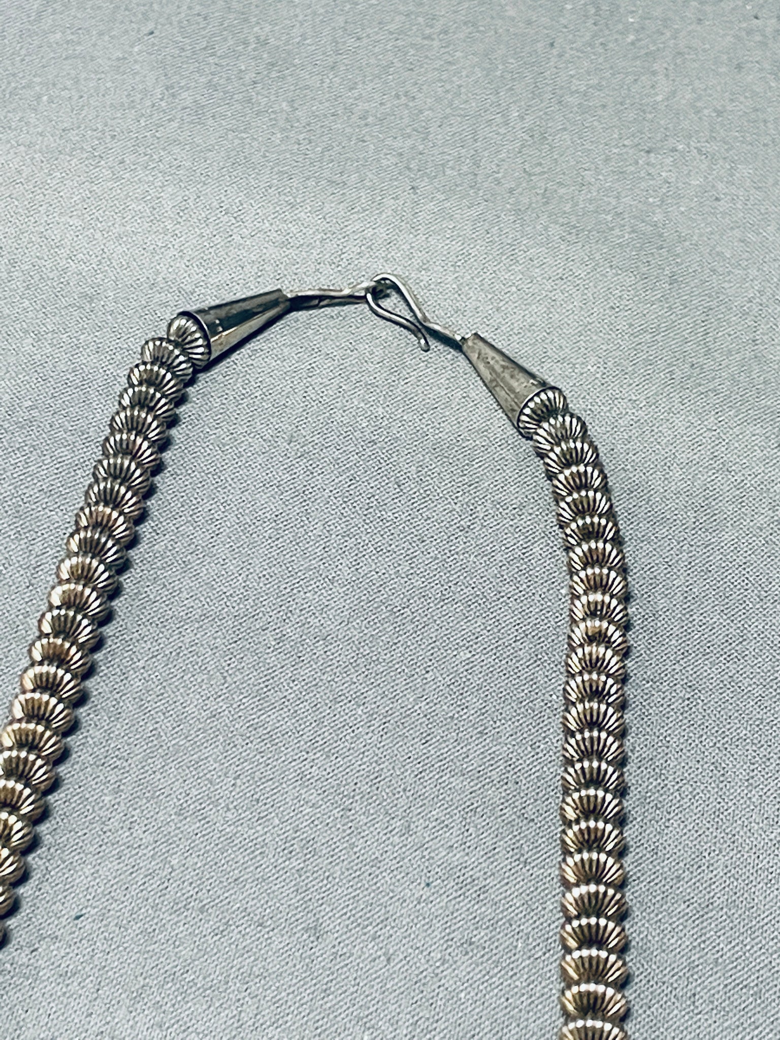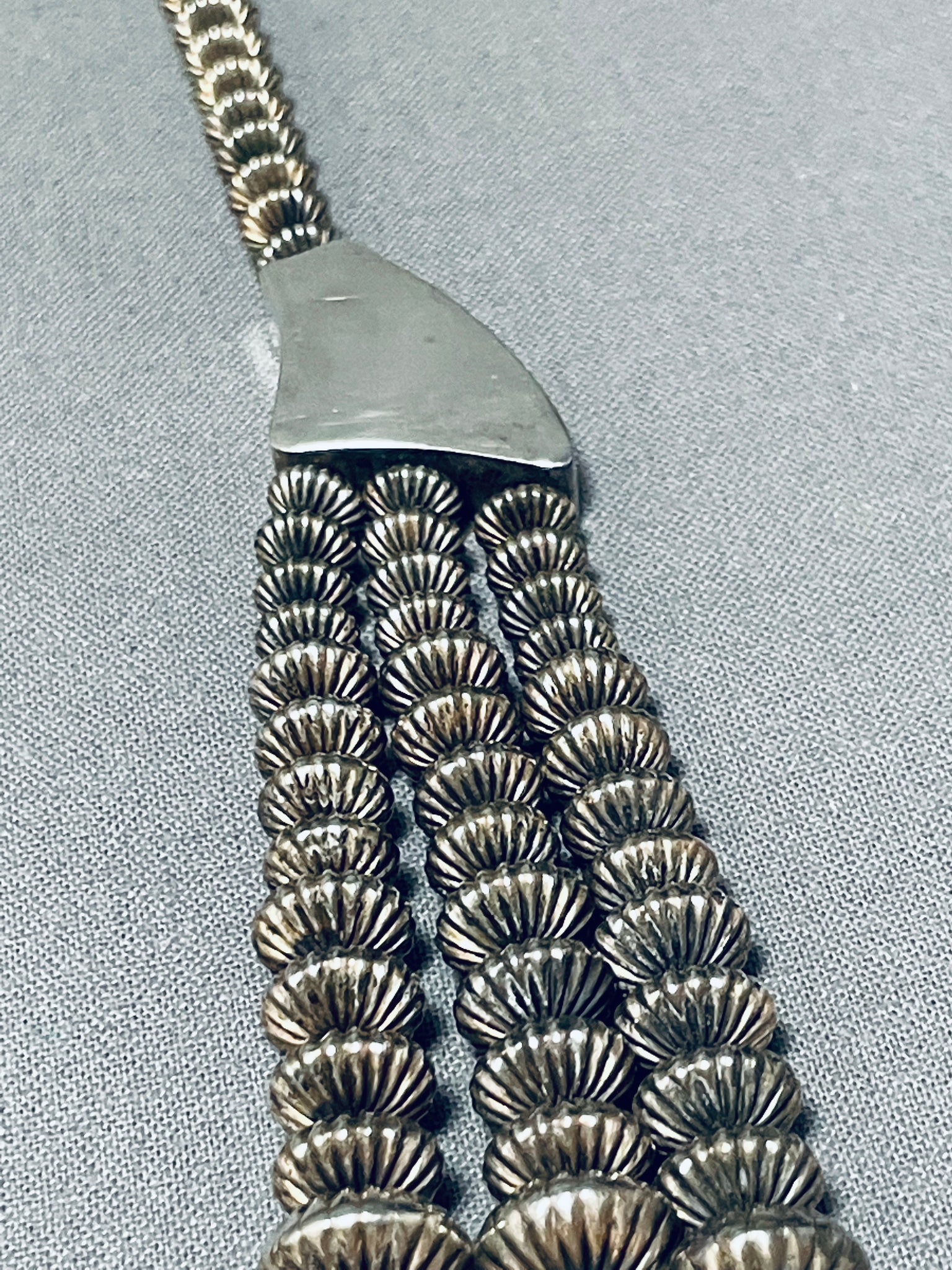 Very rare triple tier hogan necklace, even the connectors are handmade. This is an amazing Navajo all silver necklace. This remarkable necklace contains a beautiful plethora of graduating silver hogan beads that graduate in size from about 1/4" in diameter to about 5/8" in diameter. I love how the bottom portion of the necklace contains three strands that all rest within each other and the top of the necklace contains a single strand of wonderful hogan silver beads. Seperating the triple strands from the single strand are wonderful unique shaped silver pieces. Located at the ends are amazing silver cones with a traditional silver clasp. Sterling silver. Cir. 1970's+. The length of the necklace measures around 24". Sturdy 78 grams.