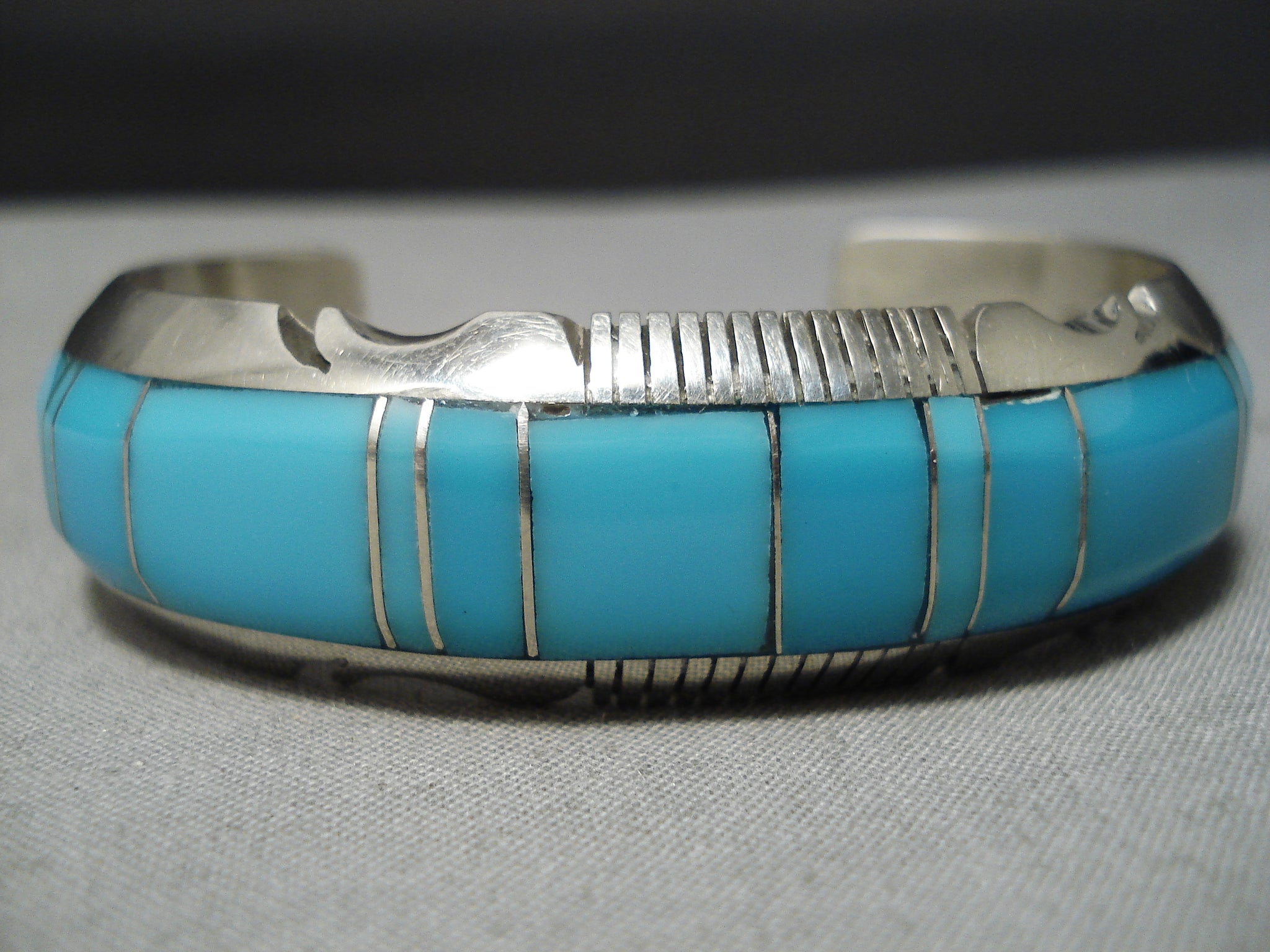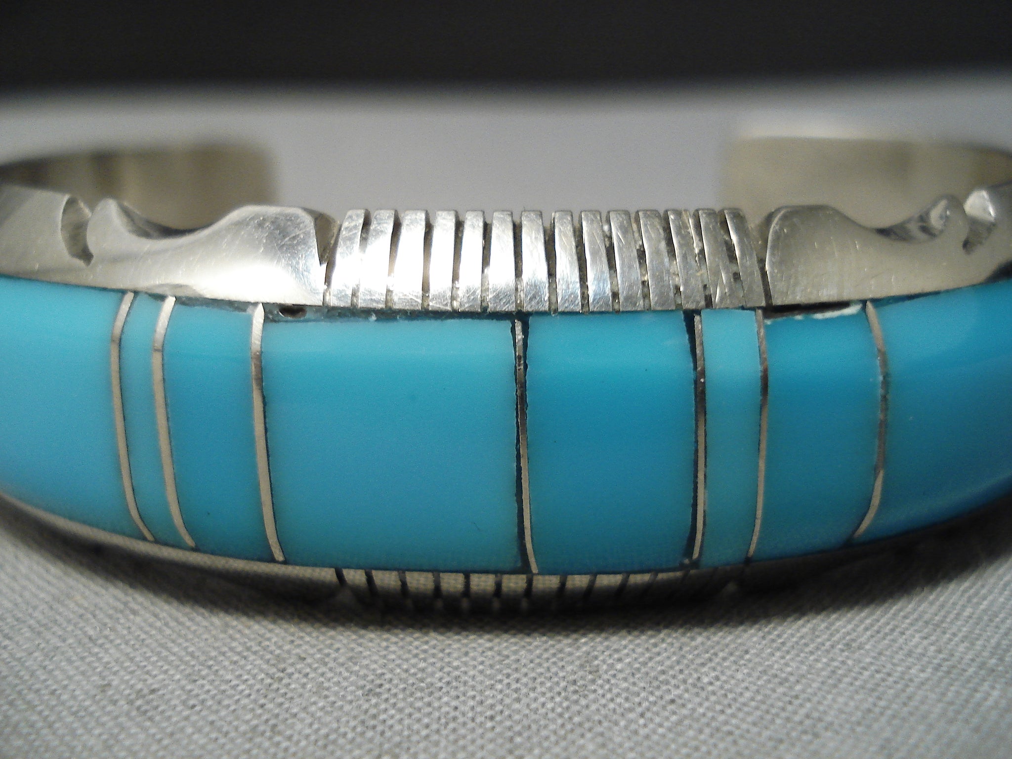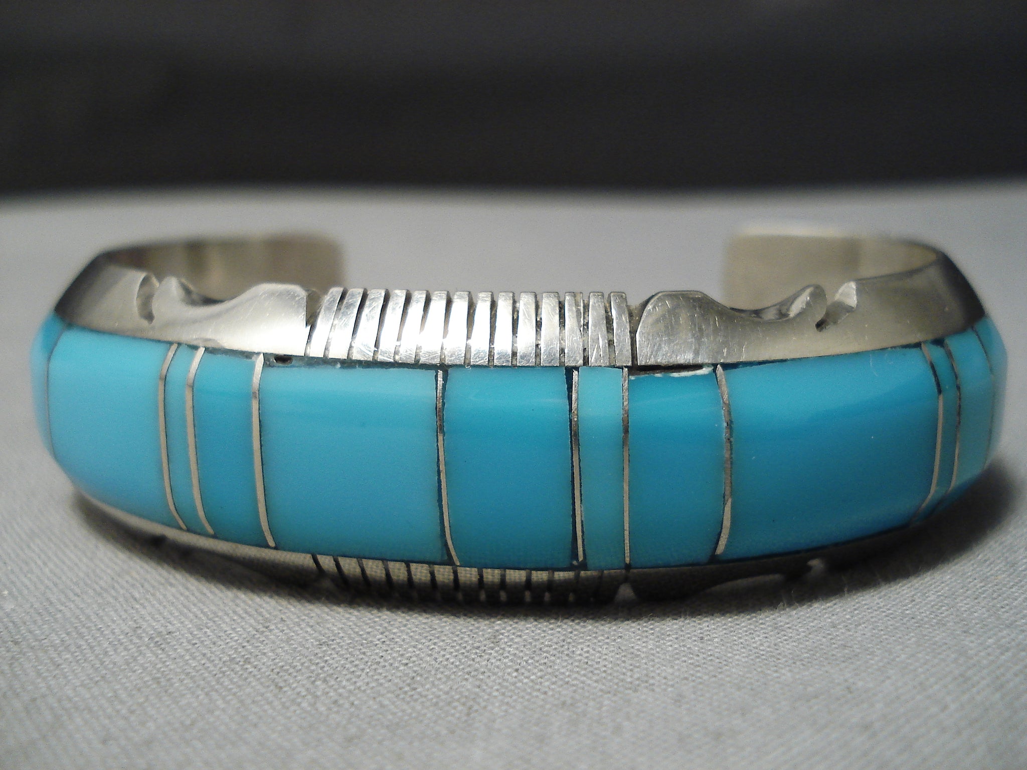 Thick Sturdy Vintage Native American Navajo Sky Blue Turquoise Inlay Sterling Silver Bracelet