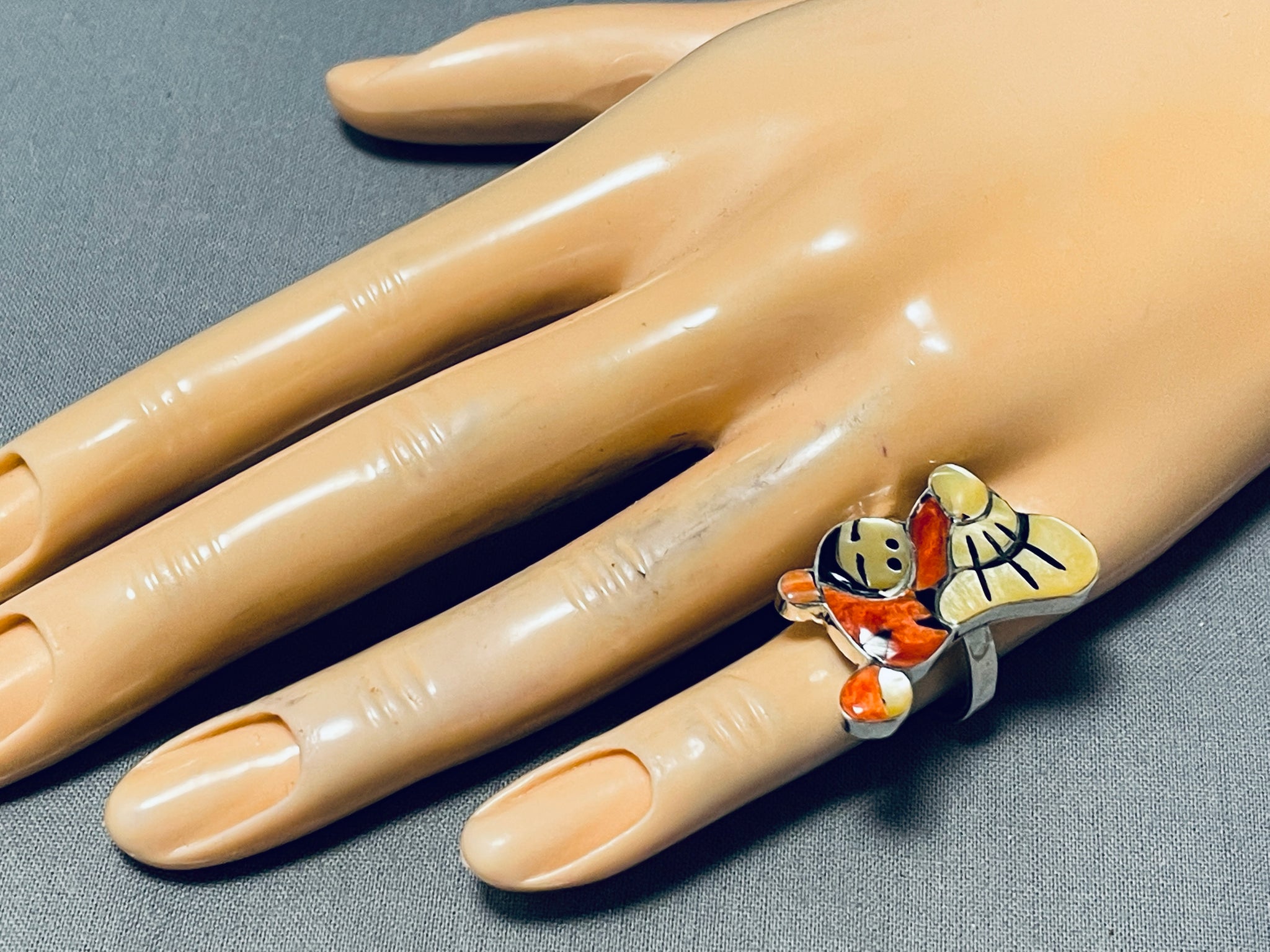 This is a superior Zuni silver ring. Well, if it isn't one of our favorite animal tiger friends - brought to life with the masterful inlay arrangement of stones that include spiny oyster, mother of pearl and jet! Incredible! The ring face measures around 1-1/8" x 3/4". Signed by Zuni artist, Donny Dewa. The ring size is around 6. Sterling silver, marked. Sturdy 8 grams.