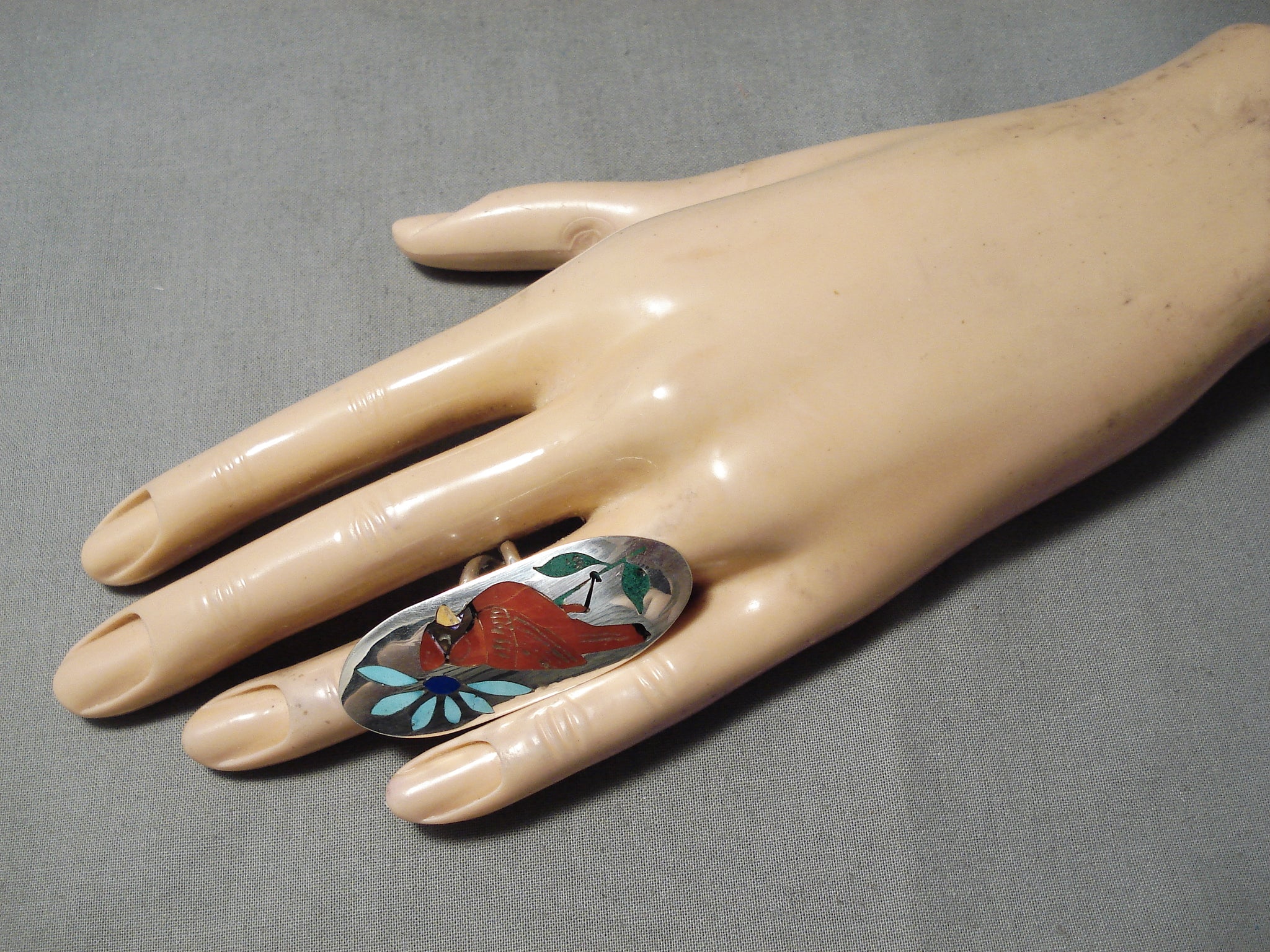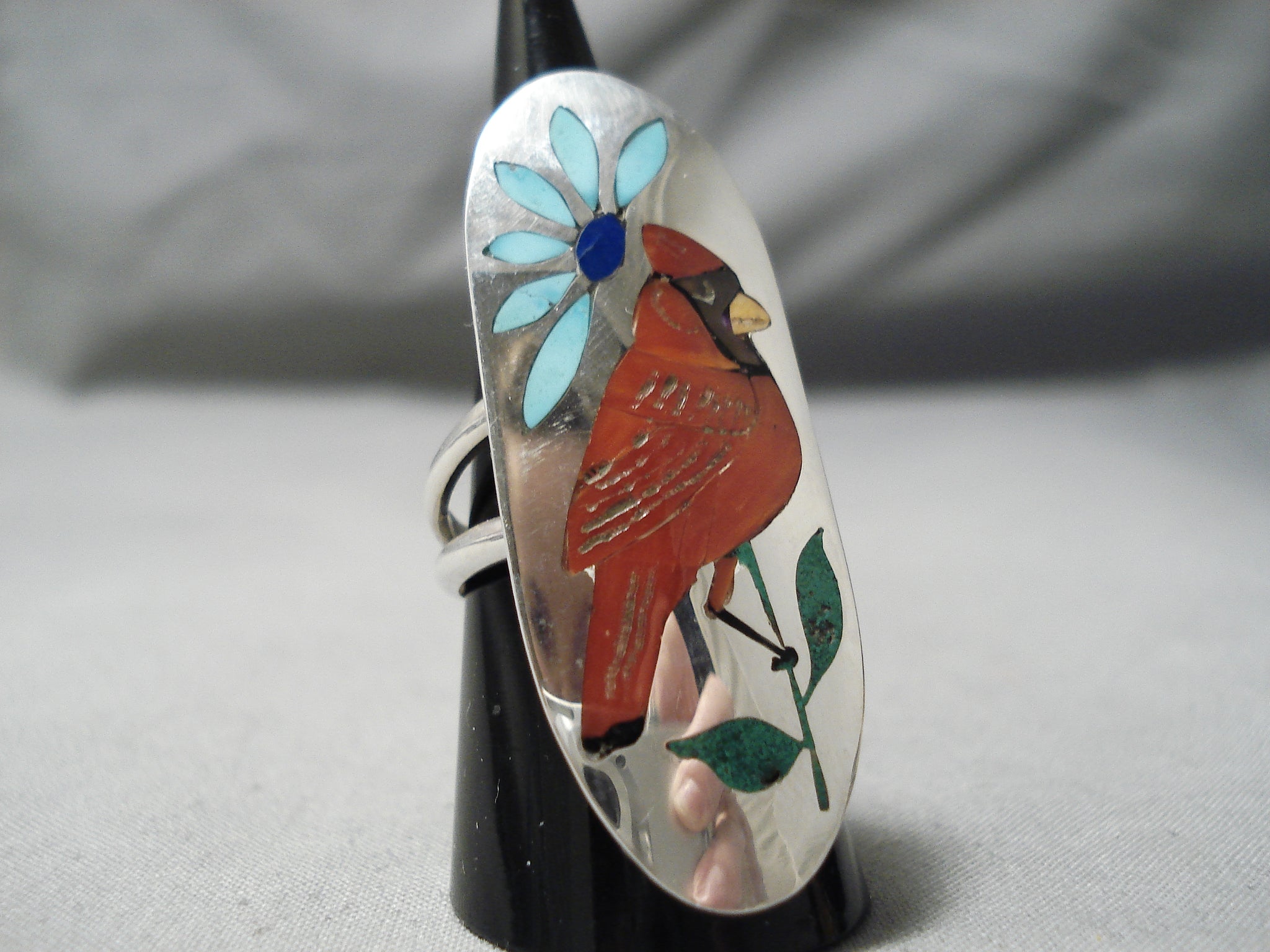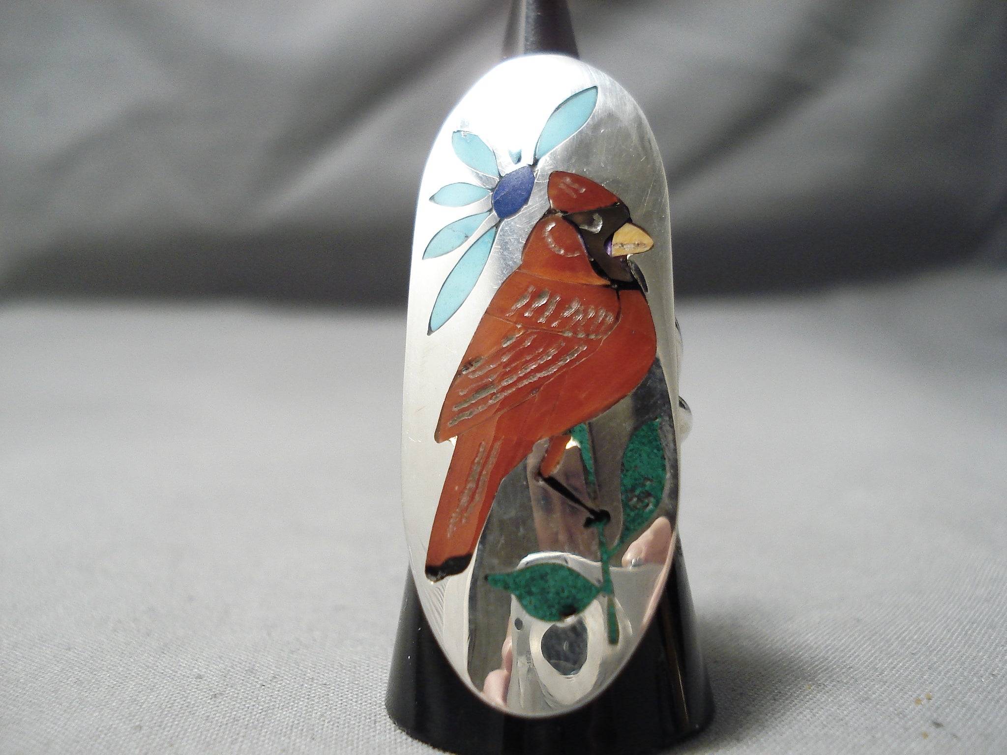 This is a superior vintage Zuni inlaid silver cardinal ring. This is one of the finest inlay rings handmade by one of the best Zuni tribe members, Q. Quam Sr. This ring consists of a phenomenal inlaid cardinal bird that is inlaid with coral, turquoise, lapis, and shells. The attention to detail is just impeccable. The ring face measures around 2" x 3/4". Signed by Zuni artist, Q. Quam Sr. The ring size is around 9. Cir. 1970's+. Sterling silver, marked. Sturdy 12 grams.
