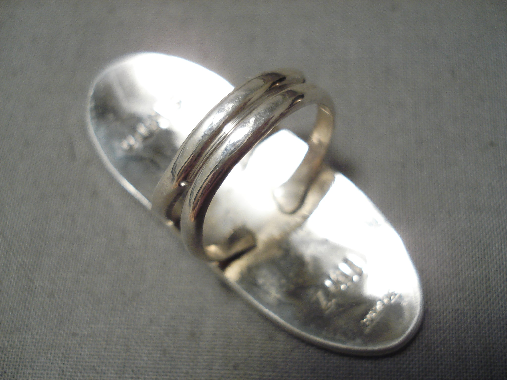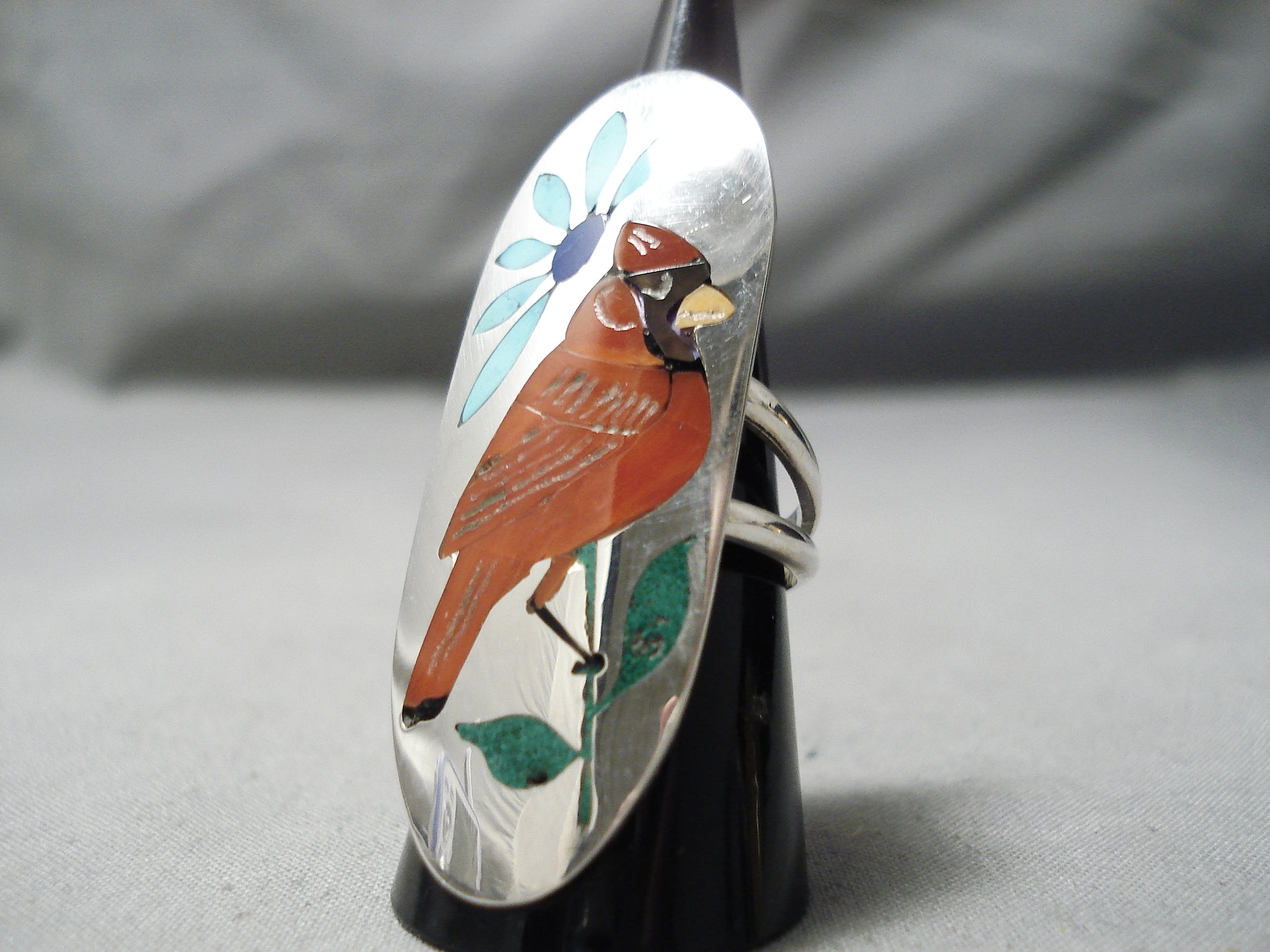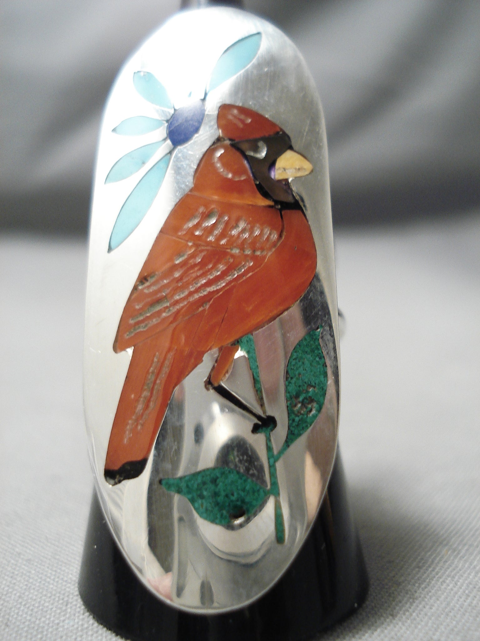 This is a superior vintage Zuni inlaid silver cardinal ring. This is one of the finest inlay rings handmade by one of the best Zuni tribe members, Q. Quam Sr. This ring consists of a phenomenal inlaid cardinal bird that is inlaid with coral, turquoise, lapis, and shells. The attention to detail is just impeccable. The ring face measures around 2" x 3/4". Signed by Zuni artist, Q. Quam Sr. The ring size is around 9. Cir. 1970's+. Sterling silver, marked. Sturdy 12 grams.