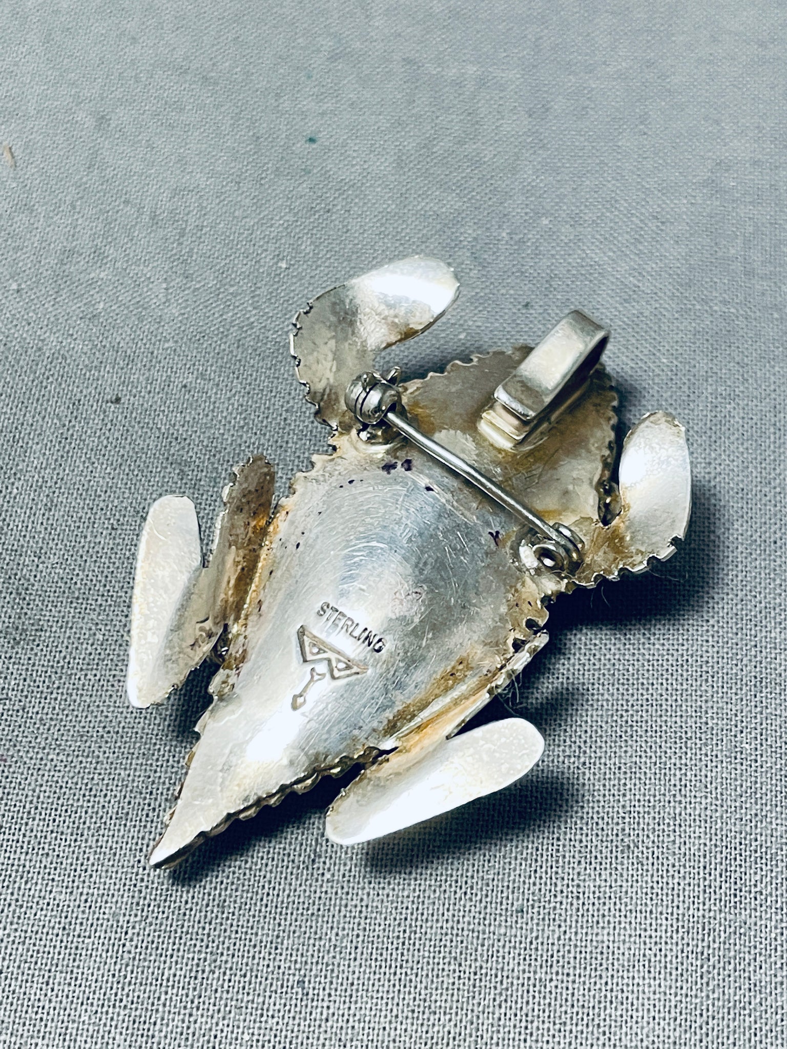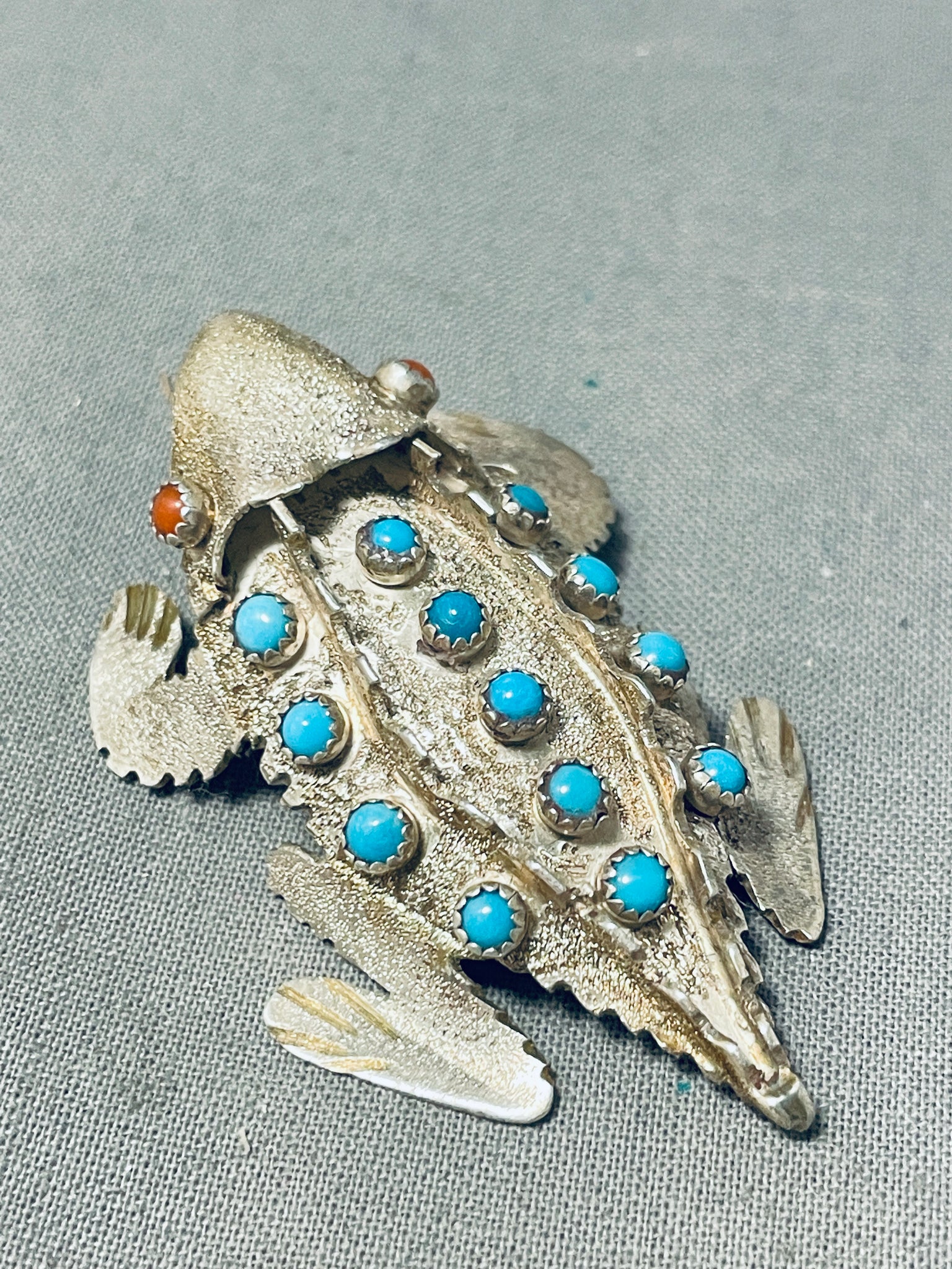 Unforgettable Native American Navajo Turquoise & Coral Sterling Silver Toad Pin/ Pendant