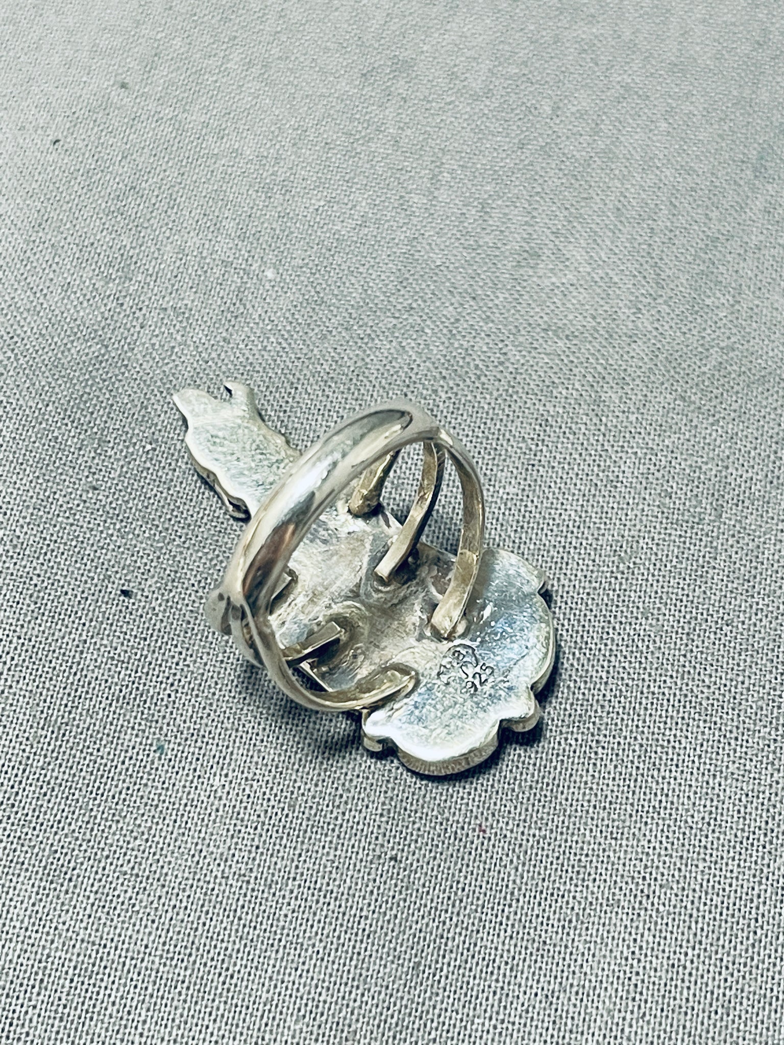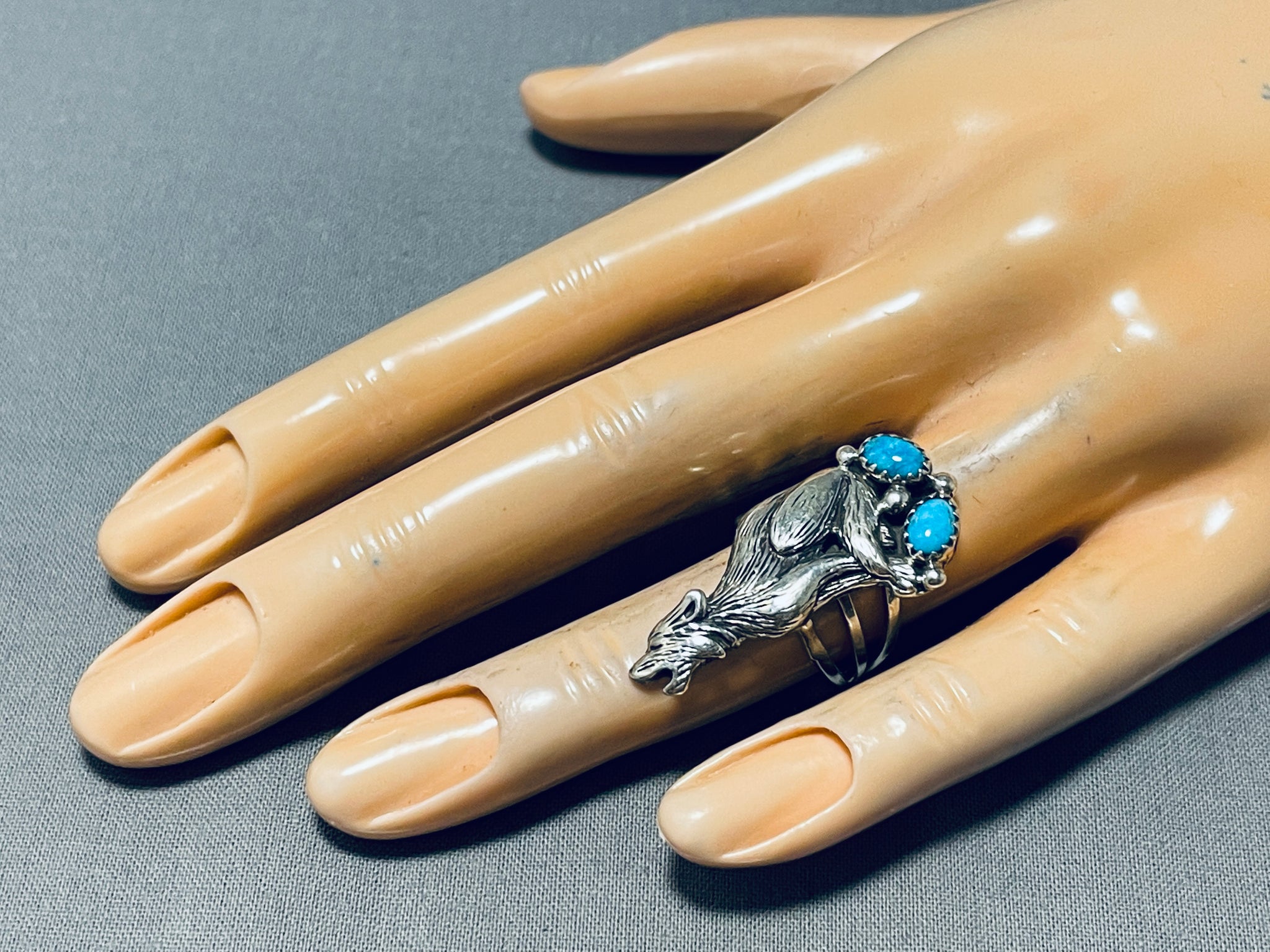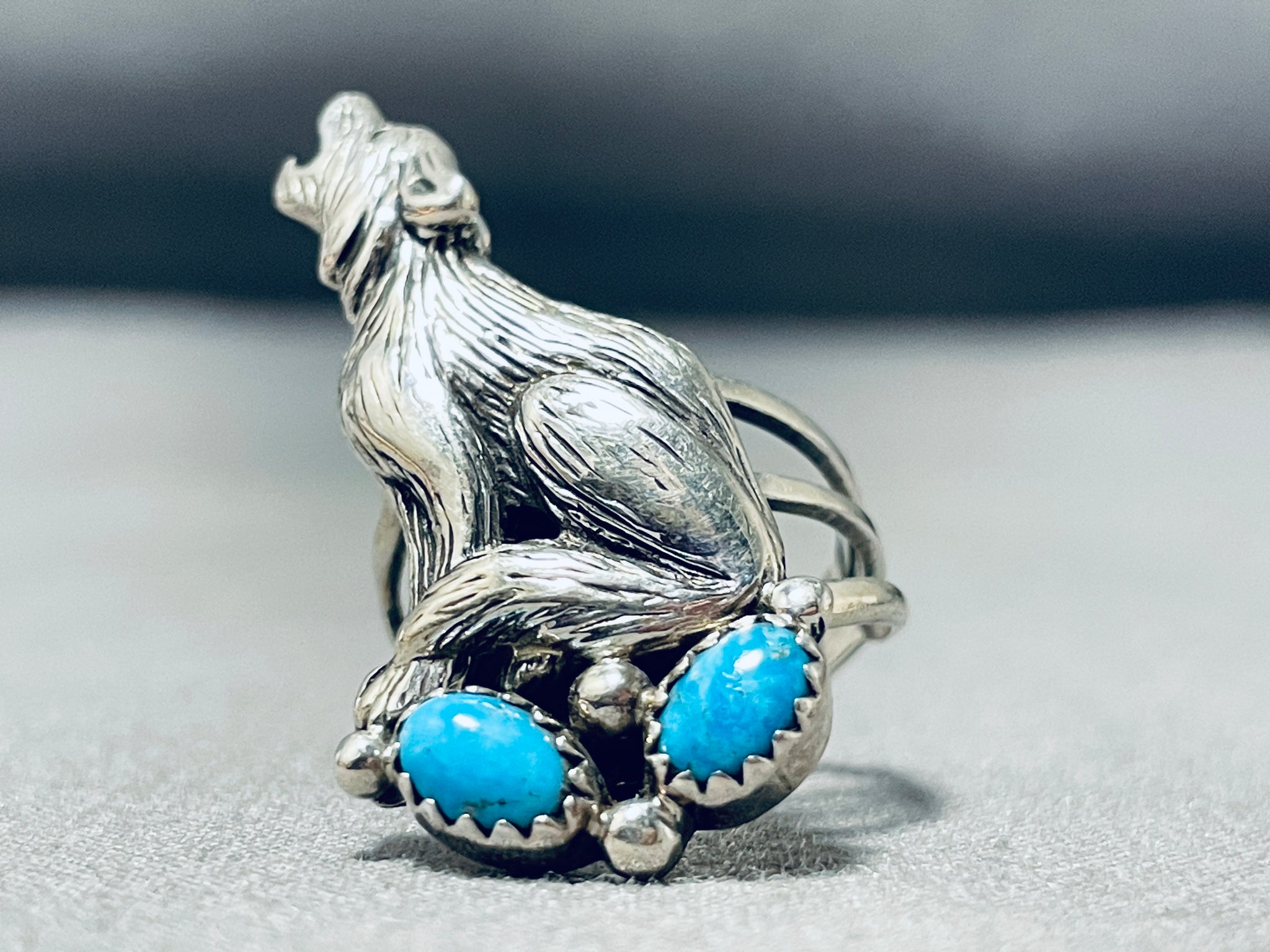 Unique Native American Navajo 2 Kingman Turquoise Sterling Silver Howling Coyote Huge Ring