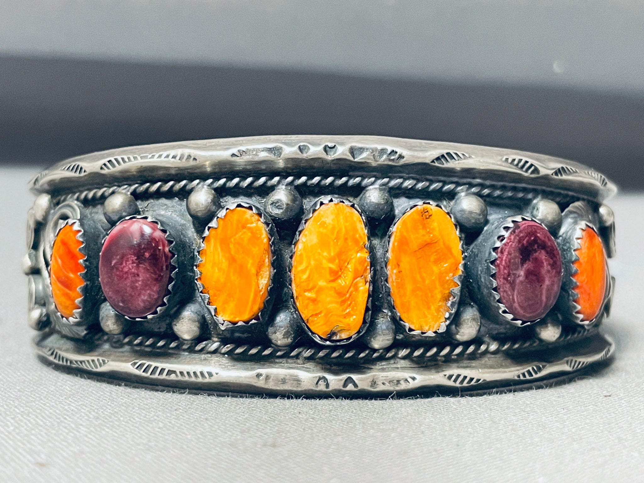 Unique Orange Shell Vintage Native American Navajo Sterling Silver Bracelet Cuff