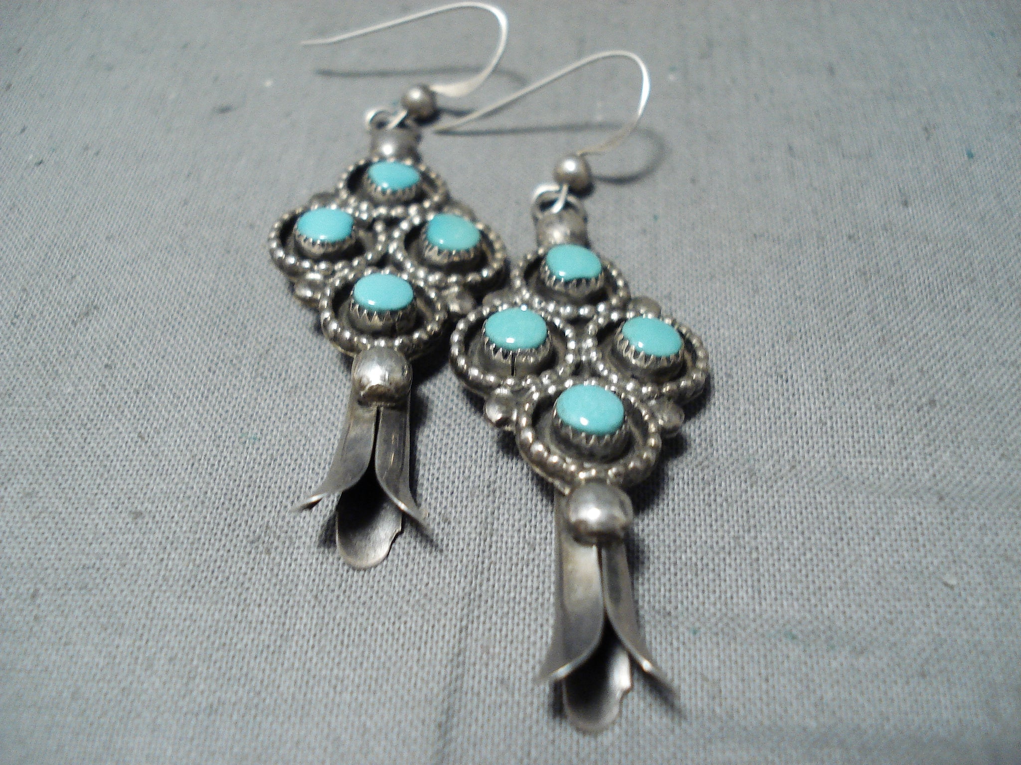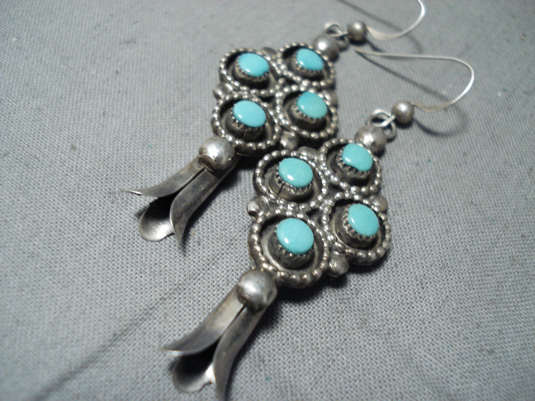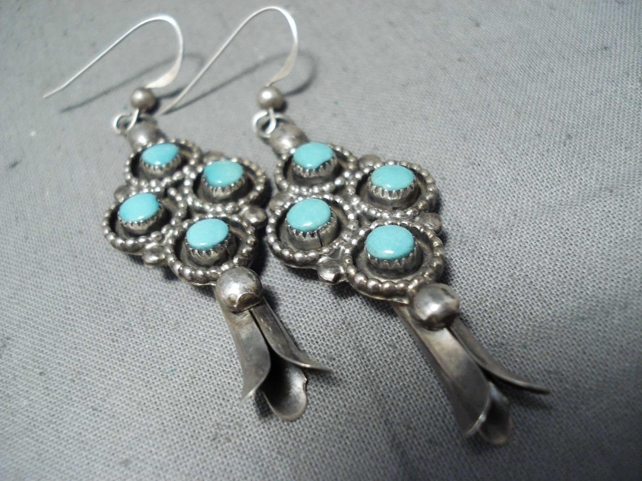 Unique Vintage Native American Zuni Blue Gem Turquoise Sterling Silver Squash Blossom Earrings