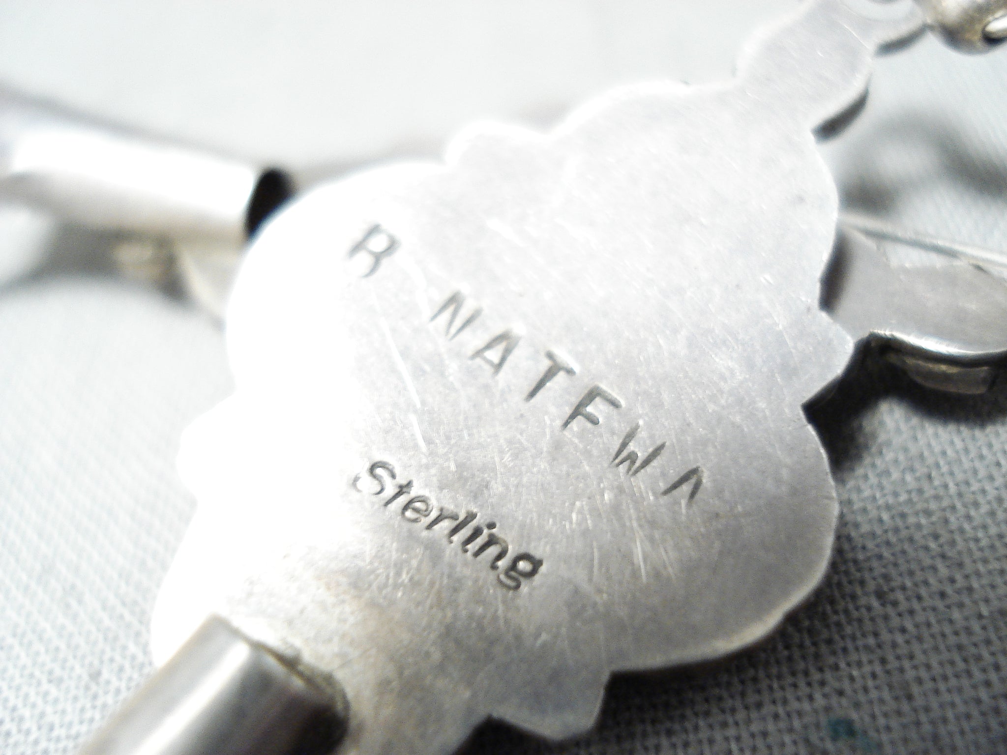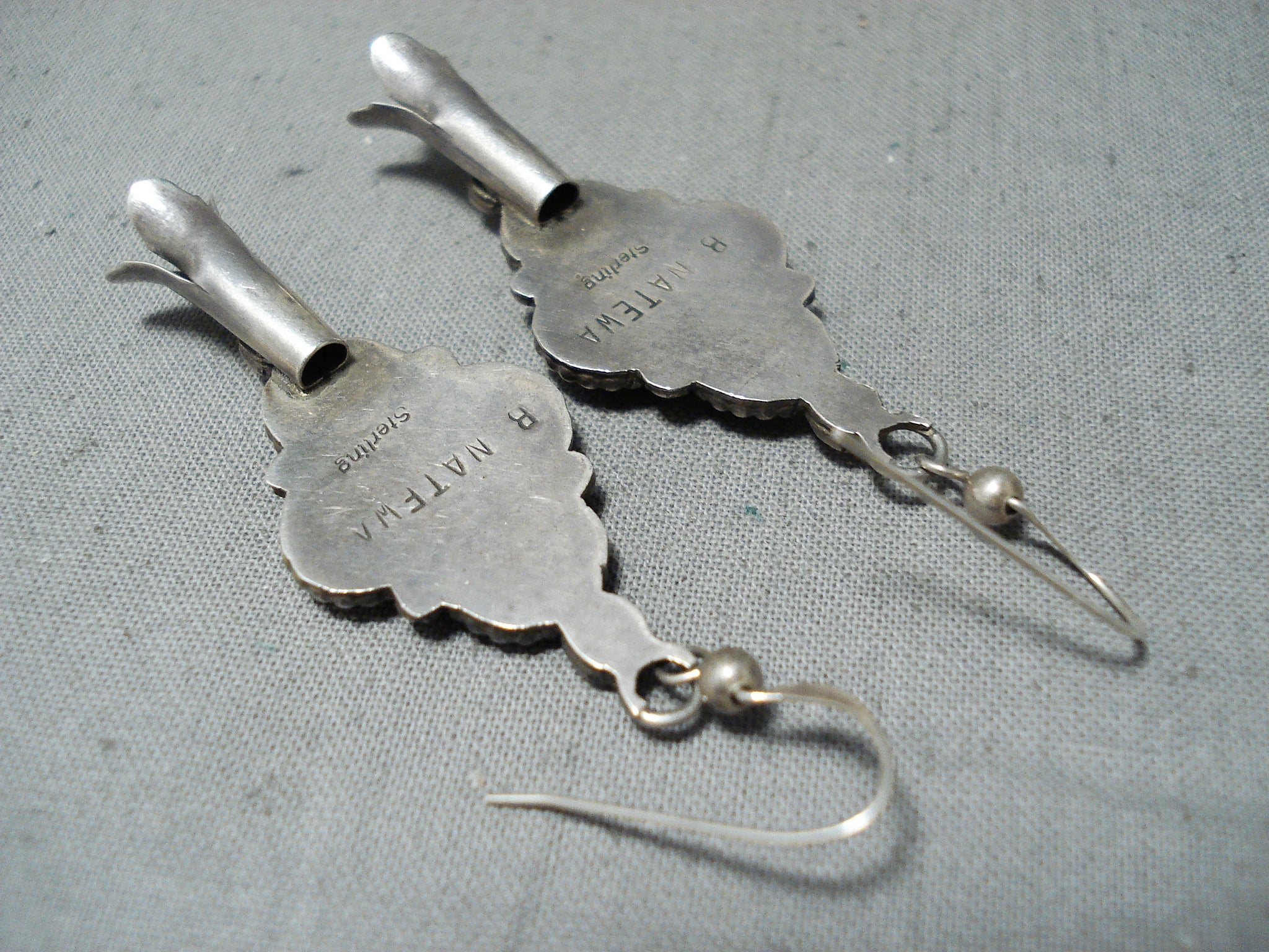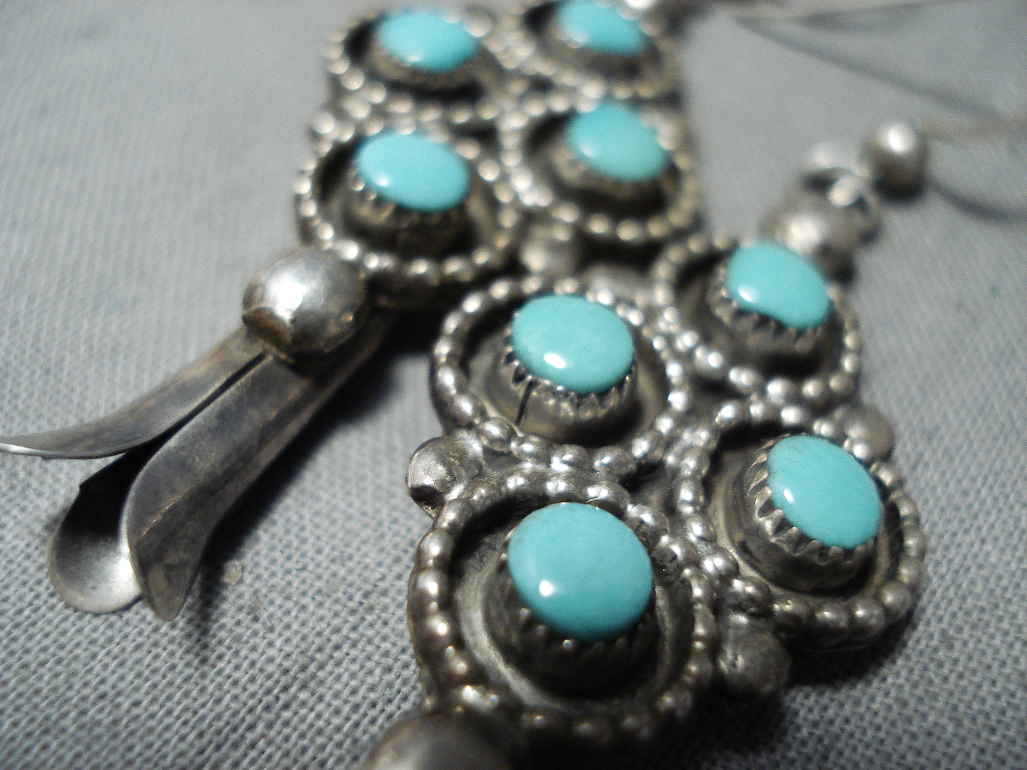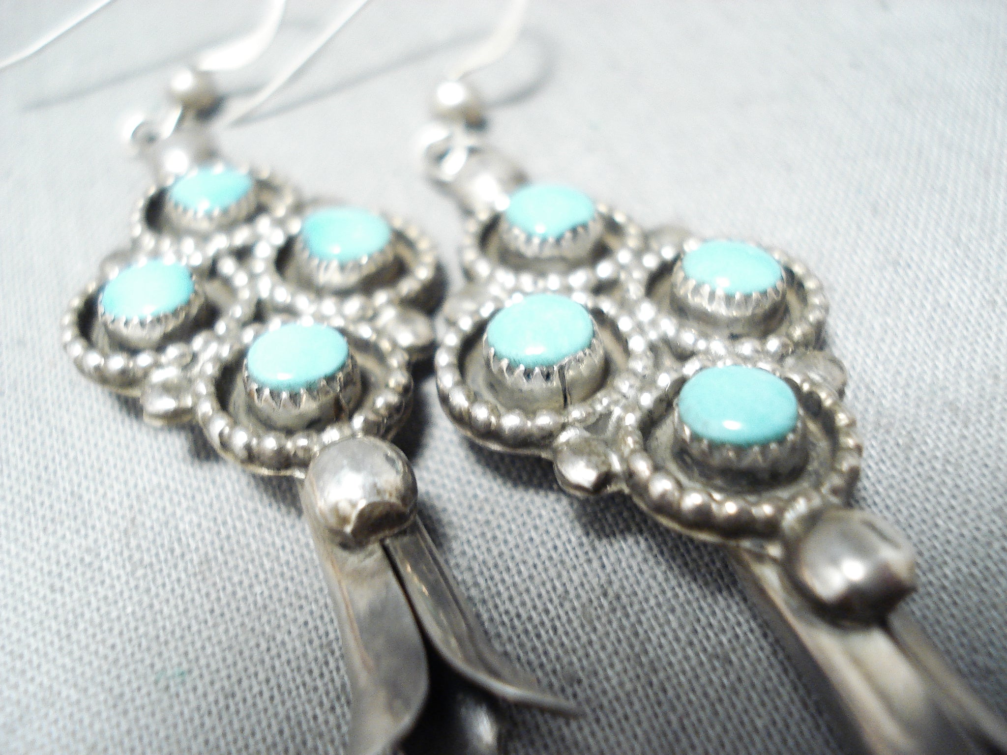 Unique Vintage Native American Zuni Blue Gem Turquoise Sterling Silver Squash Blossom Earrings