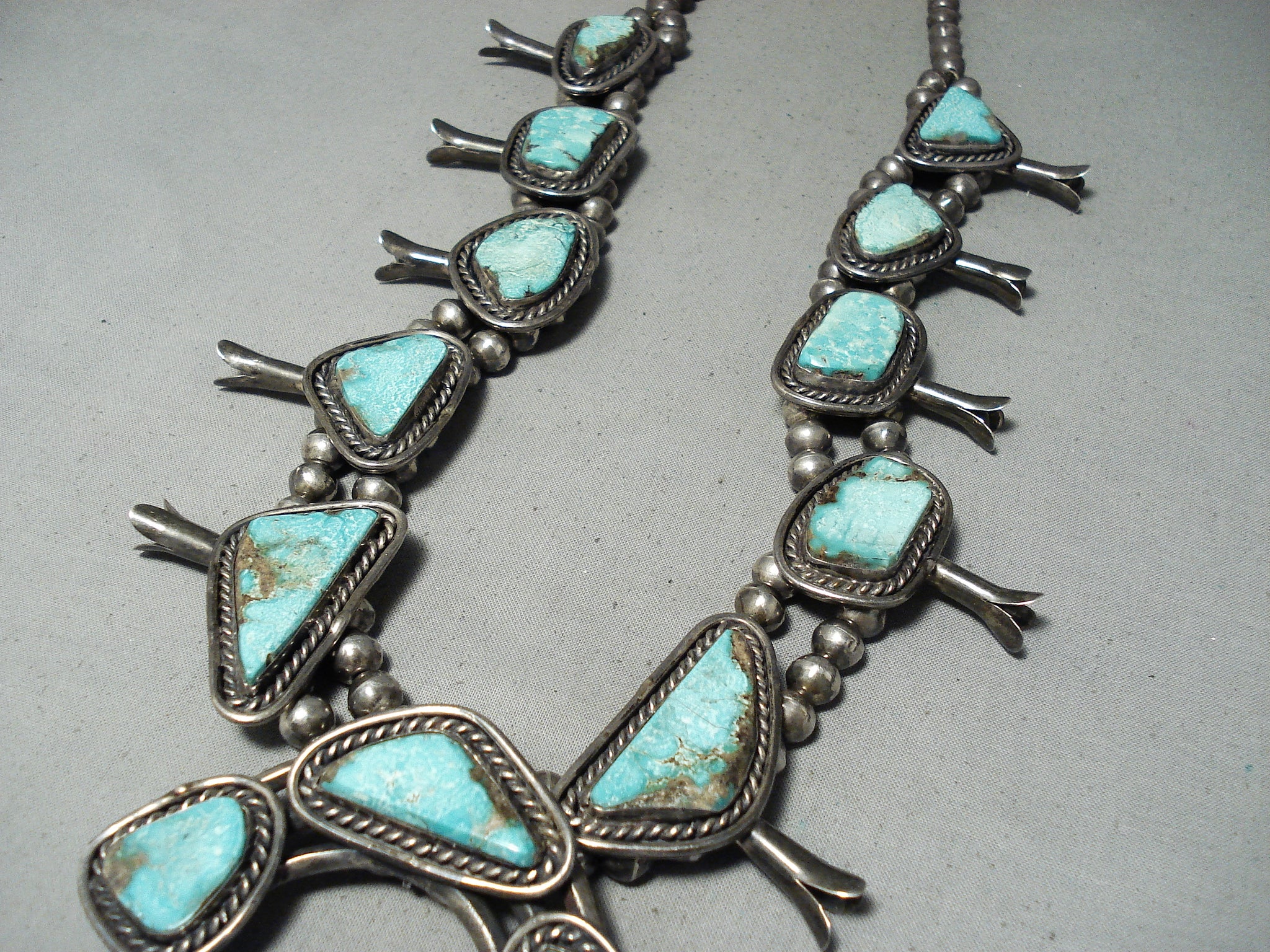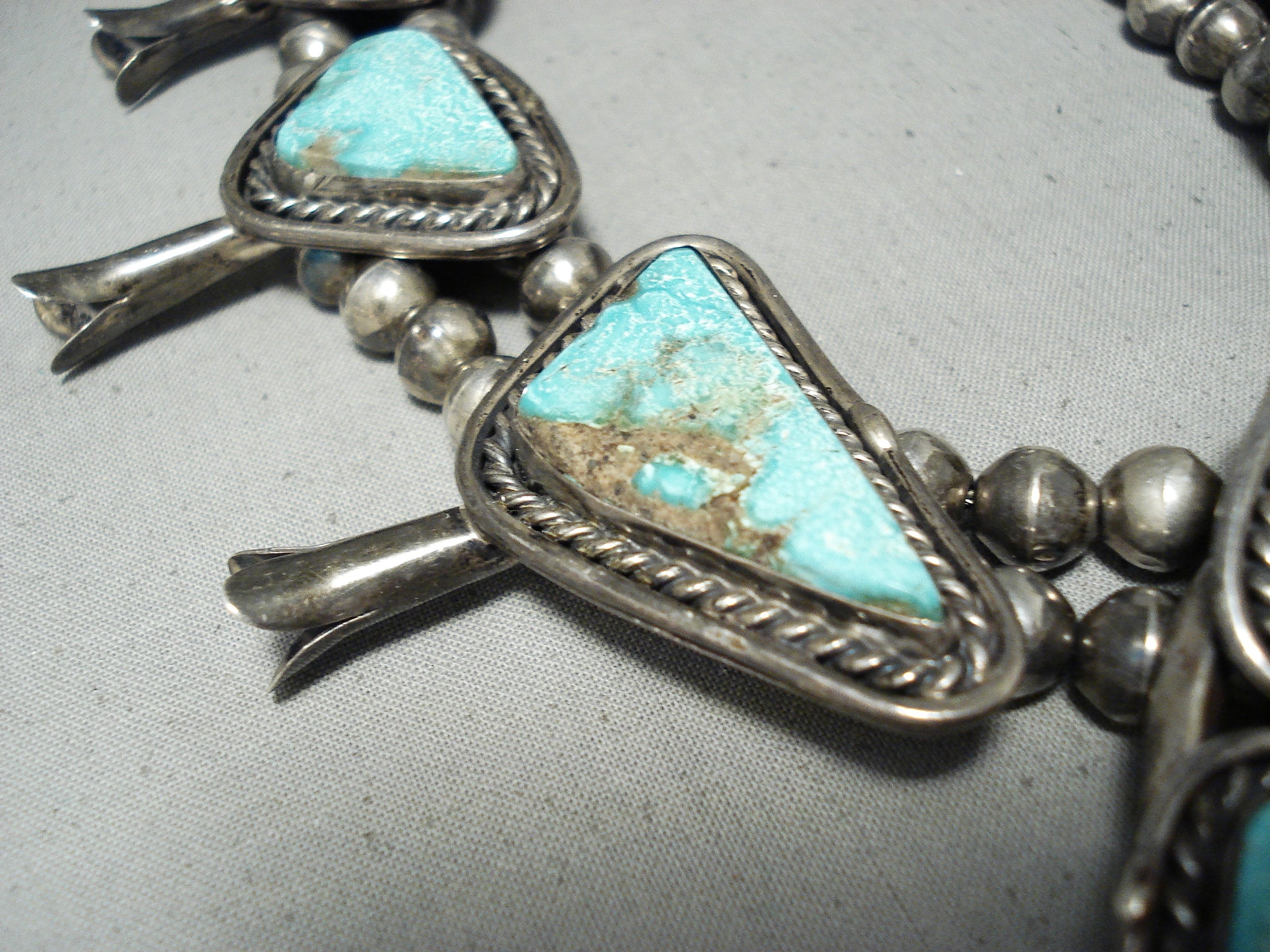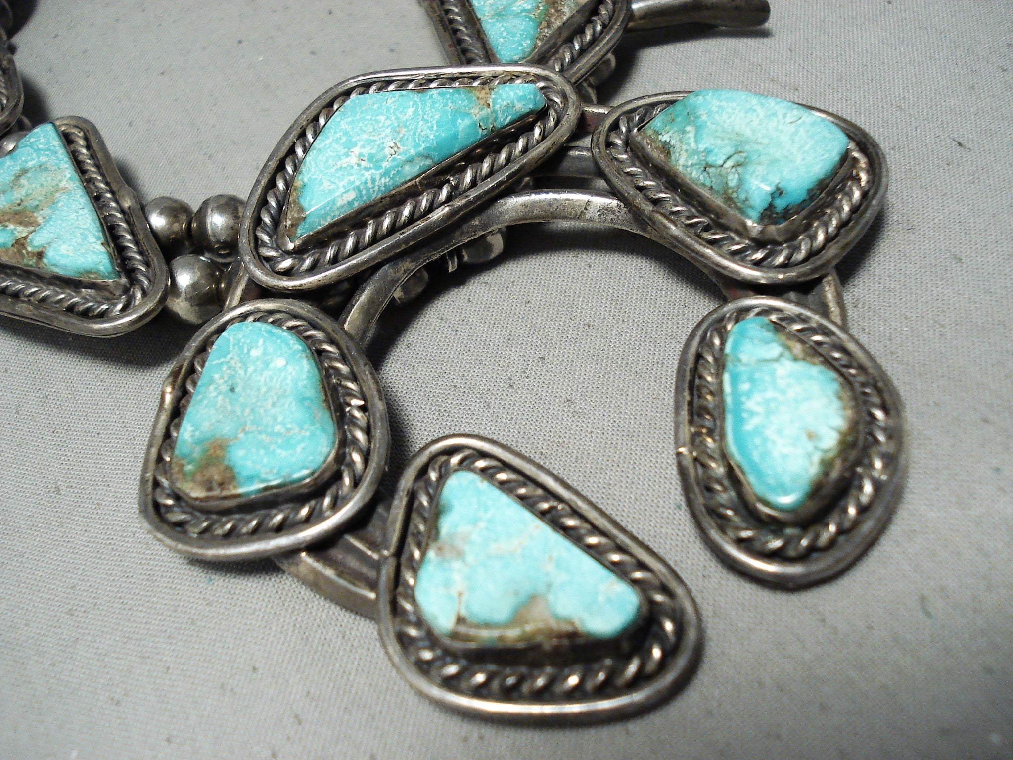 Unique Women's Vintage Native American Navajo Turquoise Sterling Silver Squash Blossom Necklace