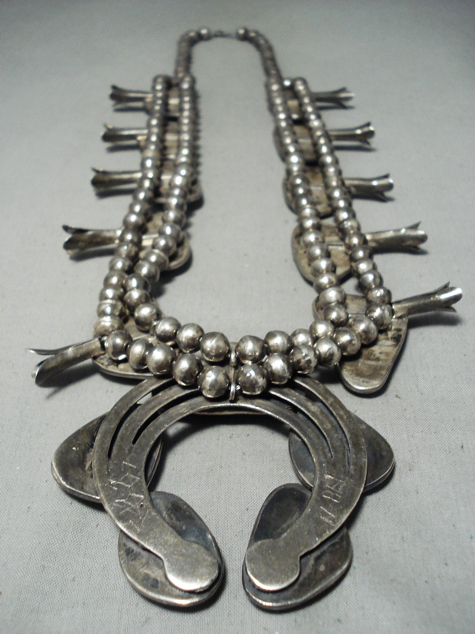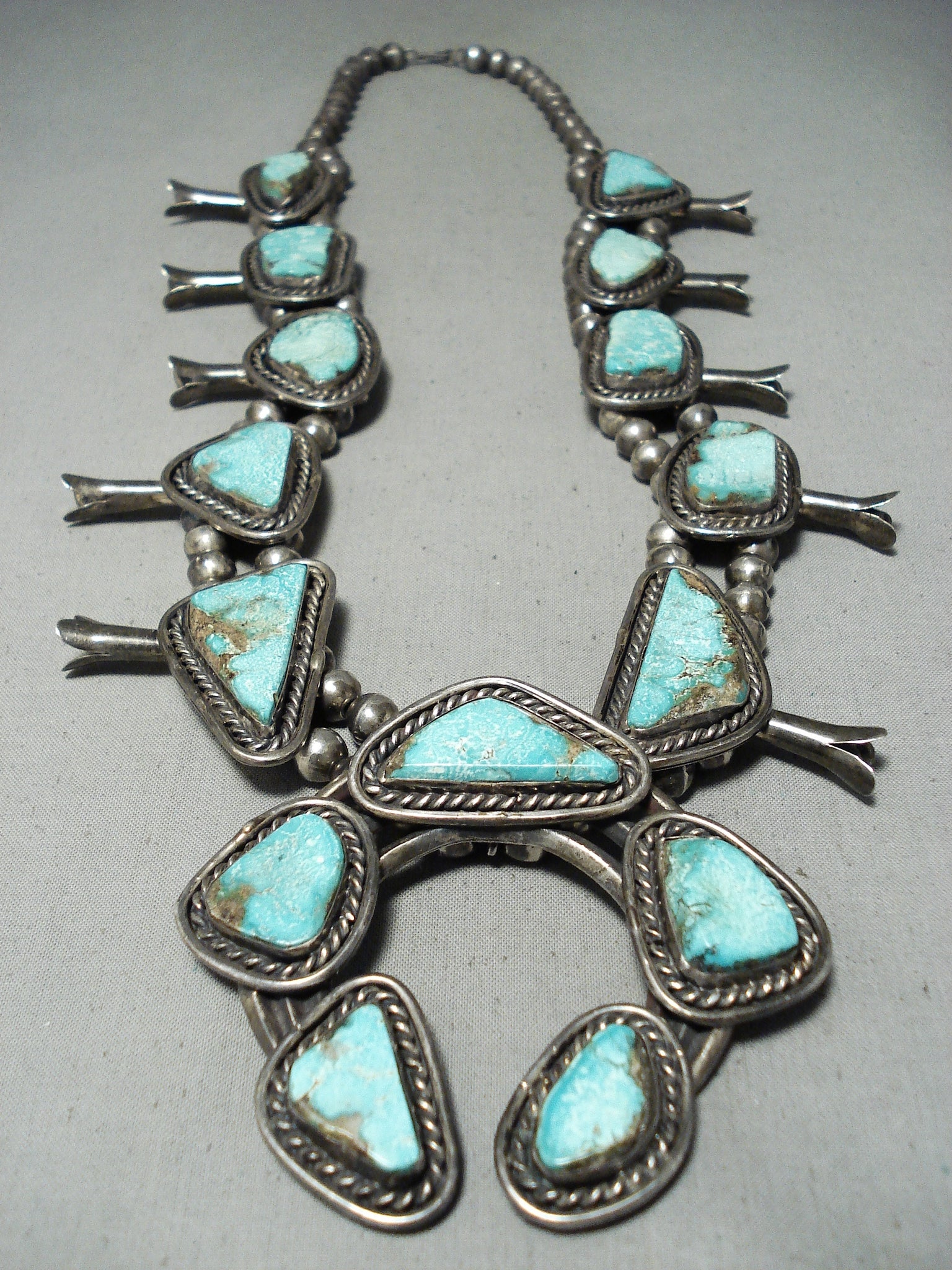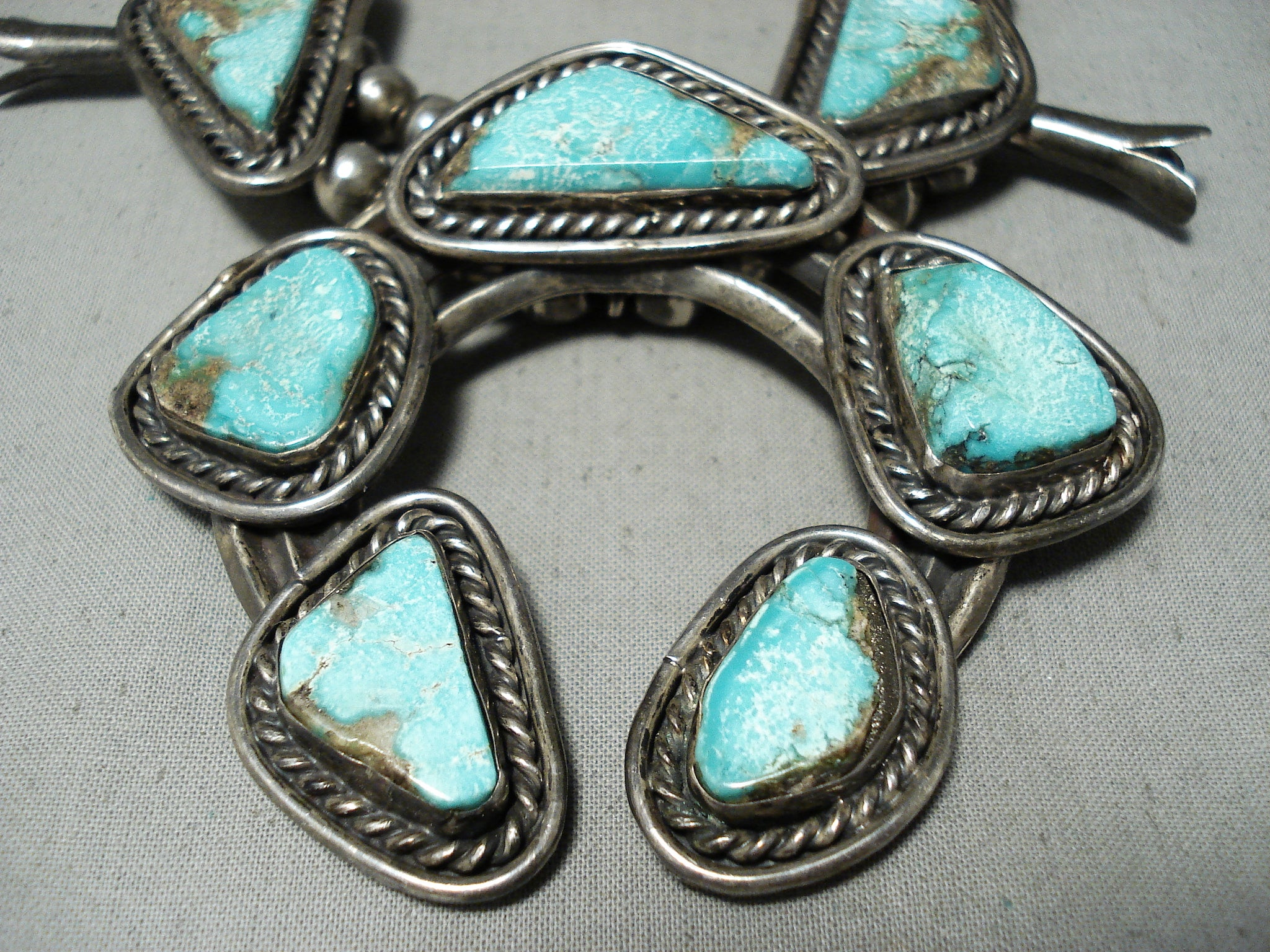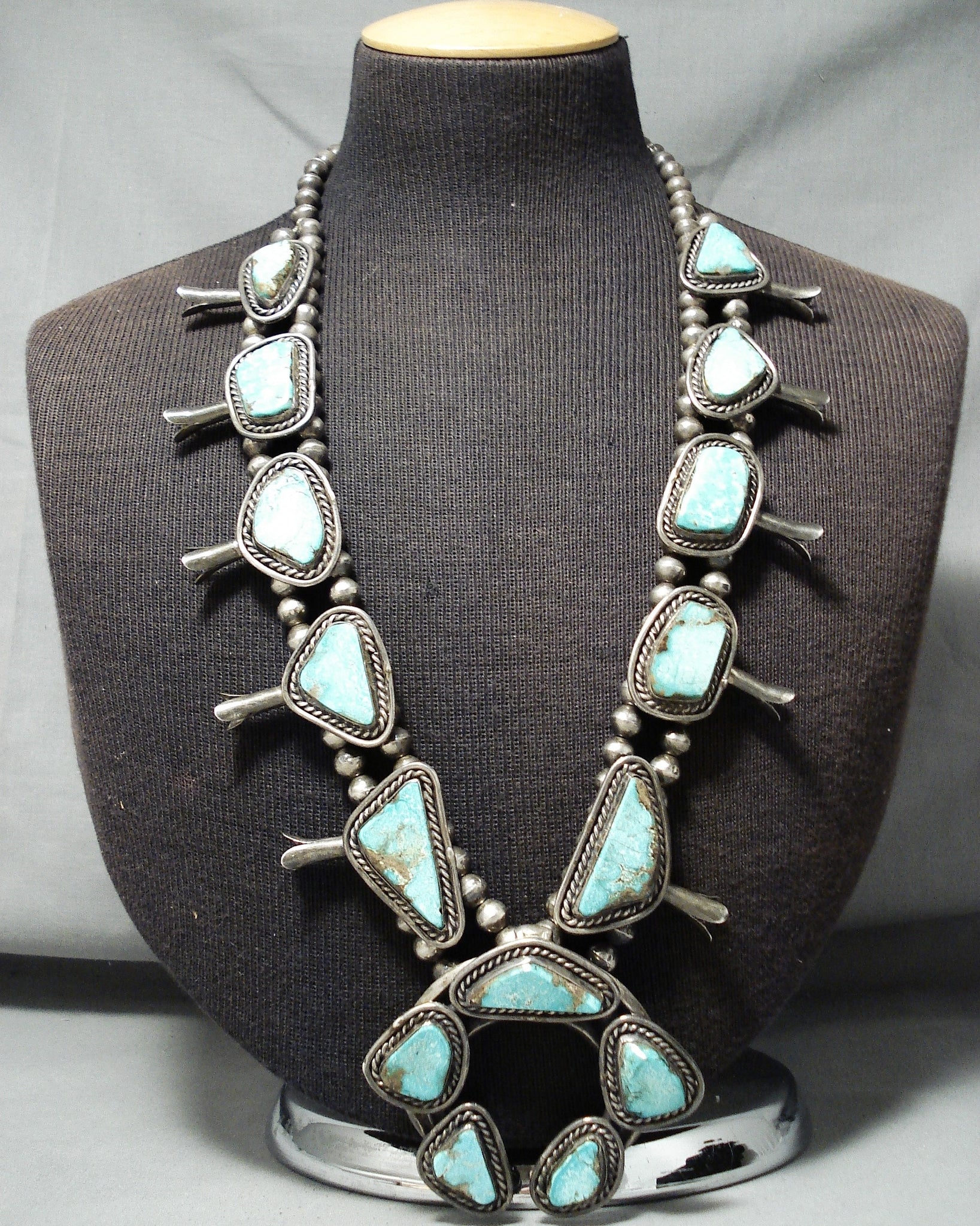 Unique Women's Vintage Native American Navajo Turquoise Sterling Silver Squash Blossom Necklace