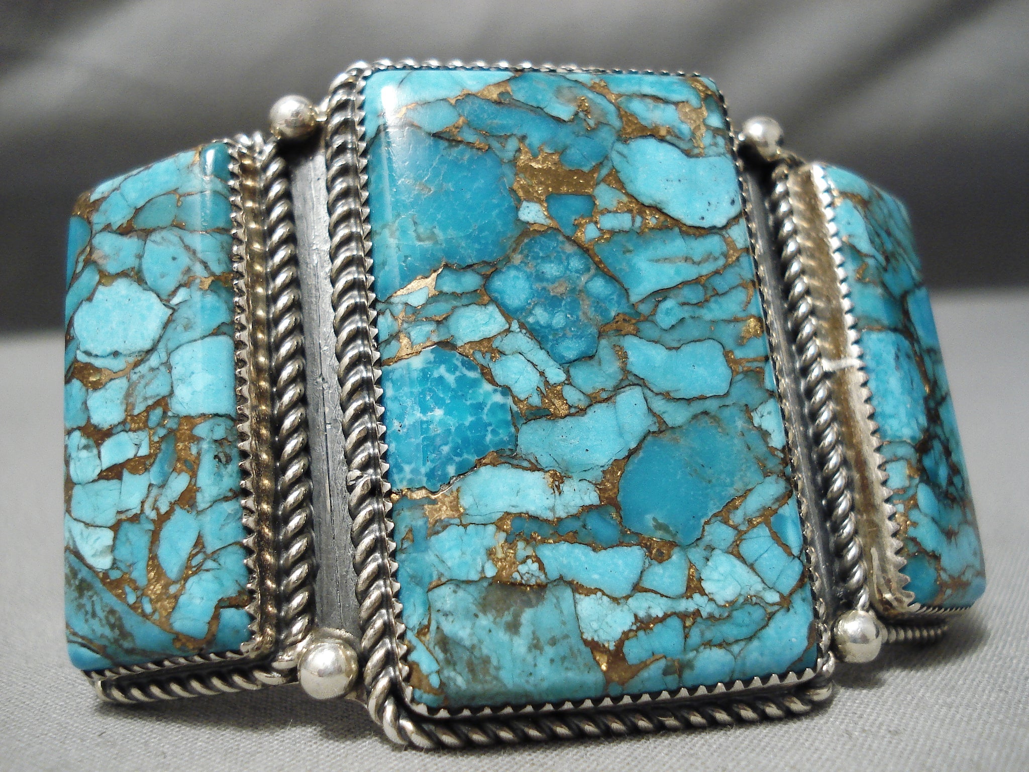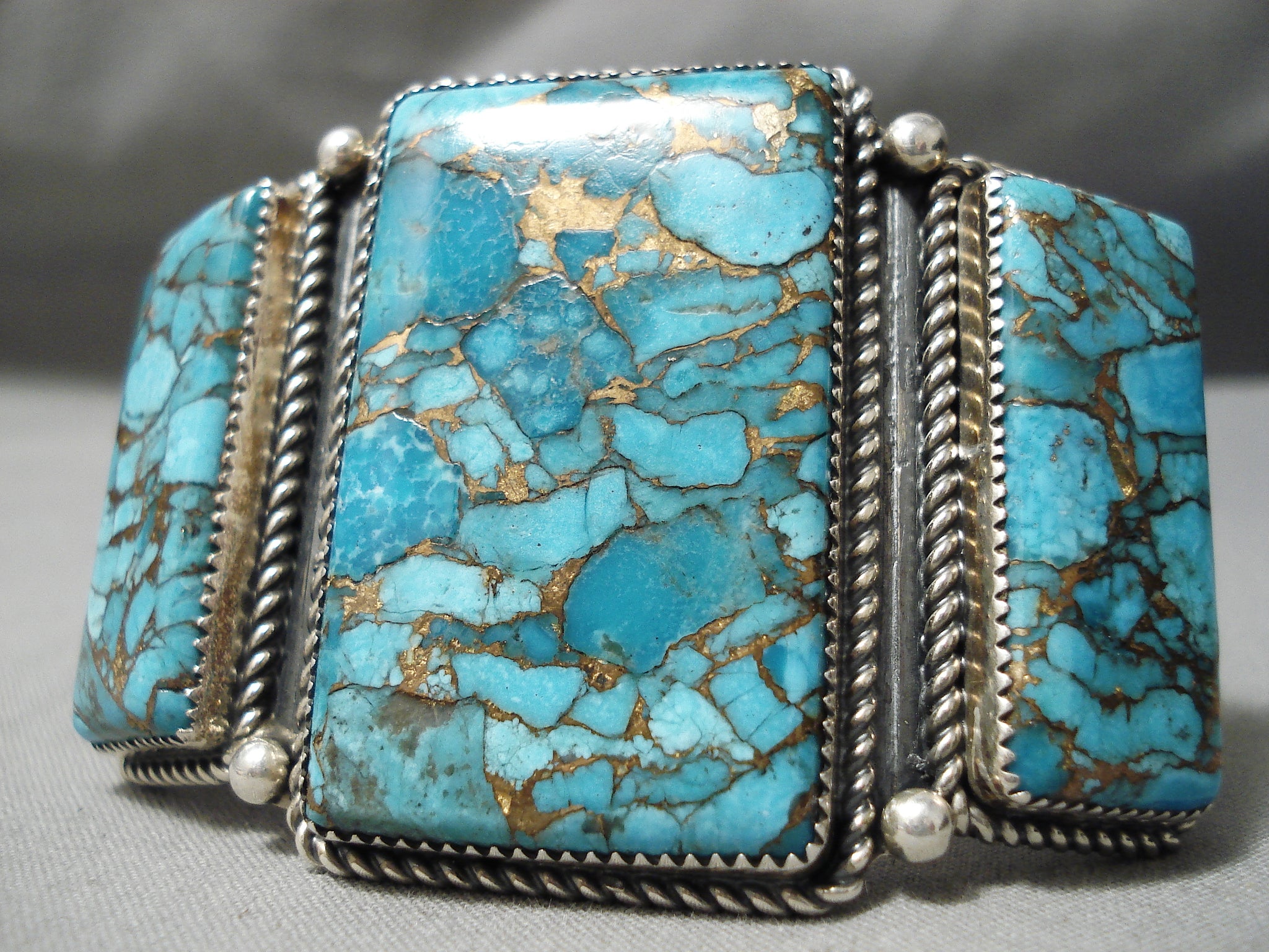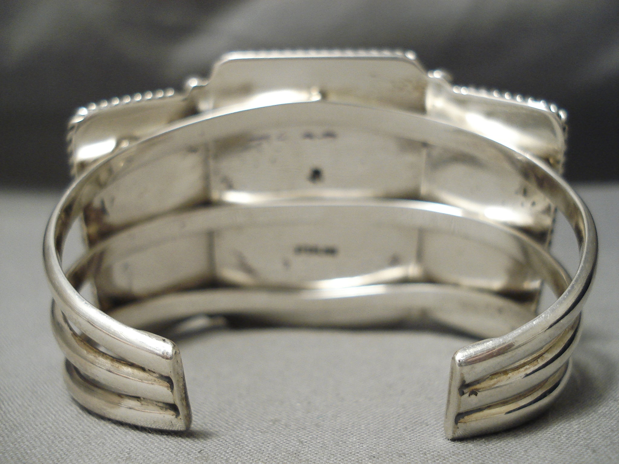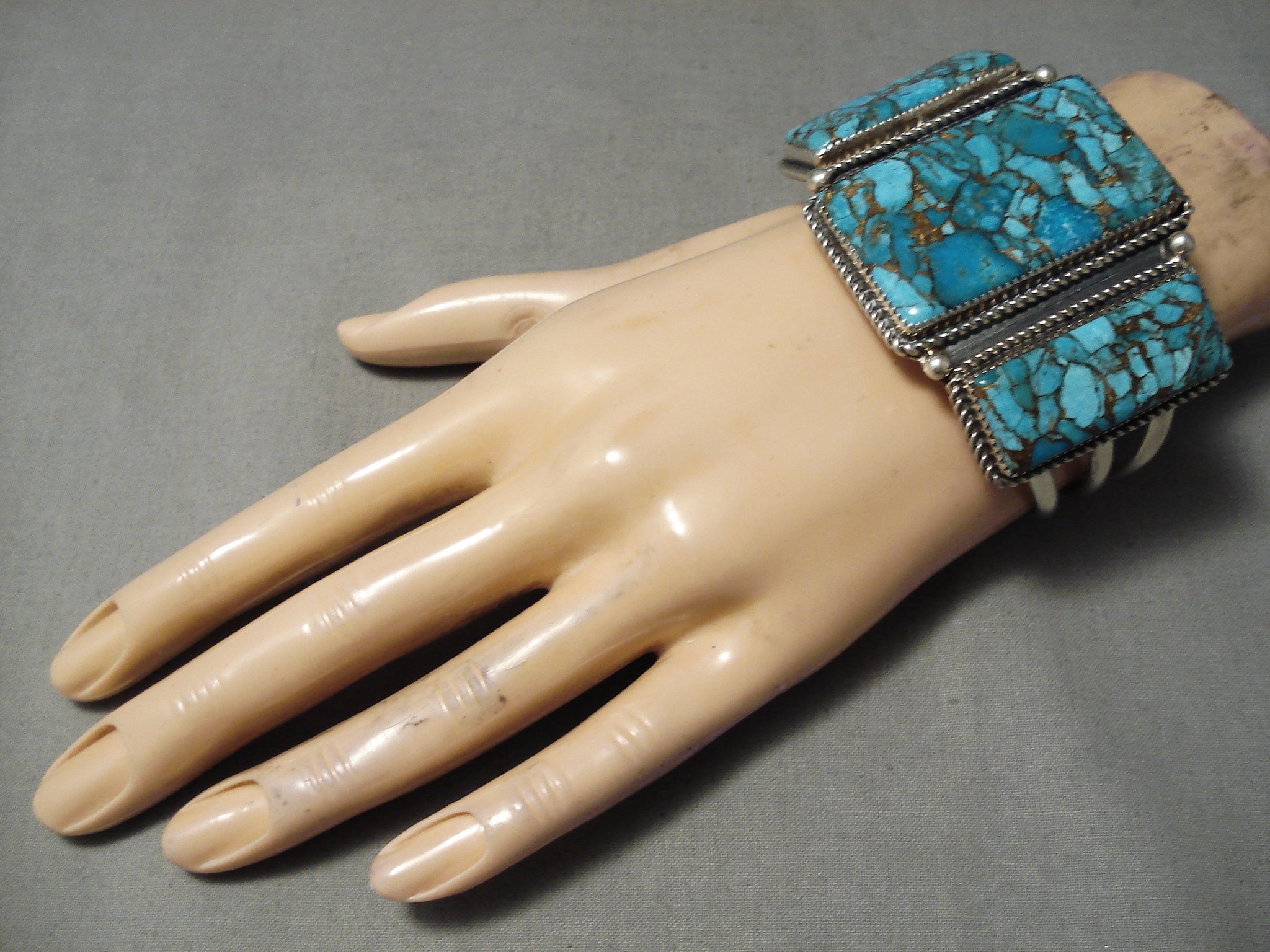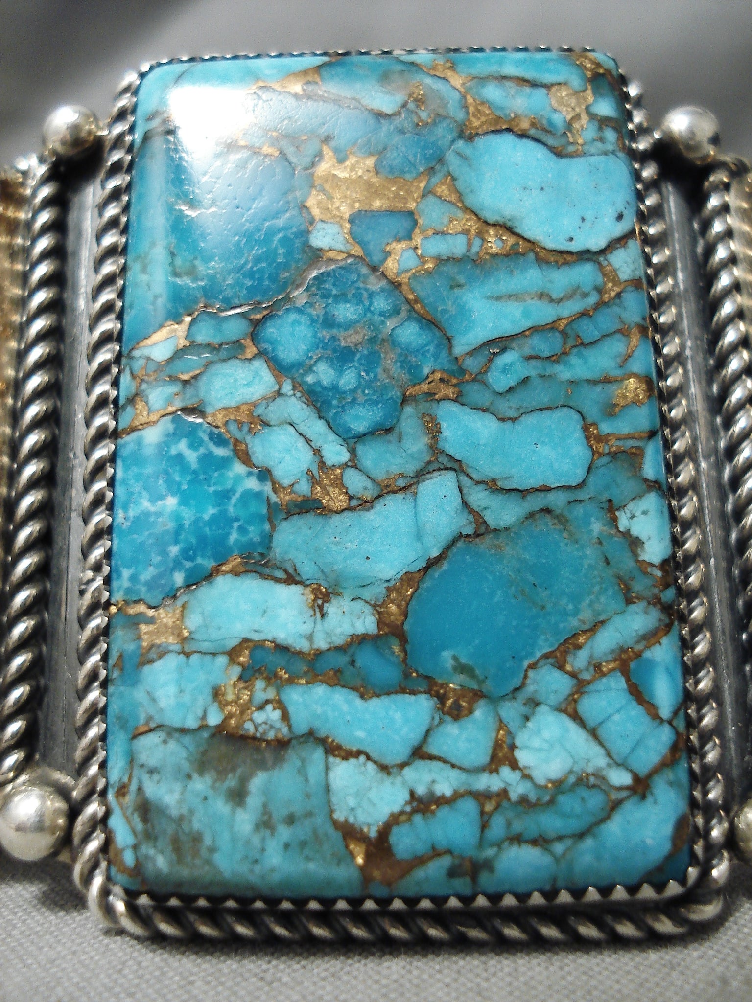 Vivid Huge Vintage Native American Navajo Squared Turquoise Sterling Silver Bracelet Old