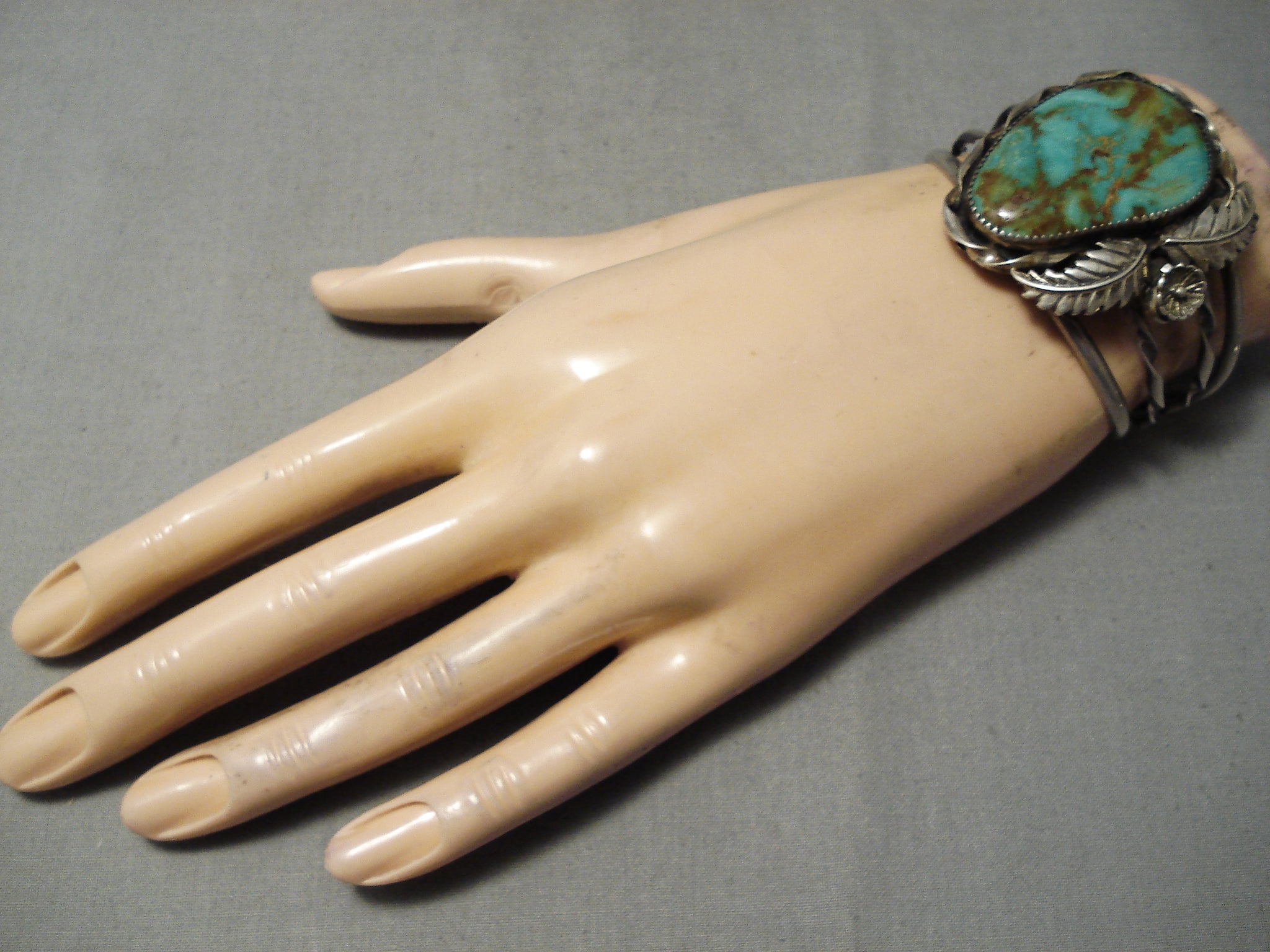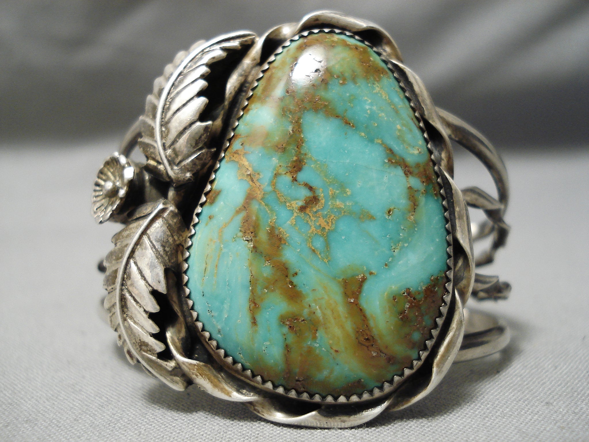 Vivid Natural Green Vintage Native American Navajo Royston Turquoise Sterling Silver Bracelet