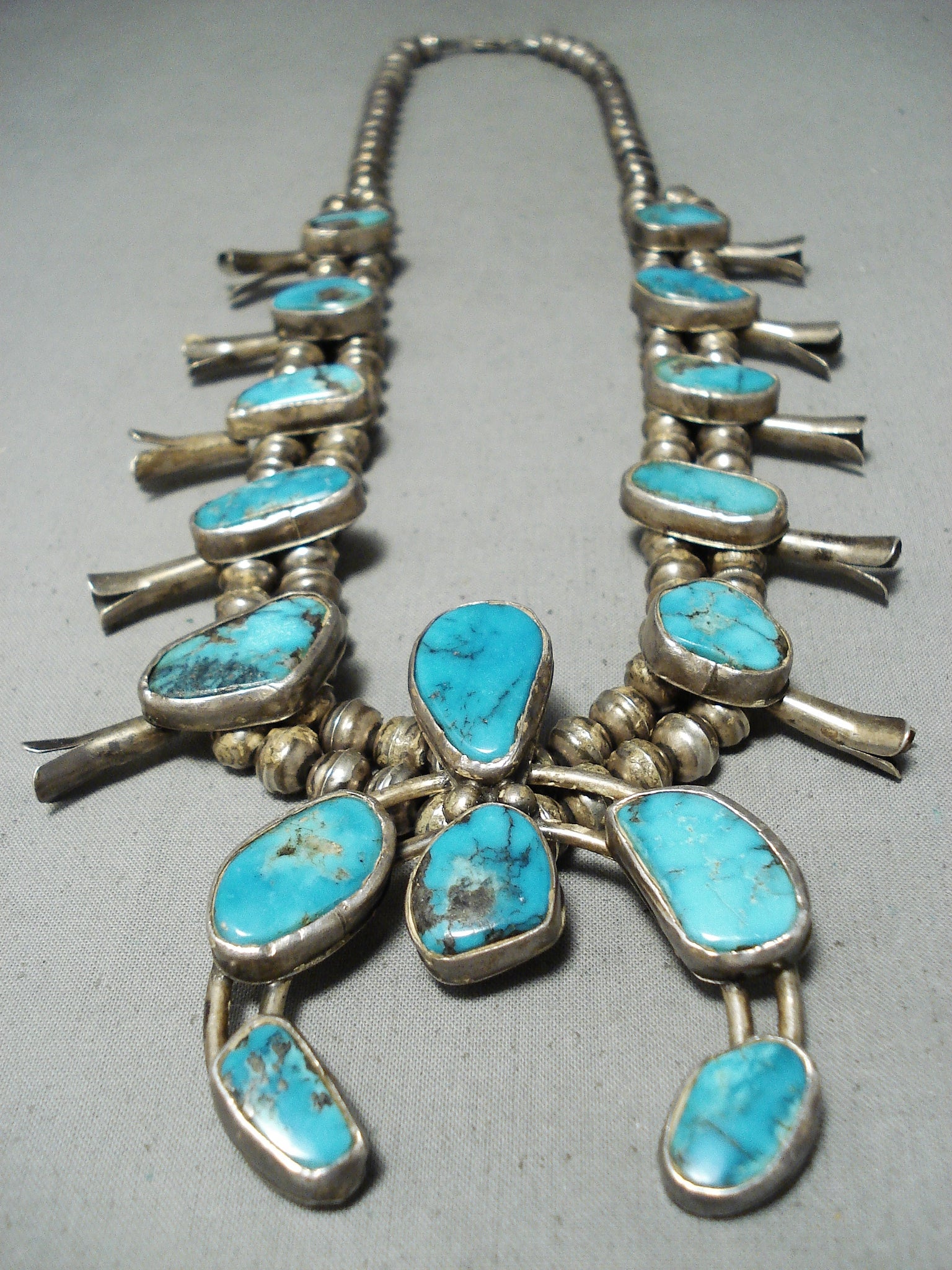 Women's Vintage Native American Navajo Morenci Turquoise Sterling Silver Squash Blossom Necklace