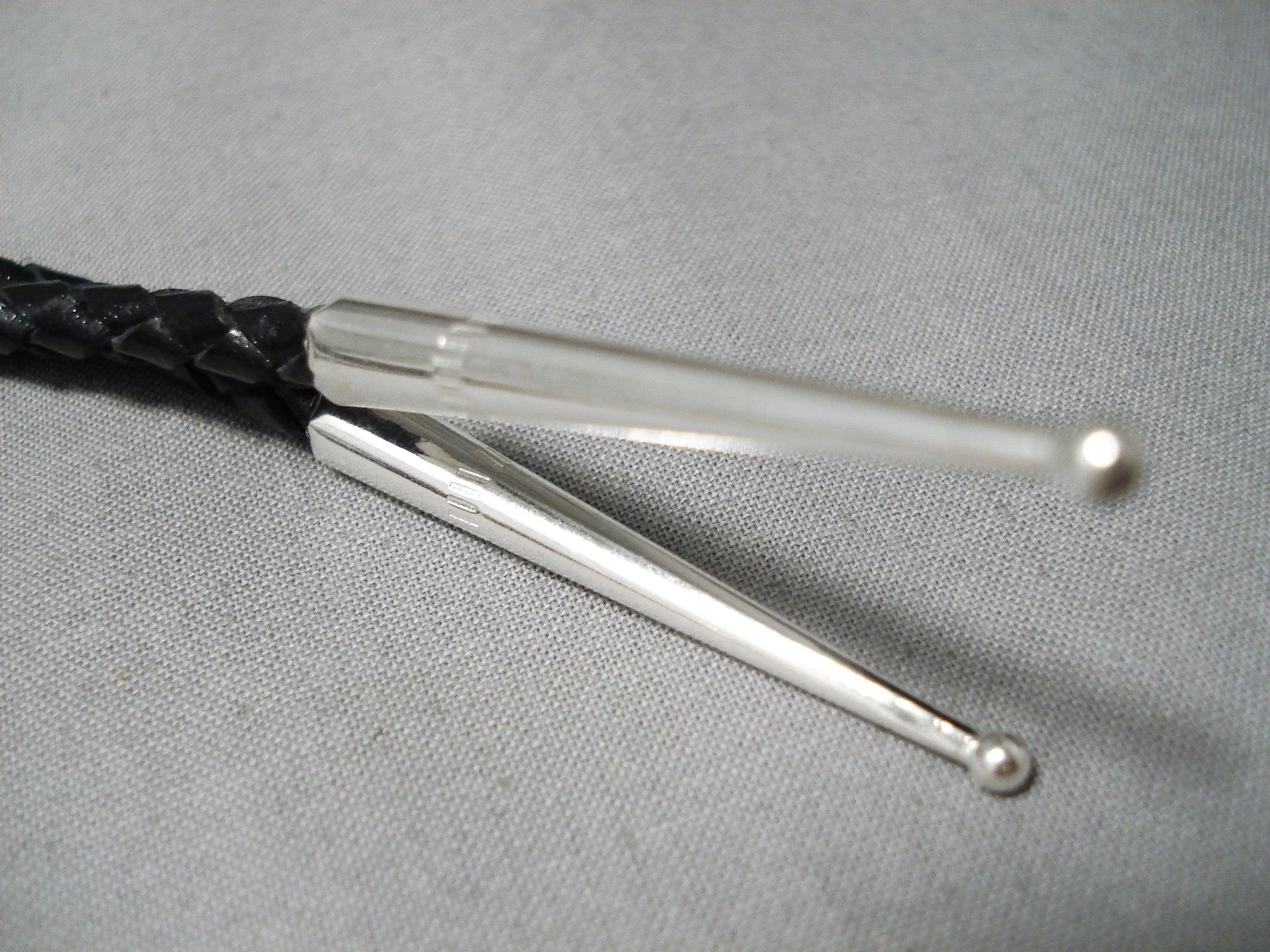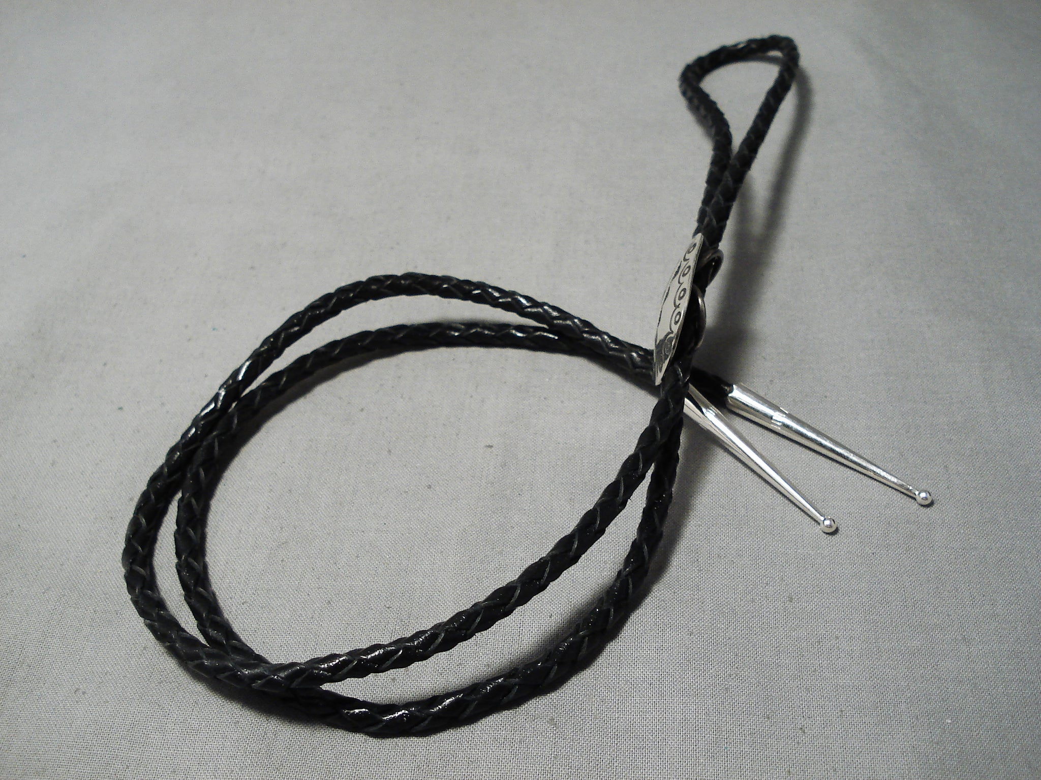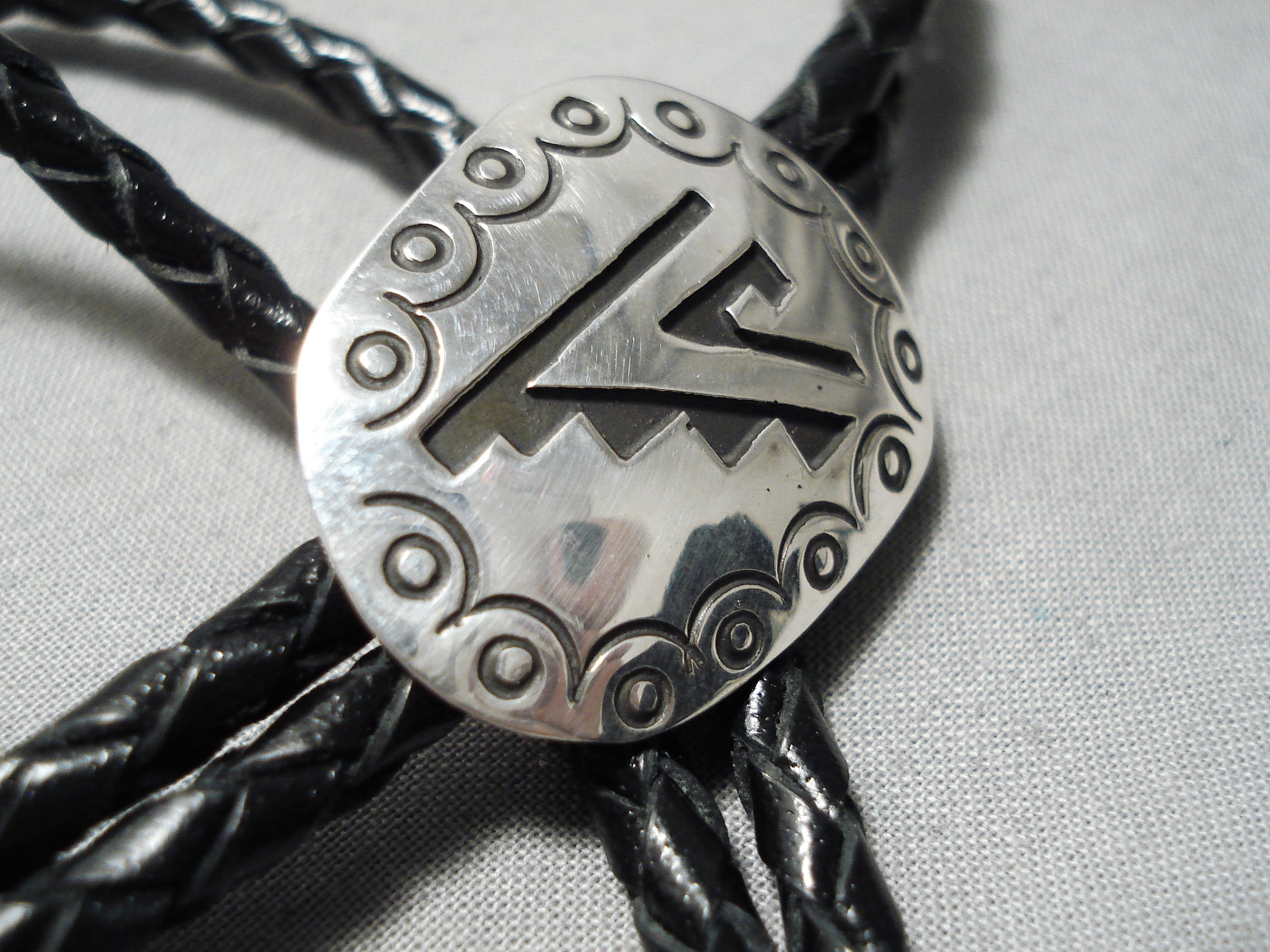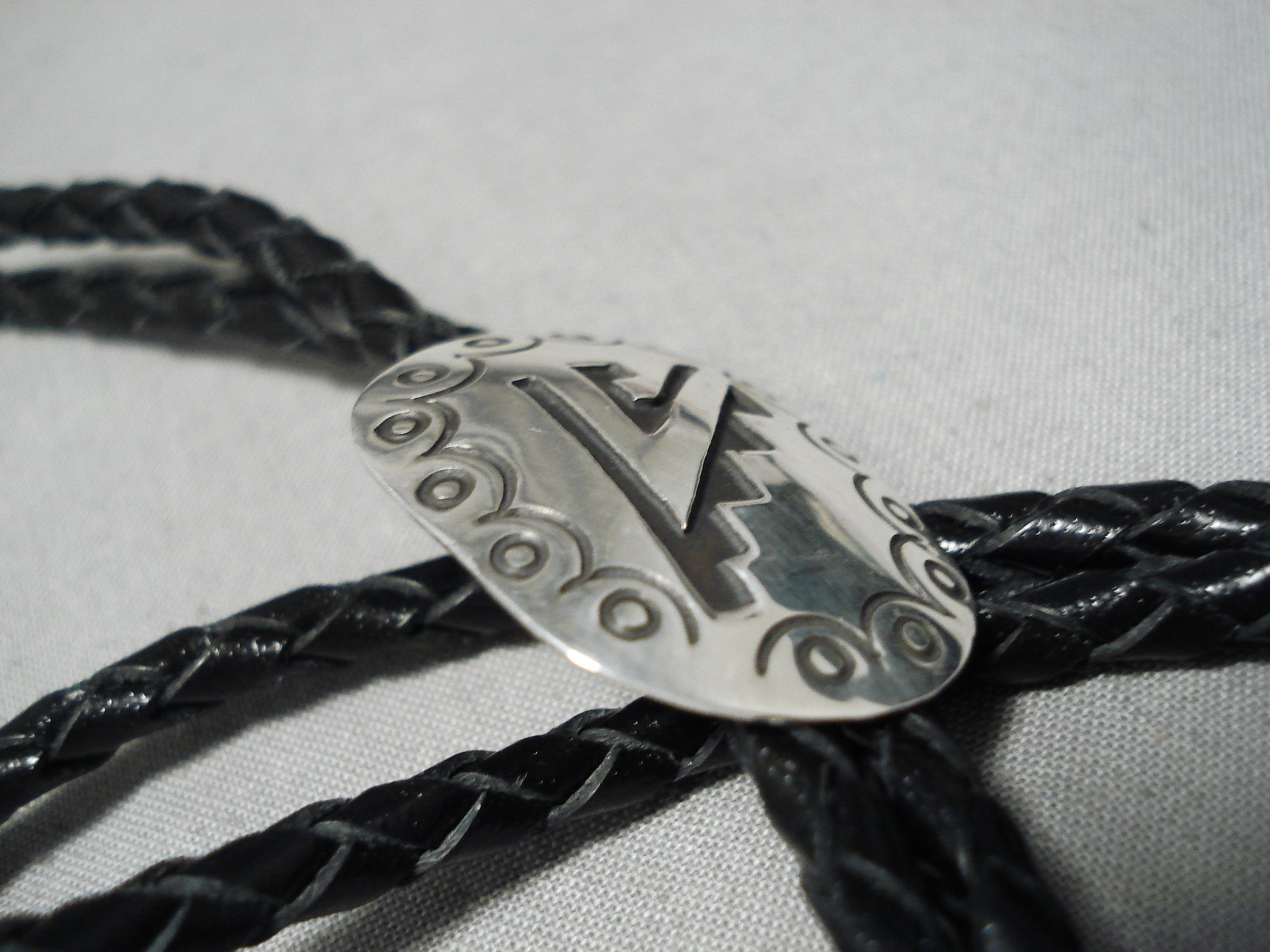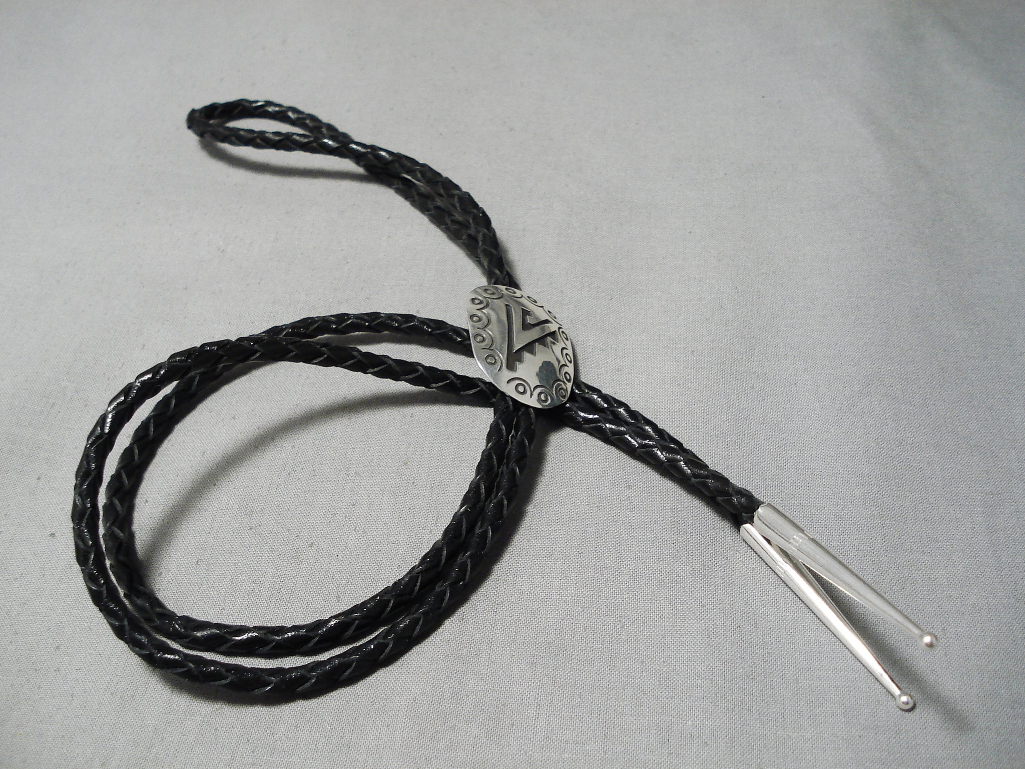 Up for sale is this marvelous Navajo silver bolo having a handcarved convex silver oval with silver handcarved rug designs! The bolo has a black leather handbraided tie with handcarved silver pins! Simply Amazing! The tie length is about 38" and the silver pins measure around 1-5/8" x 1/4". Signed by Navajo artist, T. Billy. Sterling silver, marked. The bolo measures around 1-1/4" x 1". Sturdy 20 grams. Cir mid to late century.