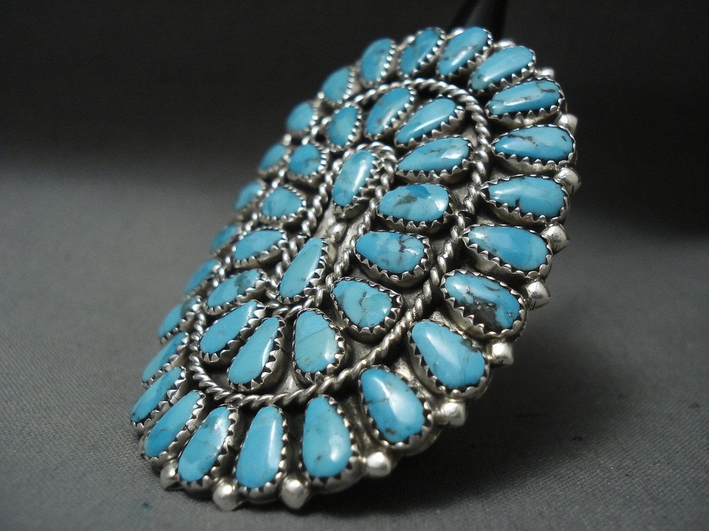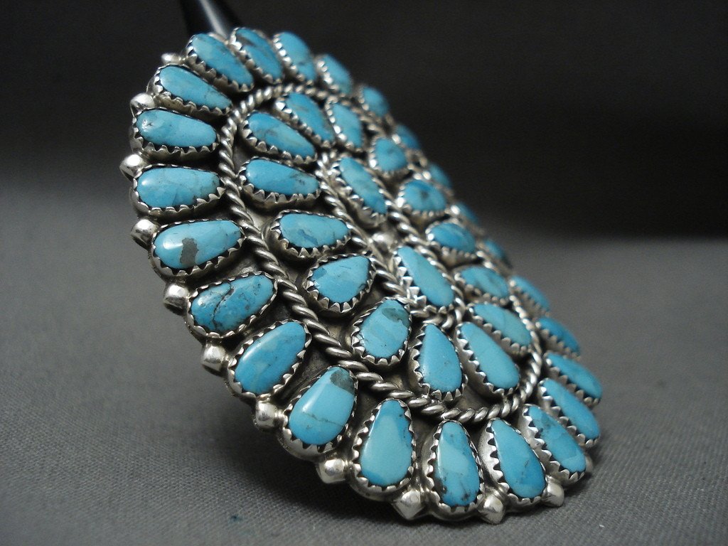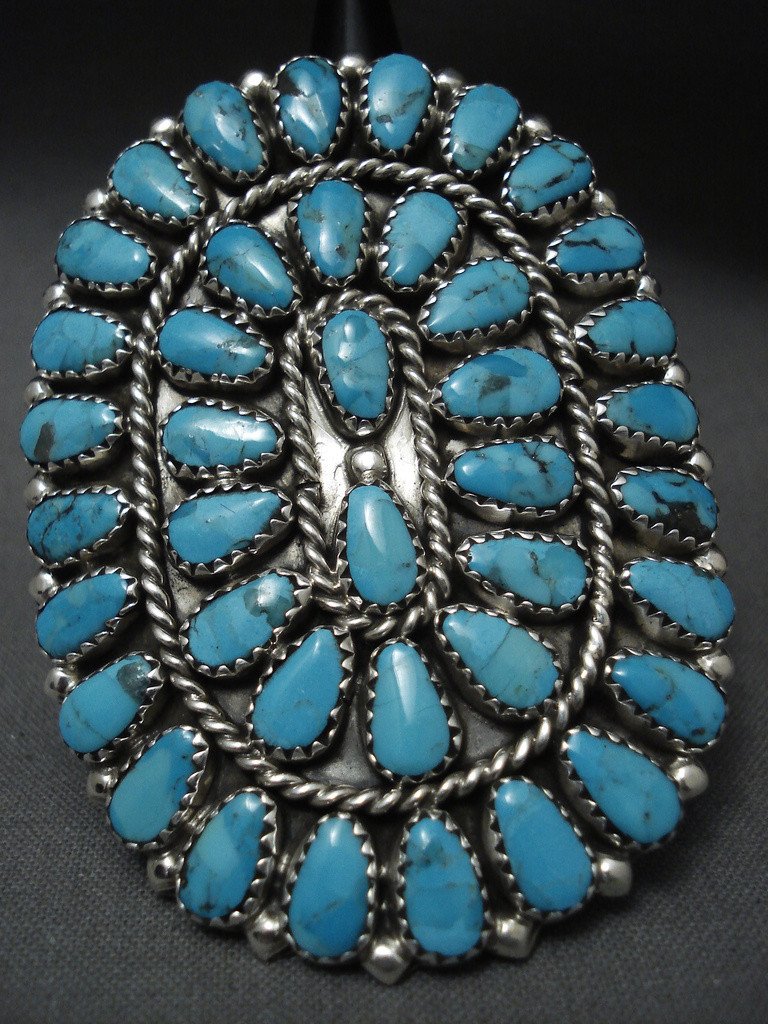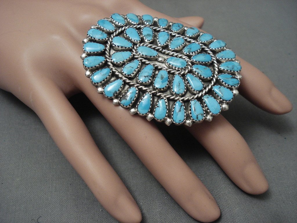 This is an impressive modernistic Navajo Native American jewelry Native American jewelry huge silver ring being one of the largest cluster rings we have seen. The ring contains a remarkable collection of teardrop shaped blue turquoise stones. Accenting the stones are wonderufl silver raindrops and ropes. This ring includes a double silver shank that measures to be a size 10 but can be resized if needed. The stones measure around 3/8" x 3/16". The ring face measures around 2-3/8" x 1-7/8". Signed by Navajo Native American jewelry Native American jewelry artist, Ray Tafoya . Sterling silver, marked. Sturdy 20 grams. LAYAWAYS- We are happy to work with you and are more flexible than anyone on the net. Simply send us an email for more information.